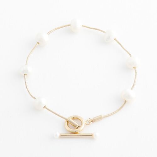 同シリーズのネックレスと形状、使用がよく似たブレスレットです。 留め具はマンテルパーツを使用。 引っ掛けてお留めいただけるため片手で簡単な着脱。 スネークチェーンに淡水パールの境目をなくし、よりナチュラルな着け感を楽しんでいただけるように細部までこだわりました。