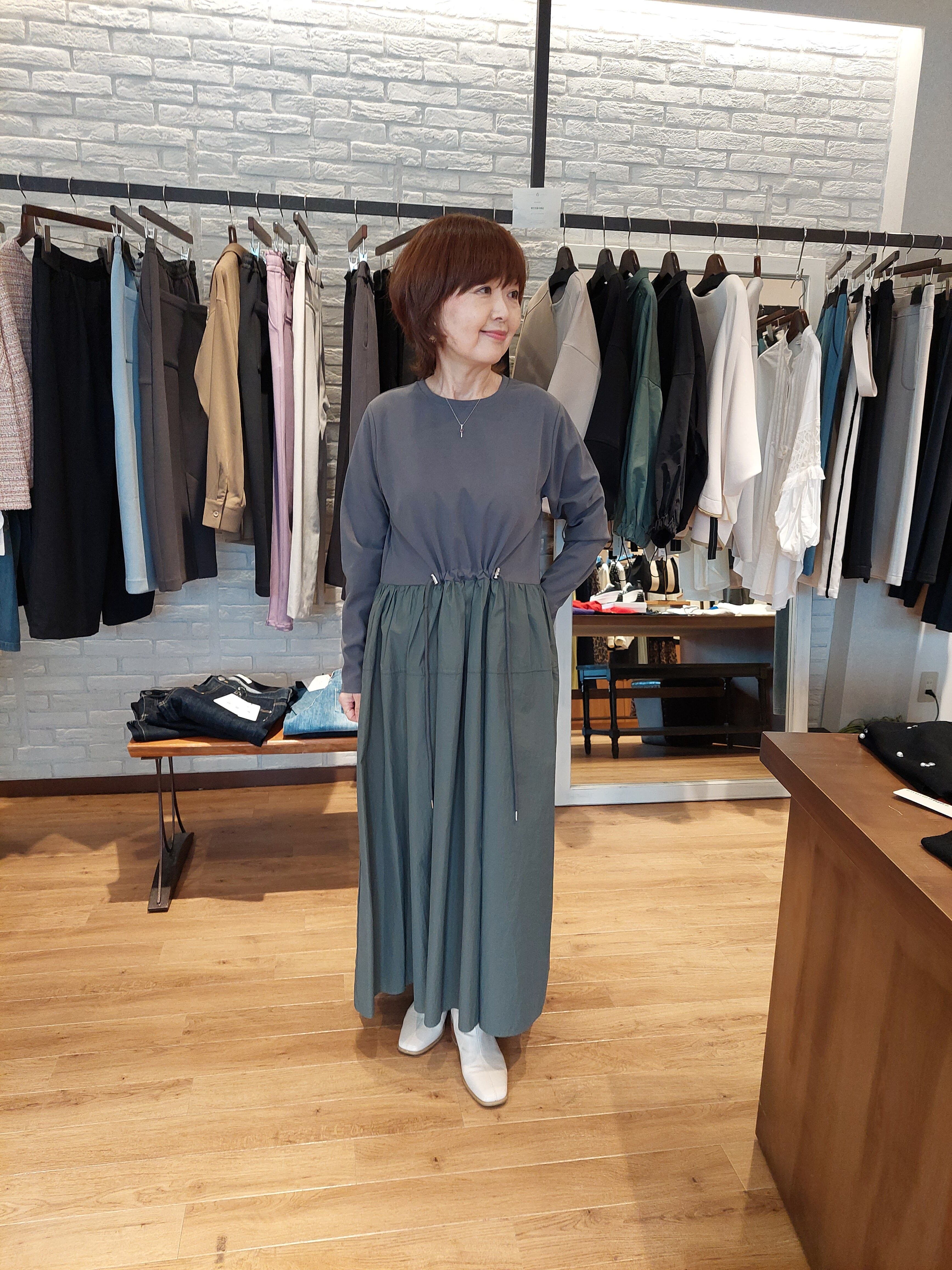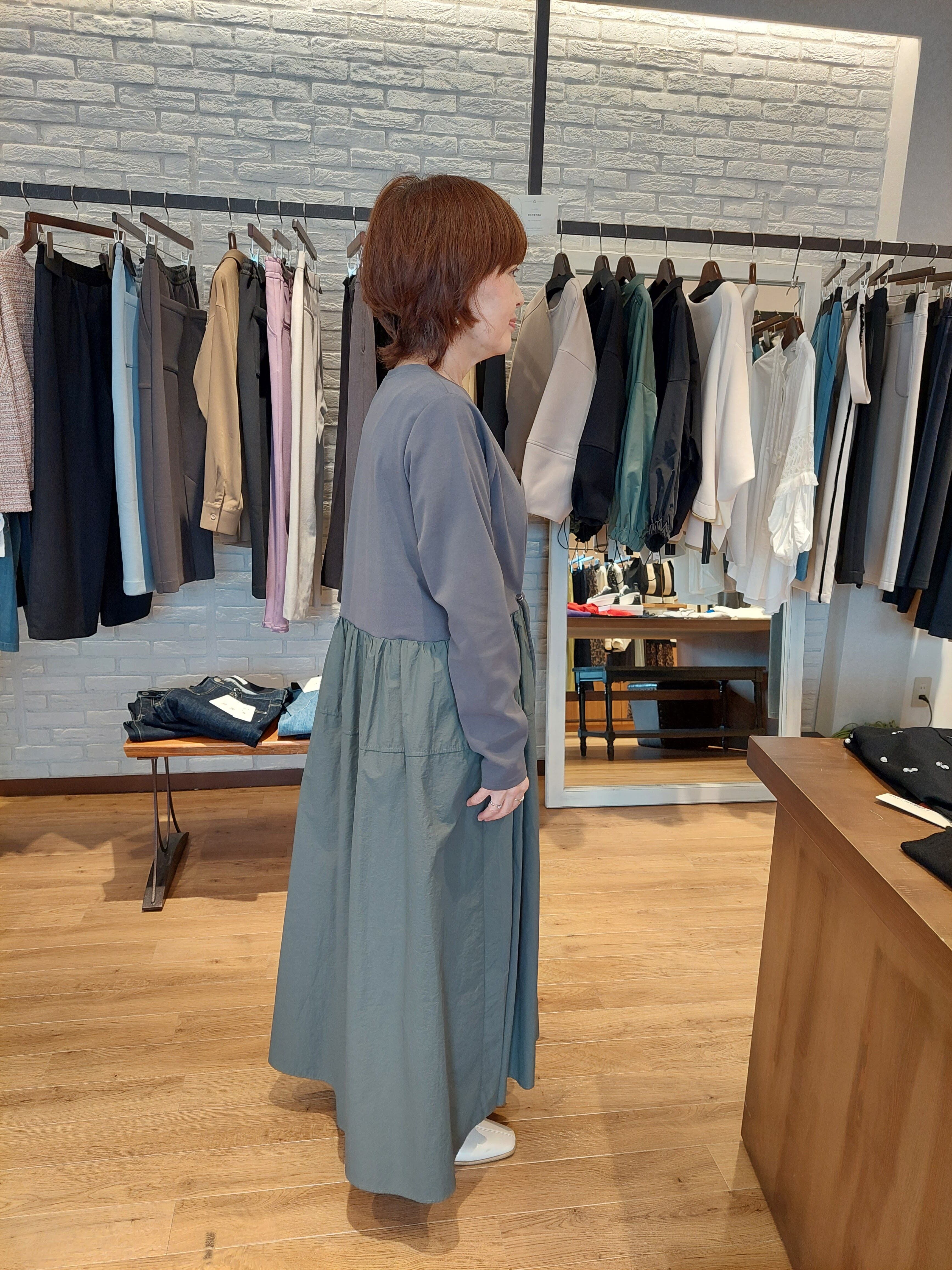 ジャージとタフタの異素材のコントラストが素敵なフワンピース。