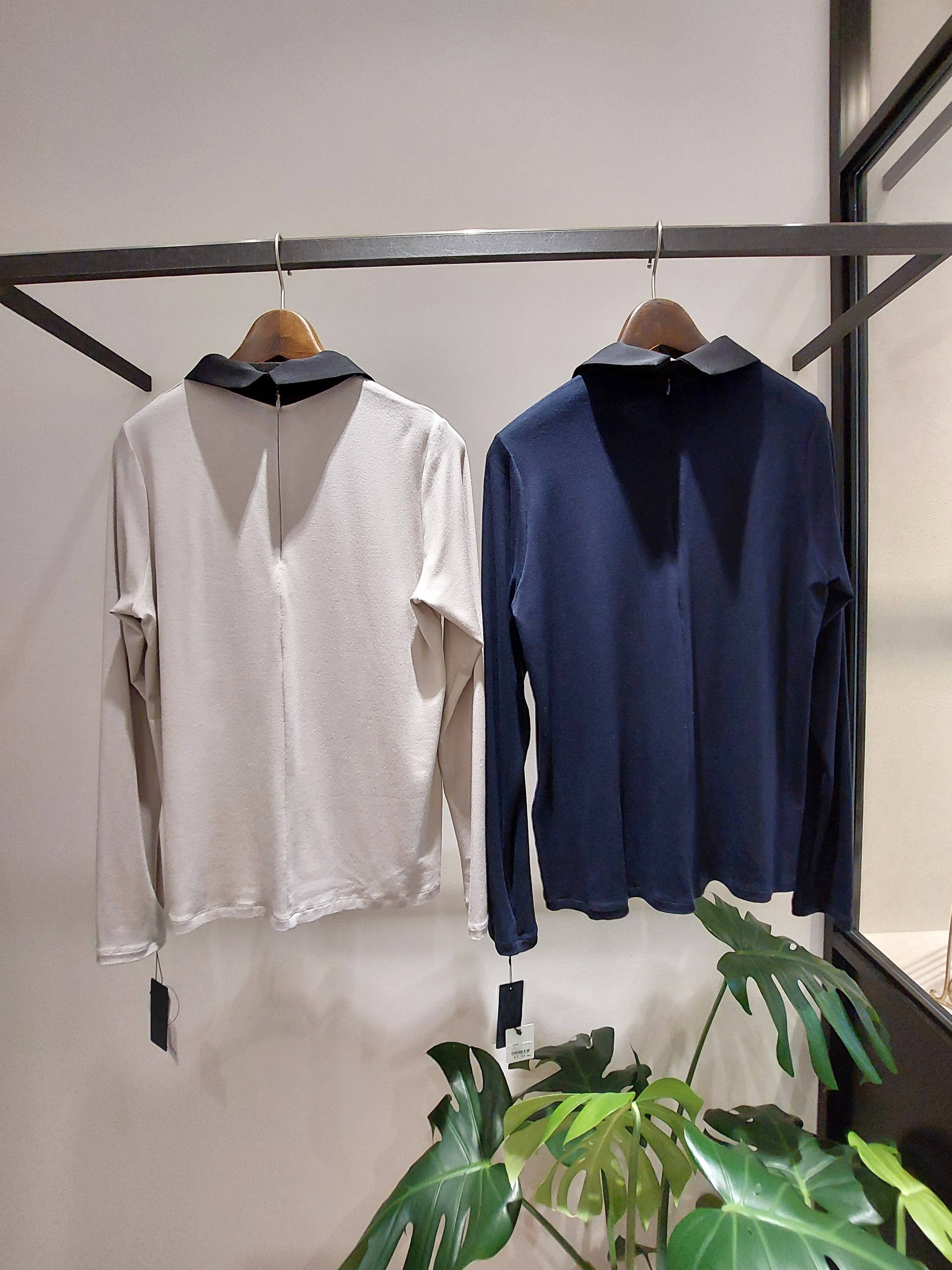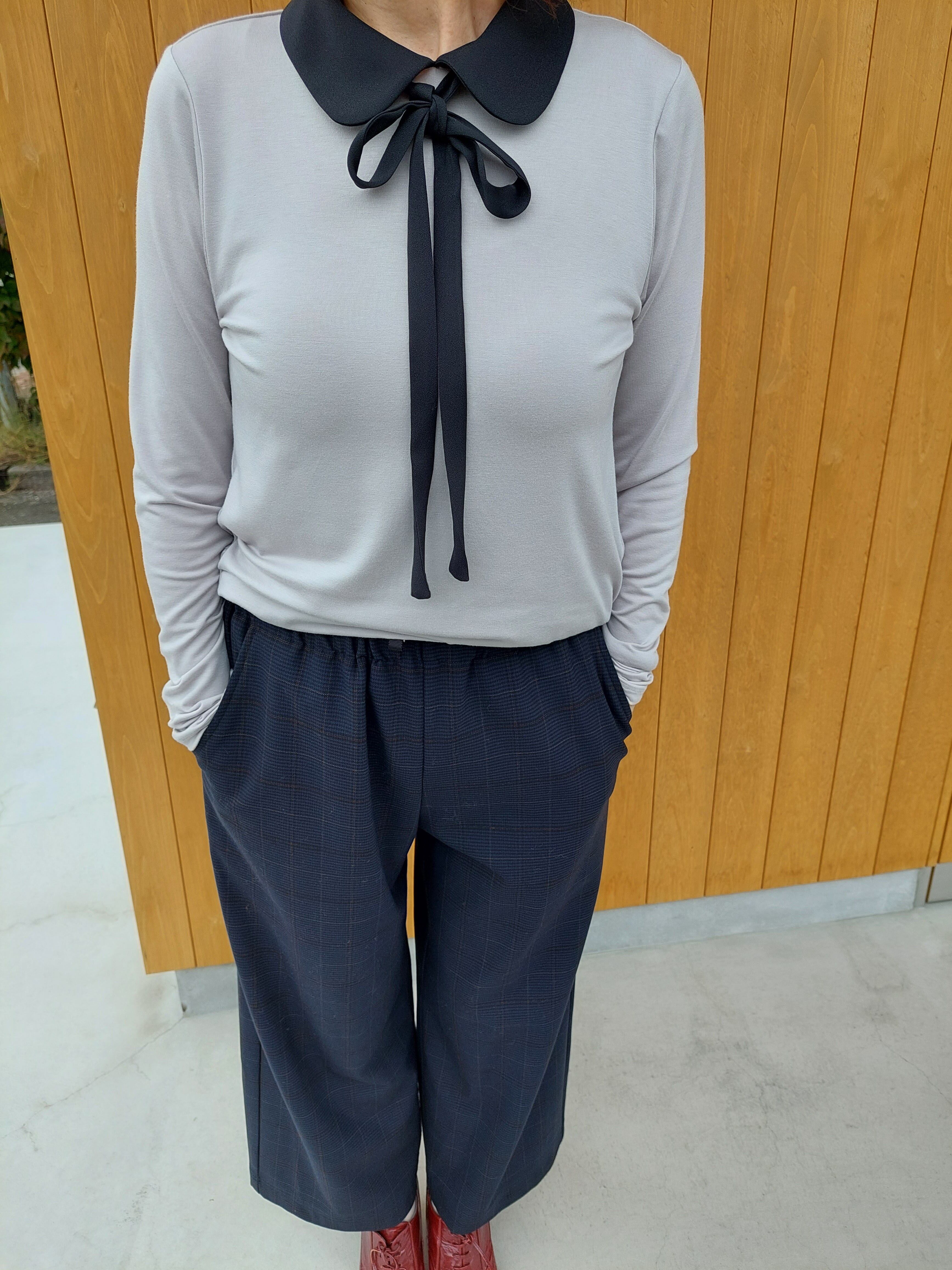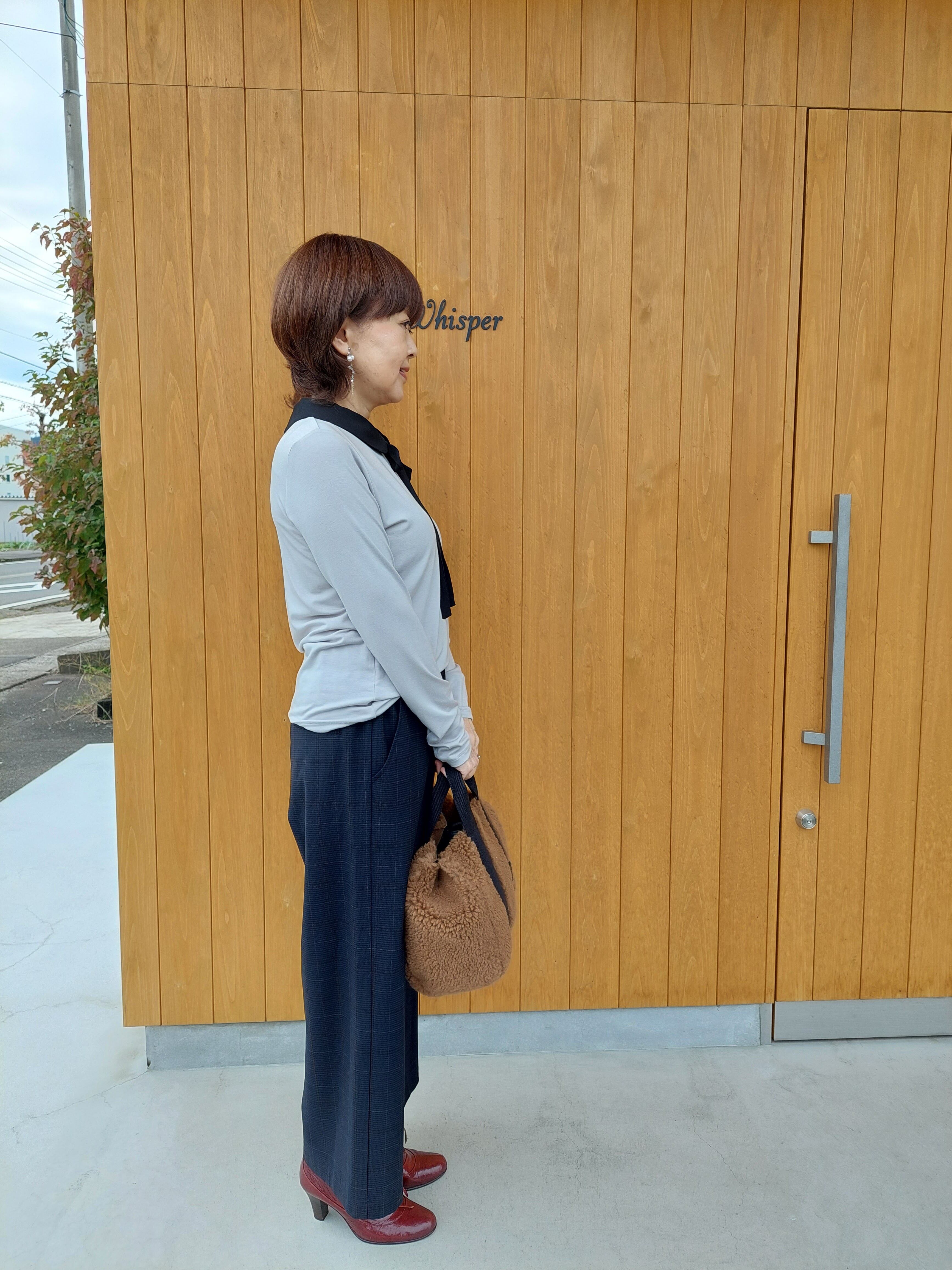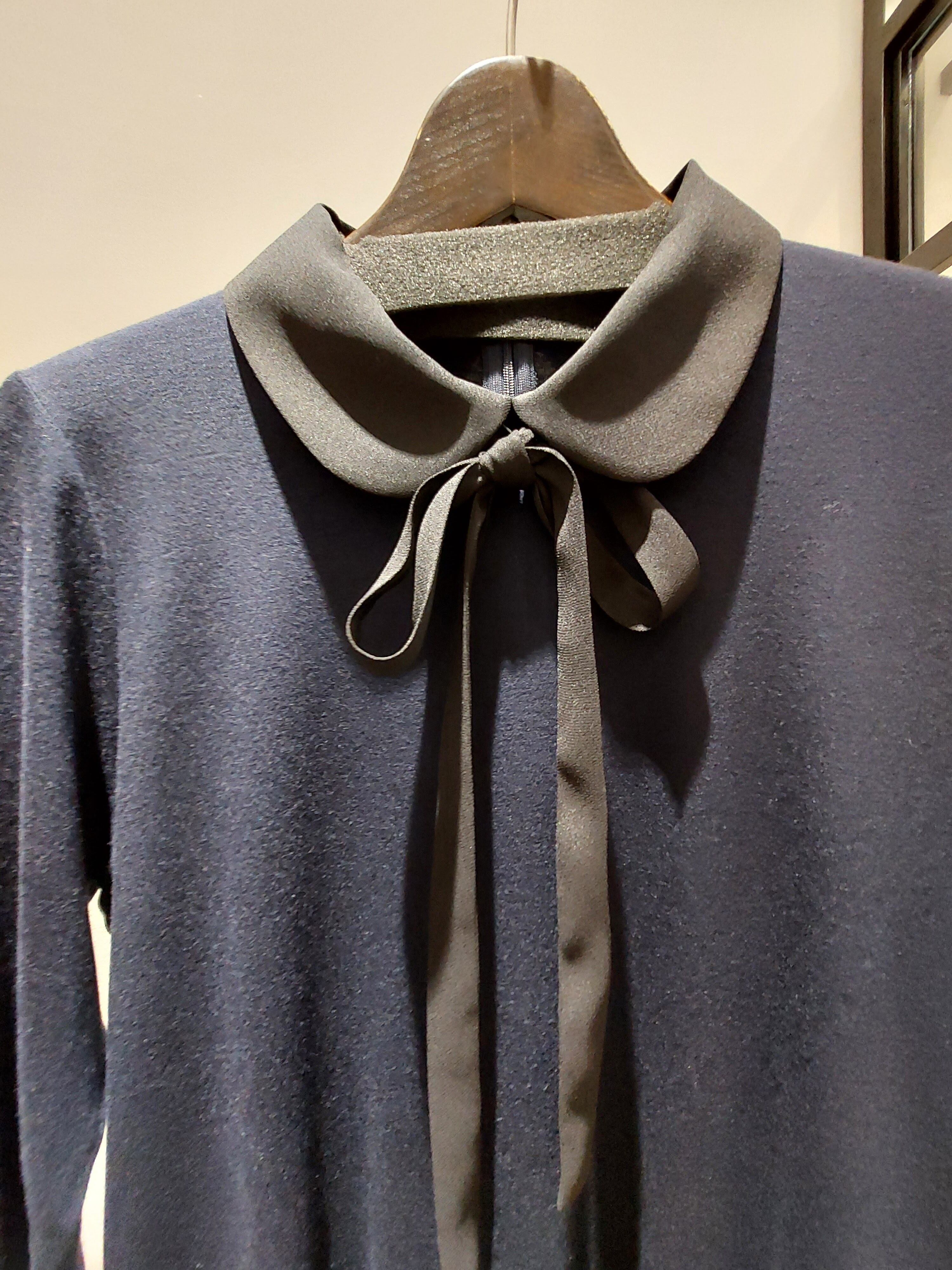 ジャケットのインナーとして合わせれば、丸衿とリボンが華やかさをプラスし、きちんと感のあるスタイルに。ボウタイを外せばシンプルに着られるので、オフィスからフォーマルシーンまで幅広く活躍します。