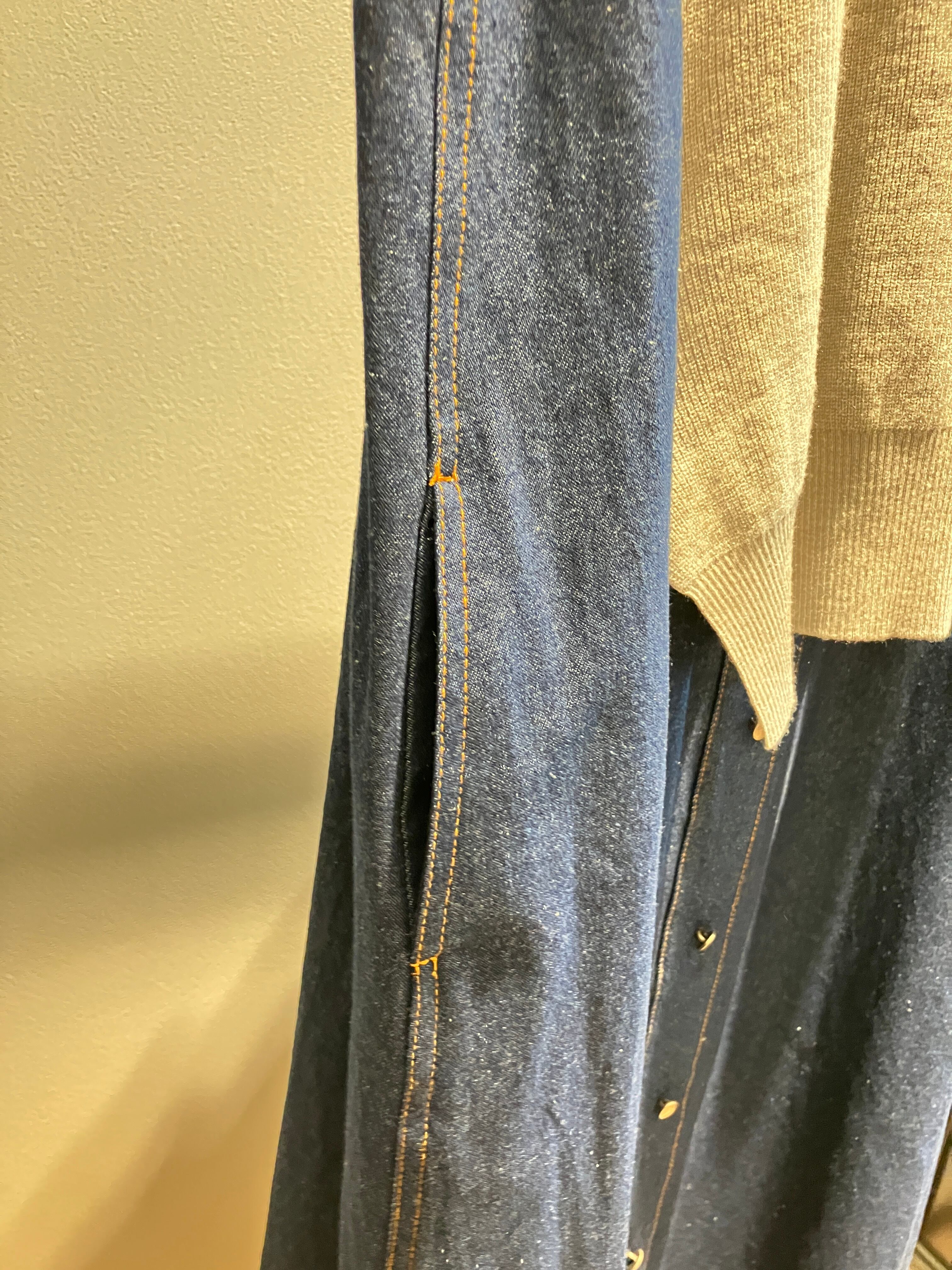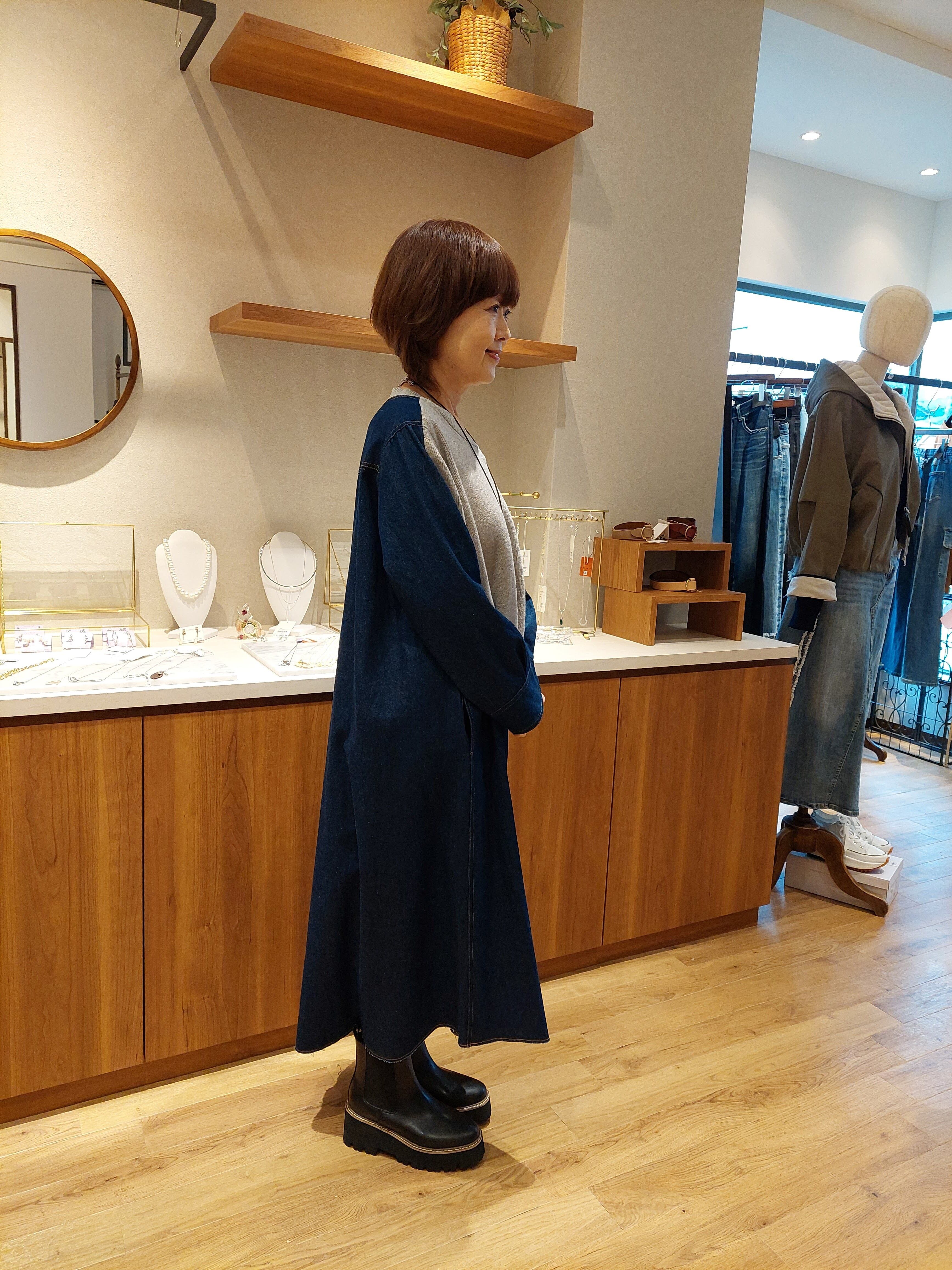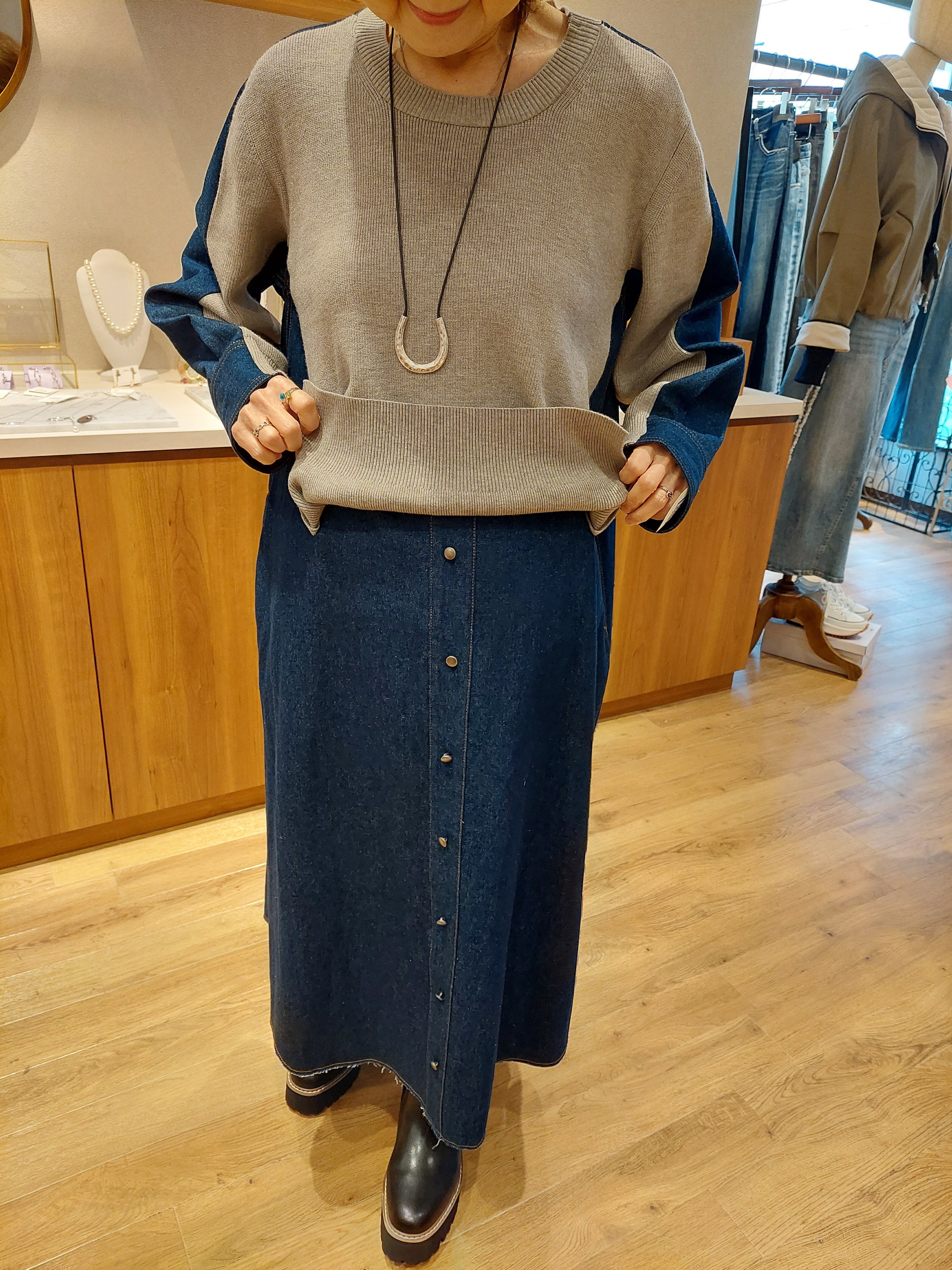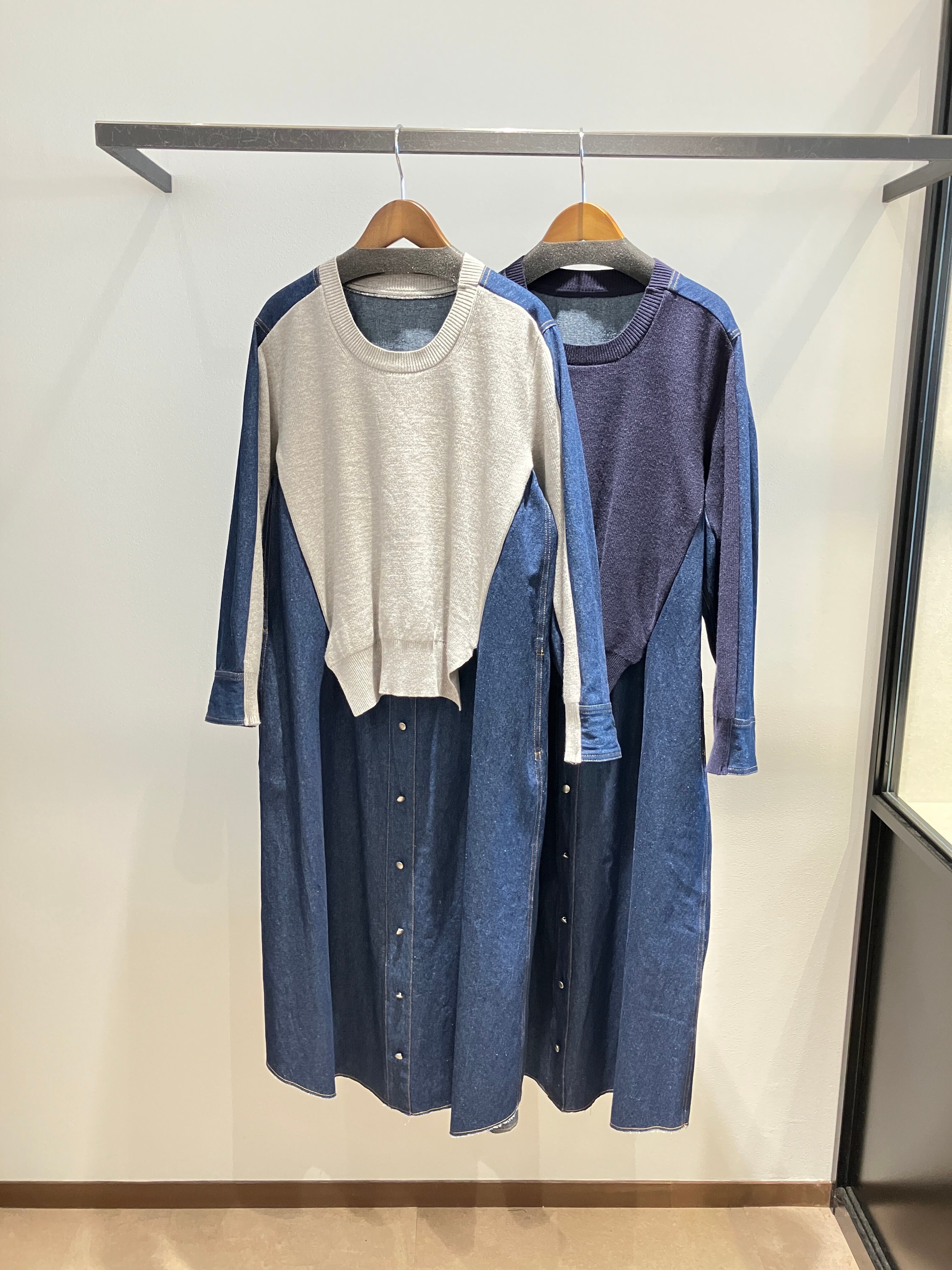 身頃から袖にかけてニットドッキングが施された異素材デニムワンピ。