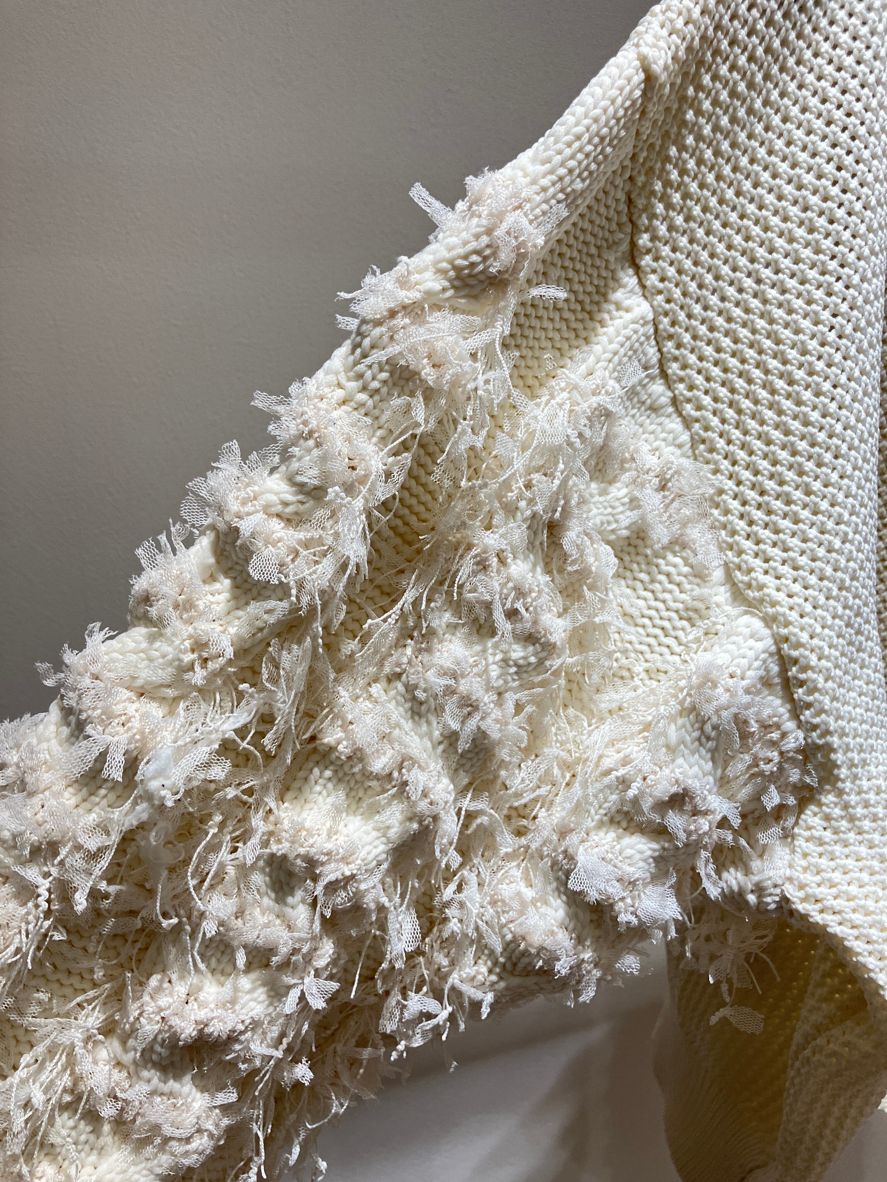 ざっくりした網目にチュールのフリンジ加工を施したカーディガン。クルーネックの上品な首元が特徴で、前を開けて羽織としても、閉じてプルオーバー風にも着用可能。存在感のある袖のデザインがコーデの主役に。程よい丈感でボトムスを選ばず、スタイリングしやすい一枚です。