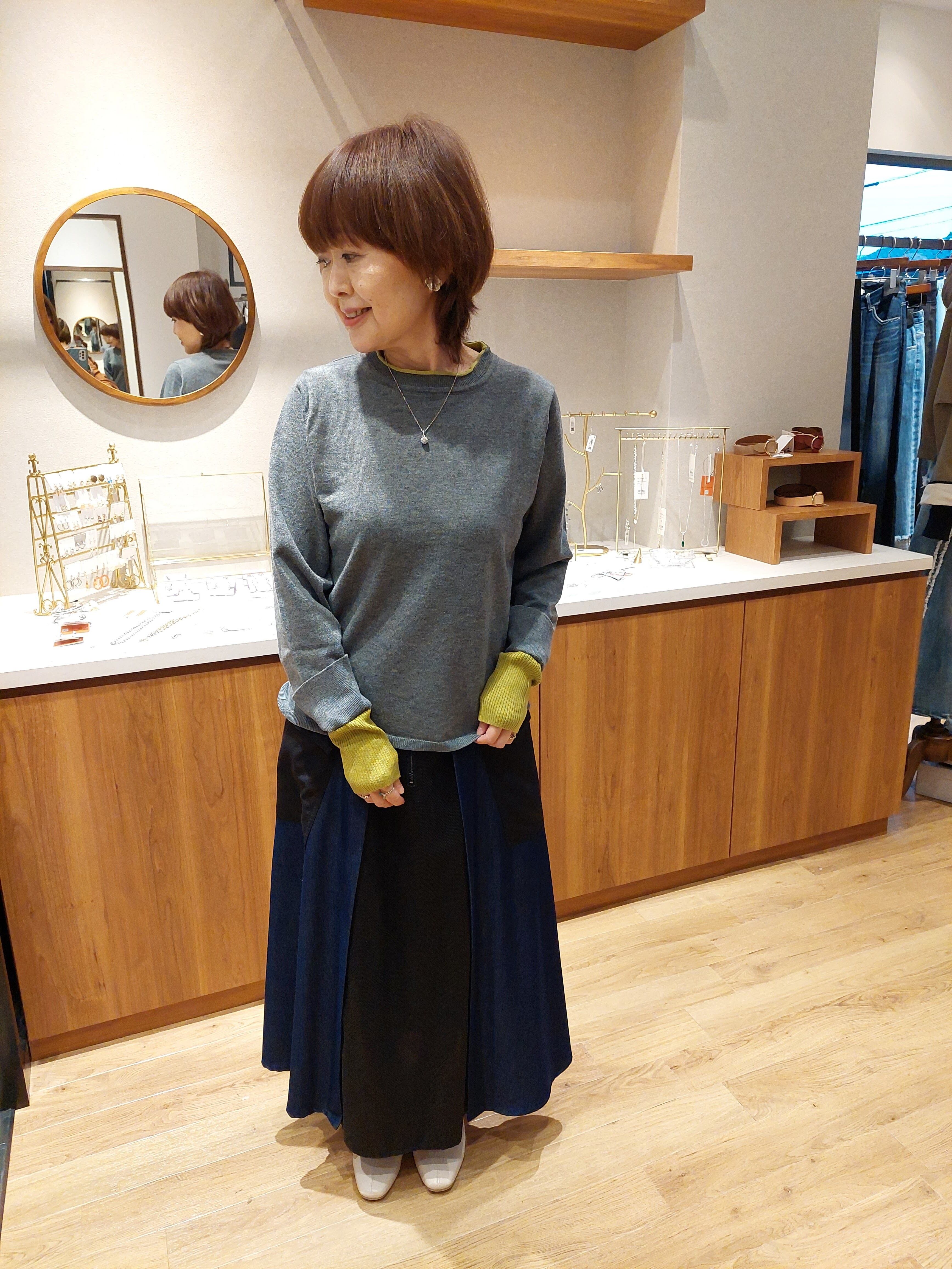 ベーシックなクルーネックニットながらもバイカラーの差し色が光る