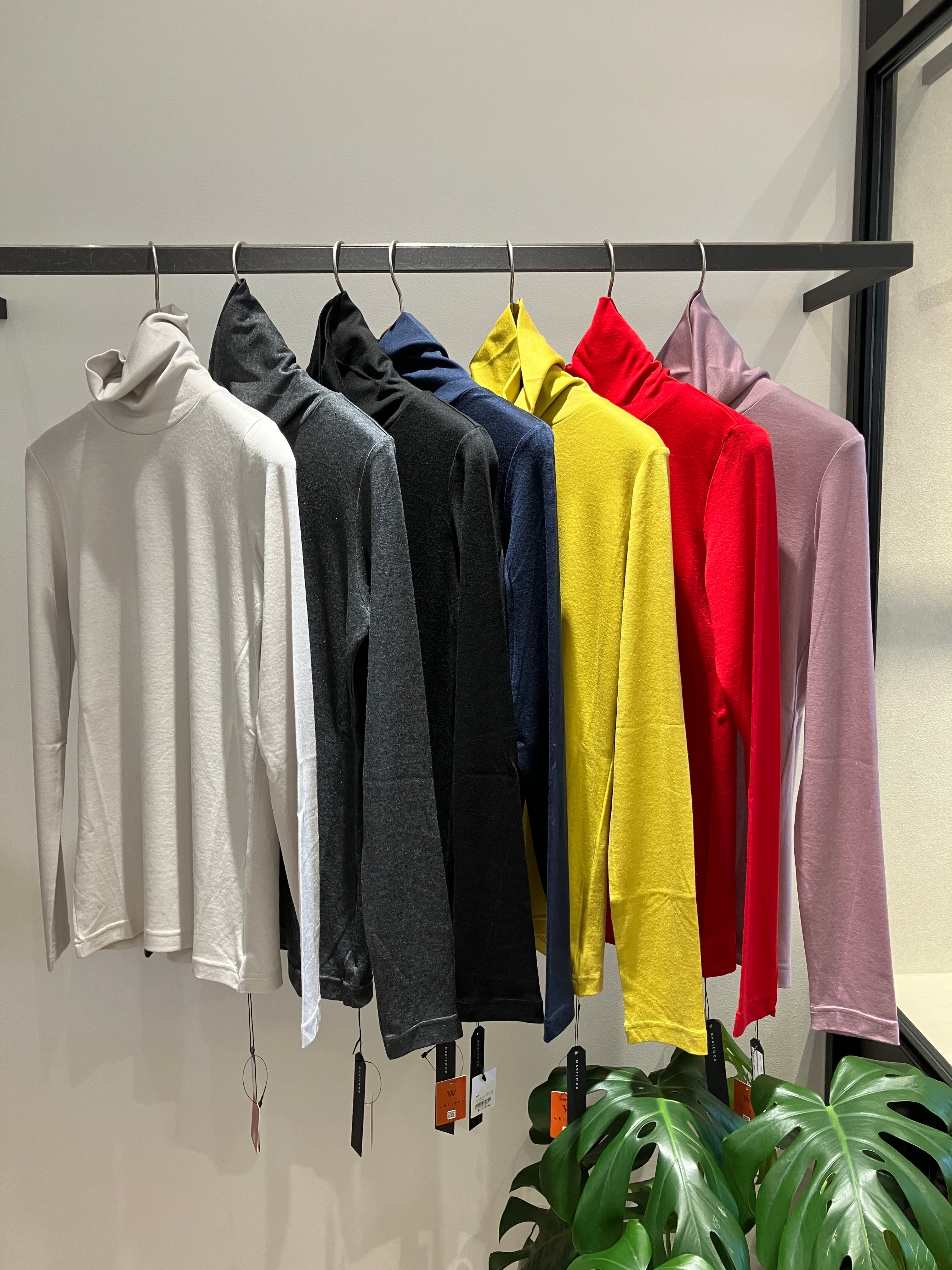 伸縮性があり、首元はタートルネックでインナーにもピッタリのアイテム。