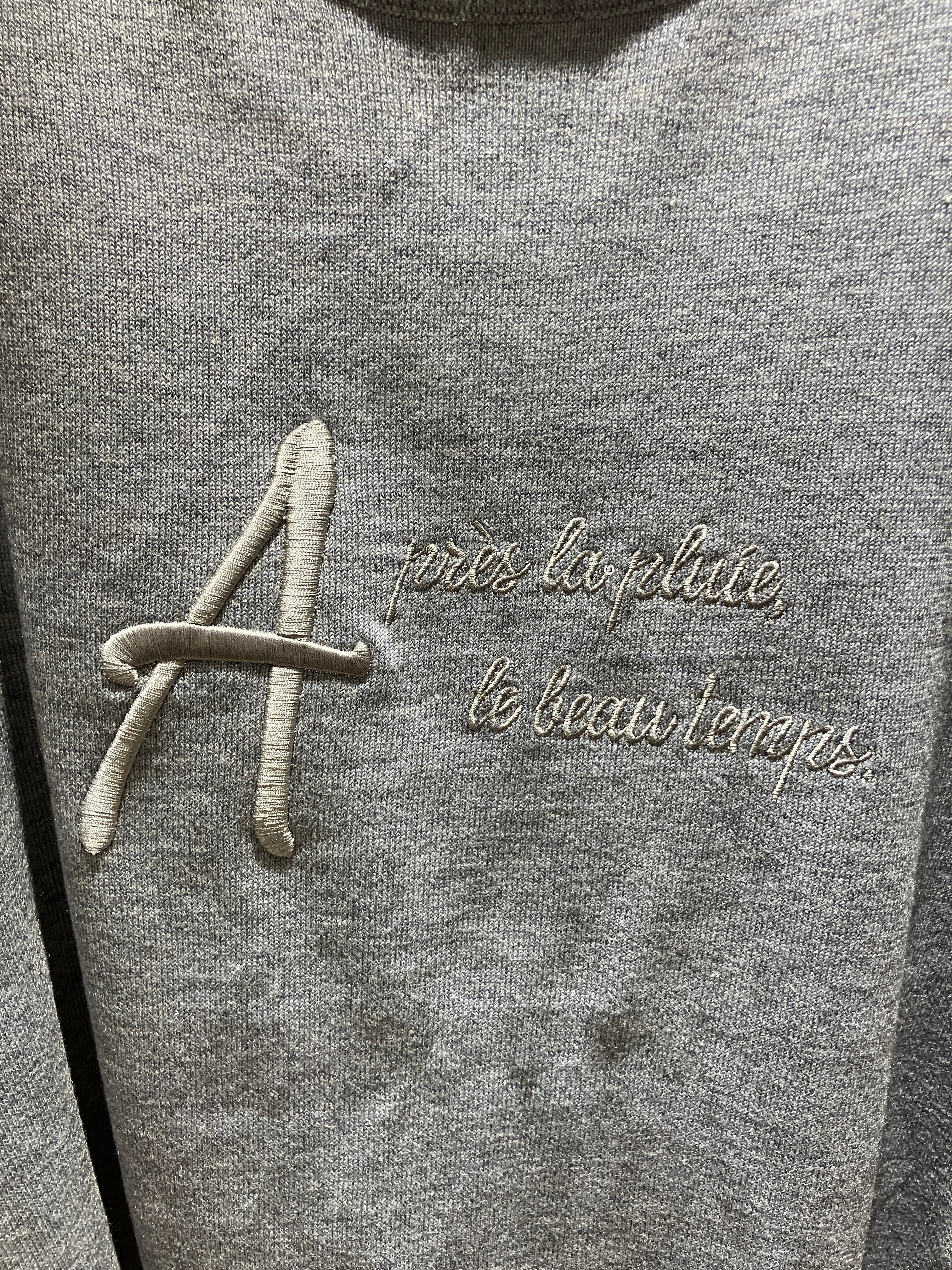 身頃に同色同色系の刺繍ロゴが施されているニットプルオーバー。