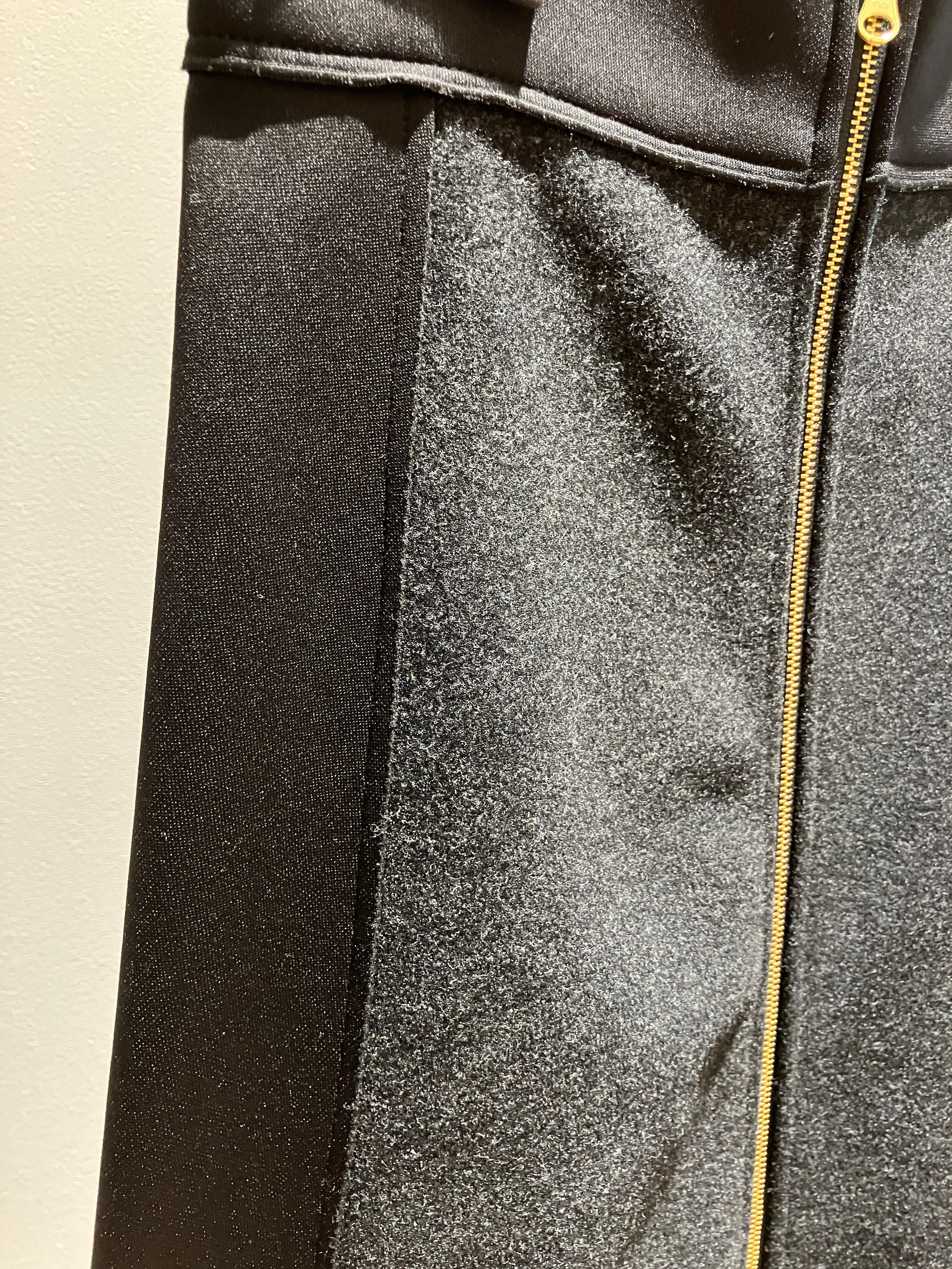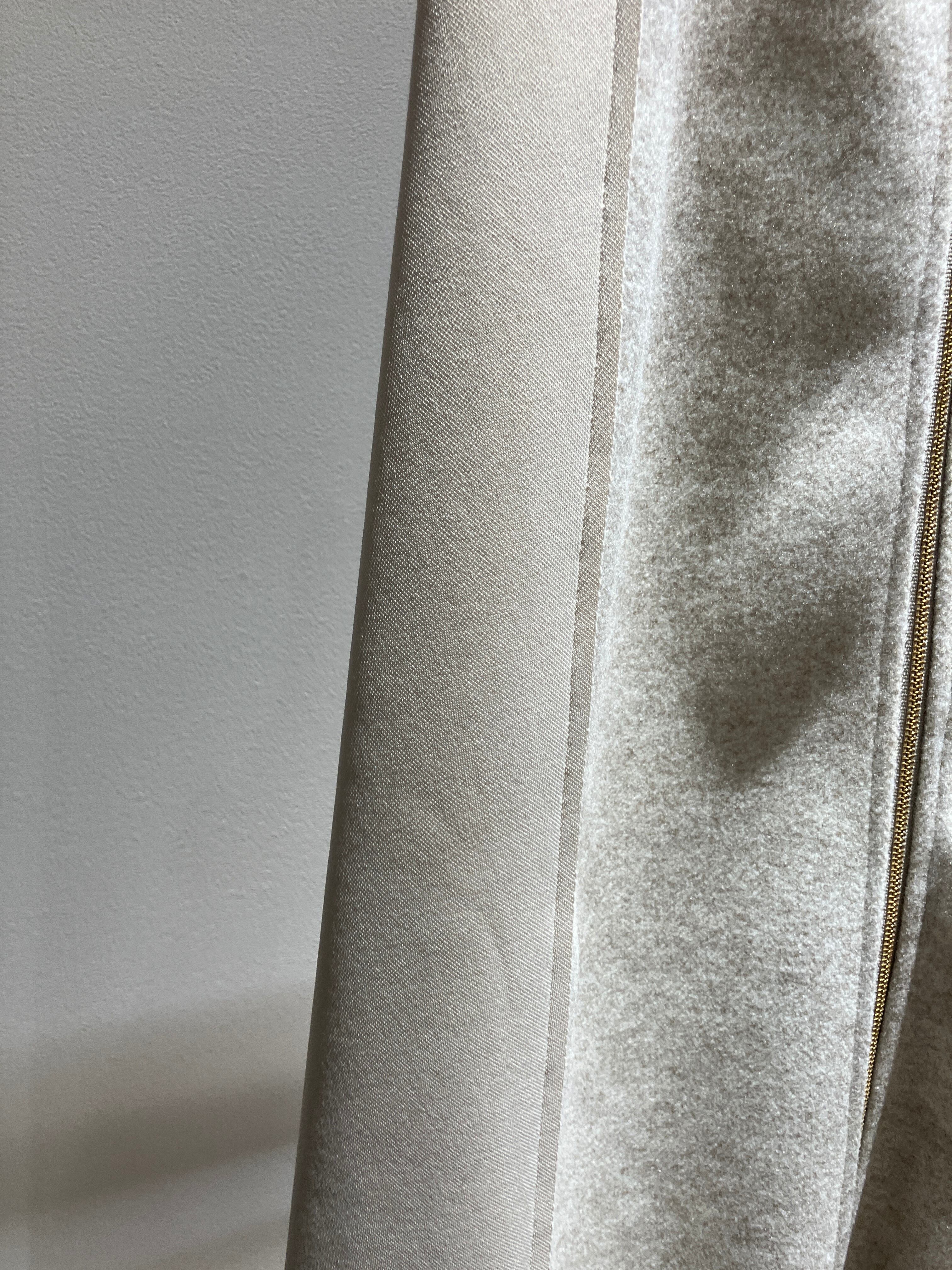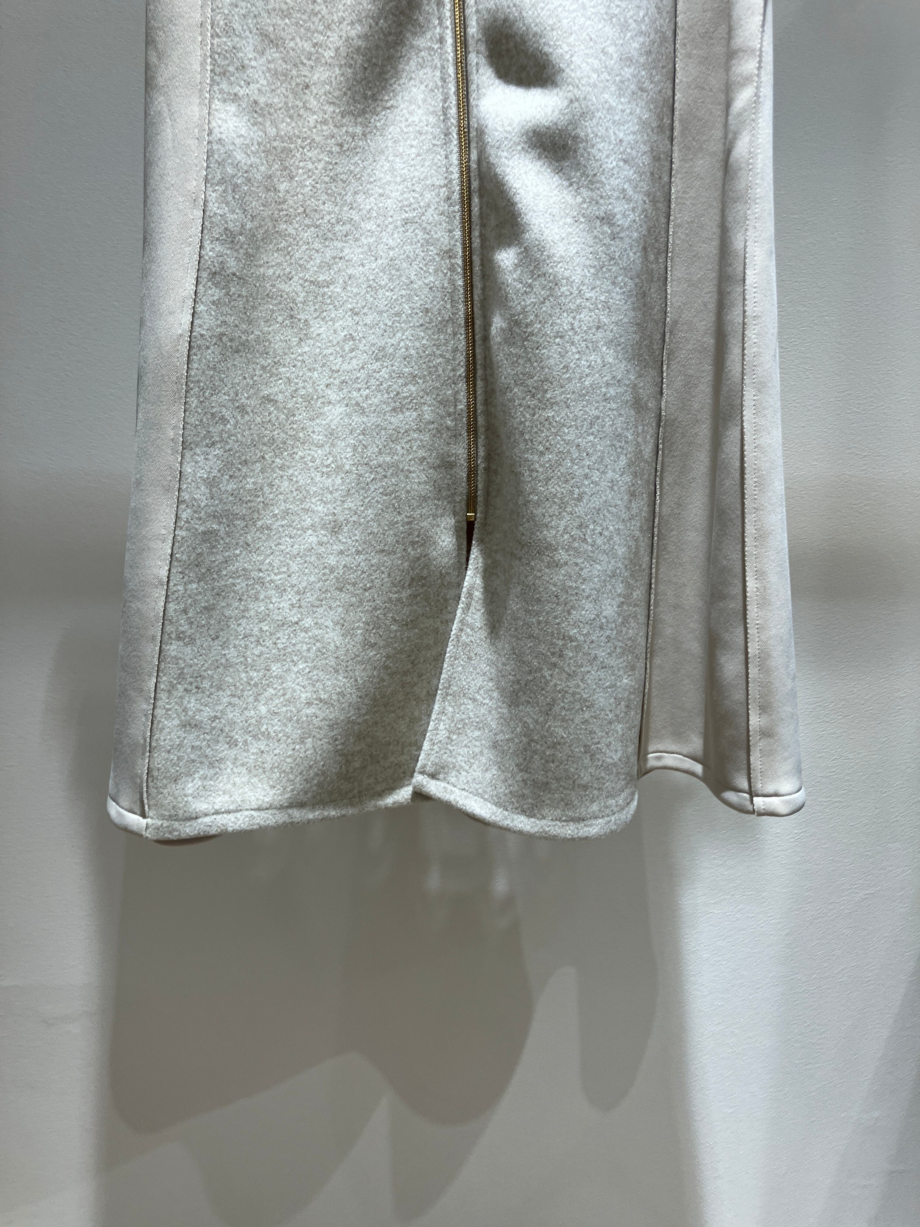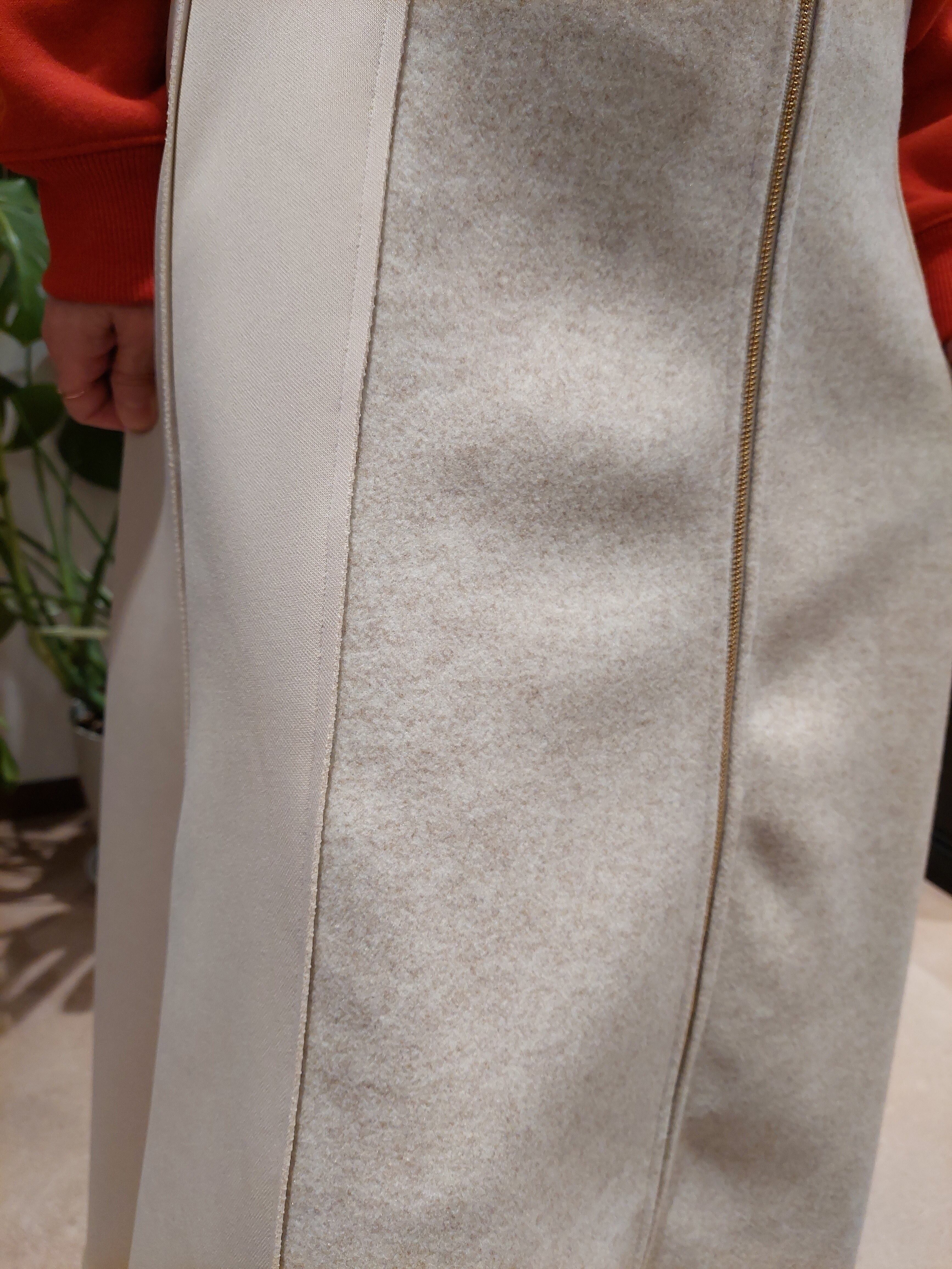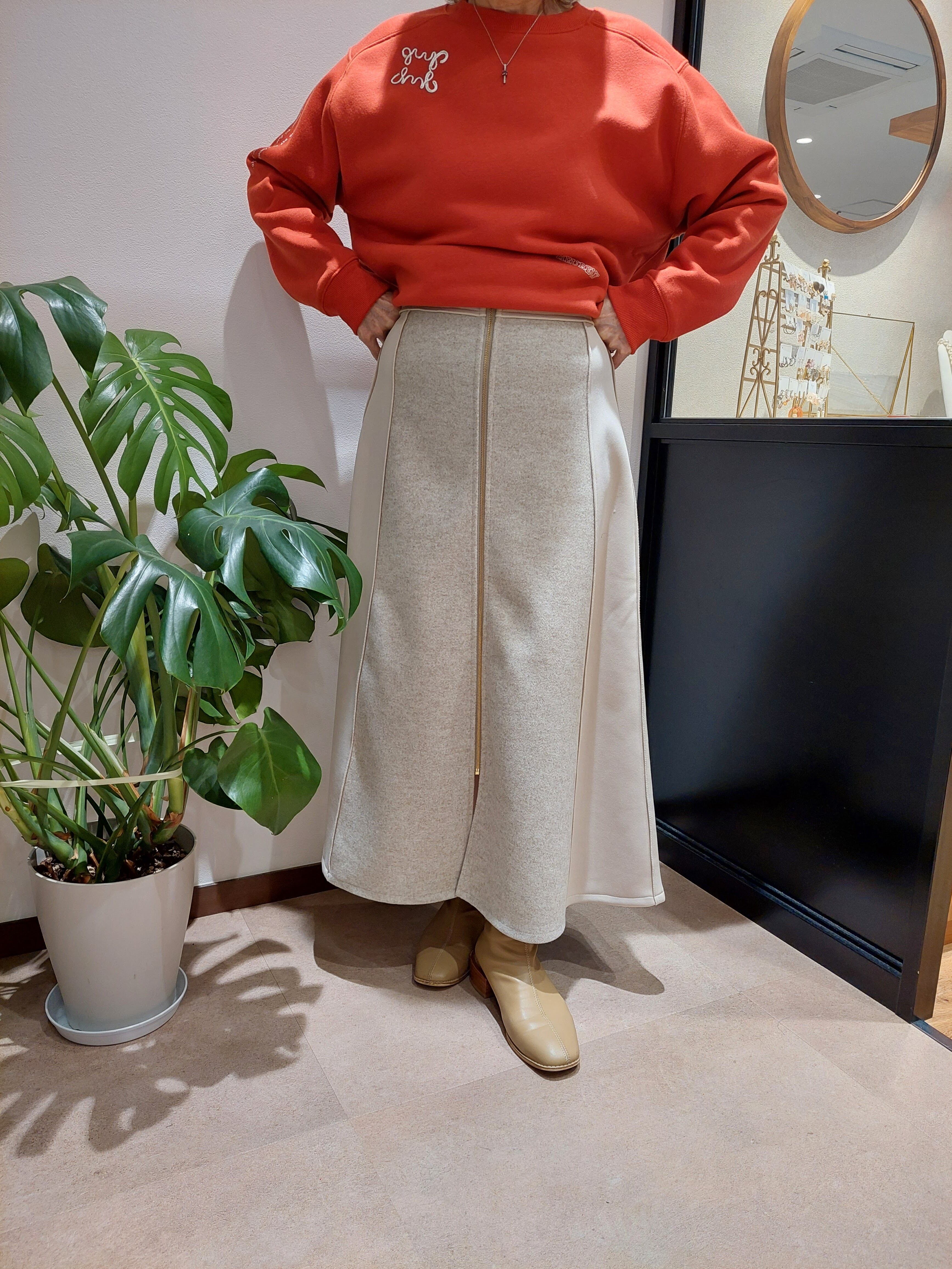 フロントジップが特徴的な異素材切替の暖かみのあるスカート。