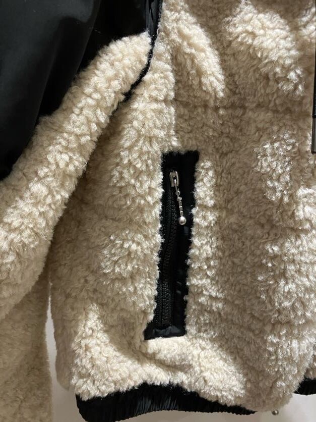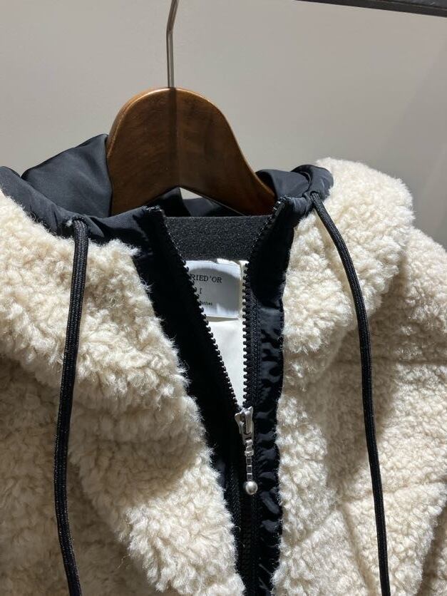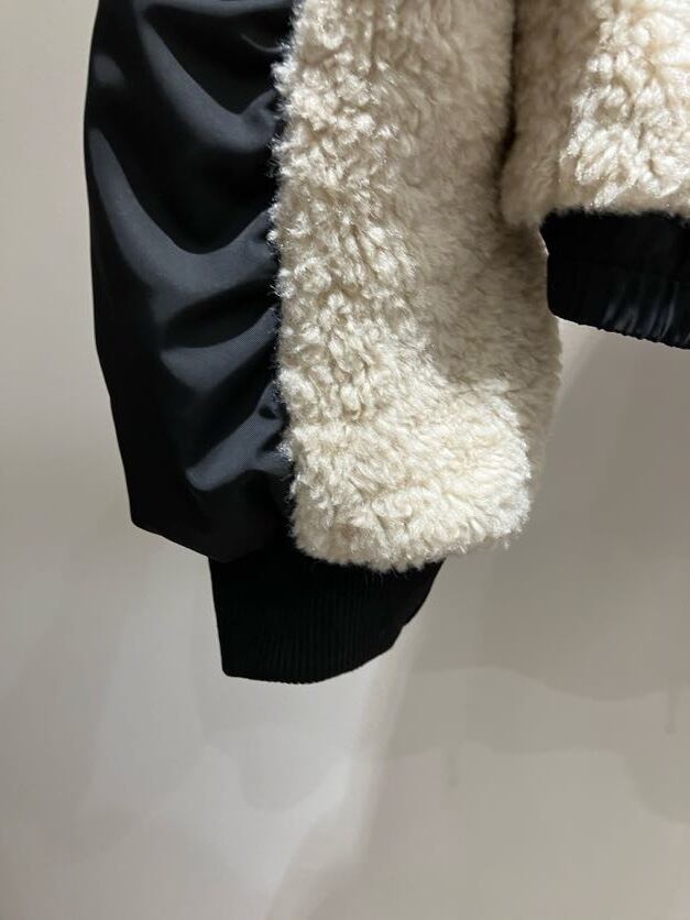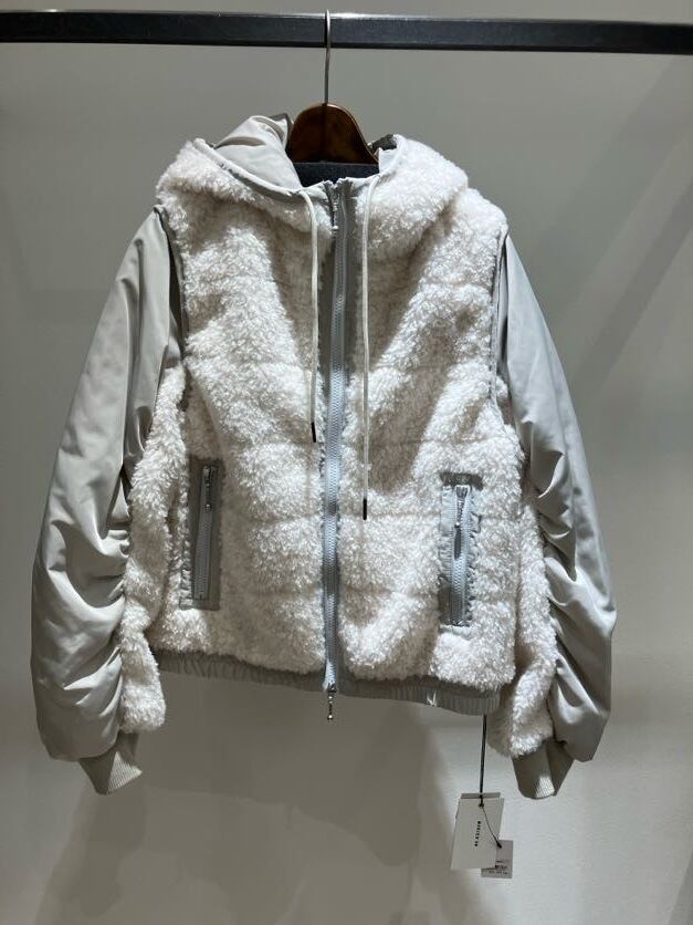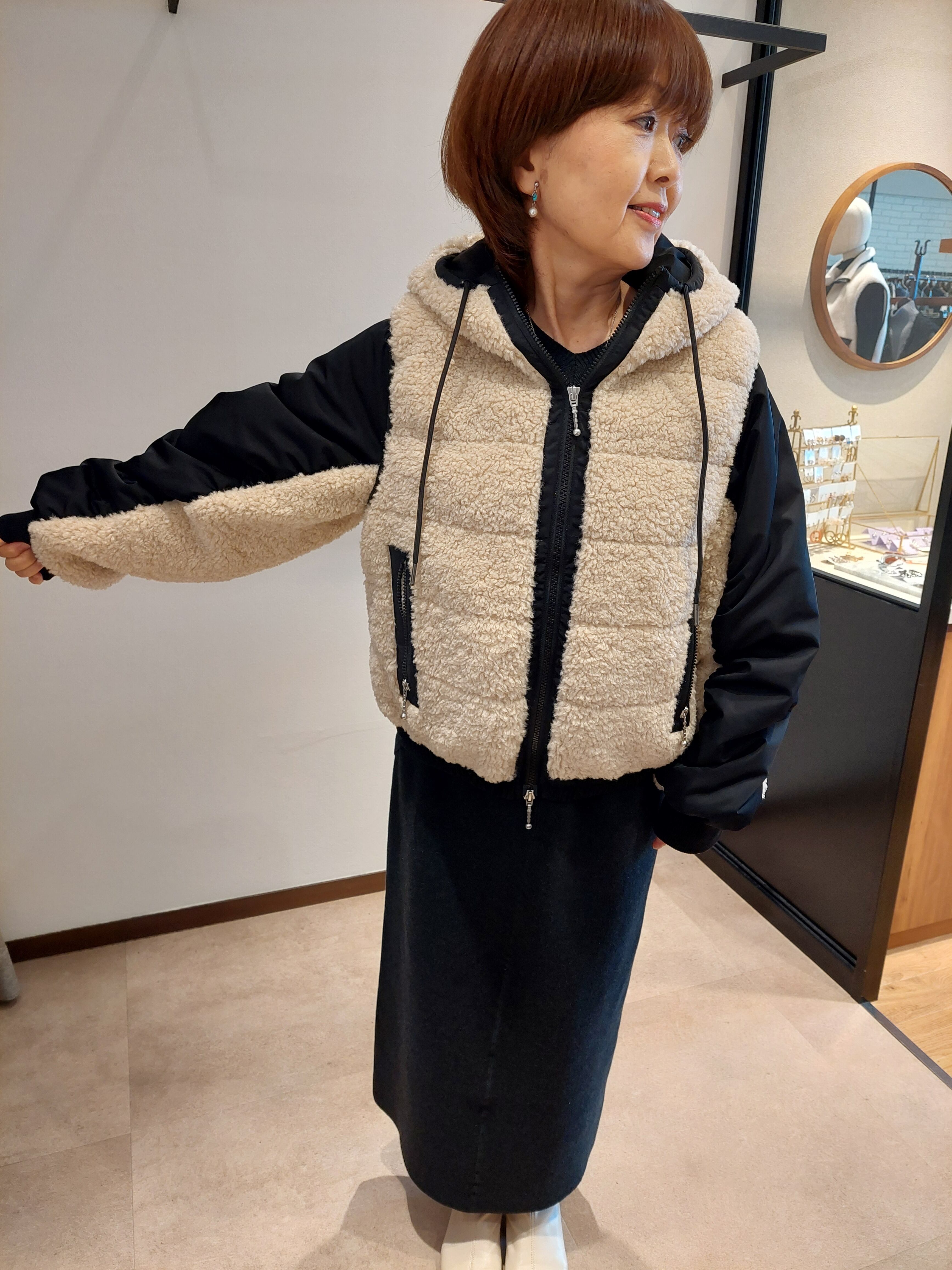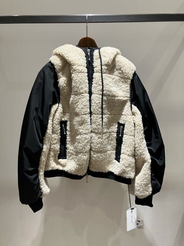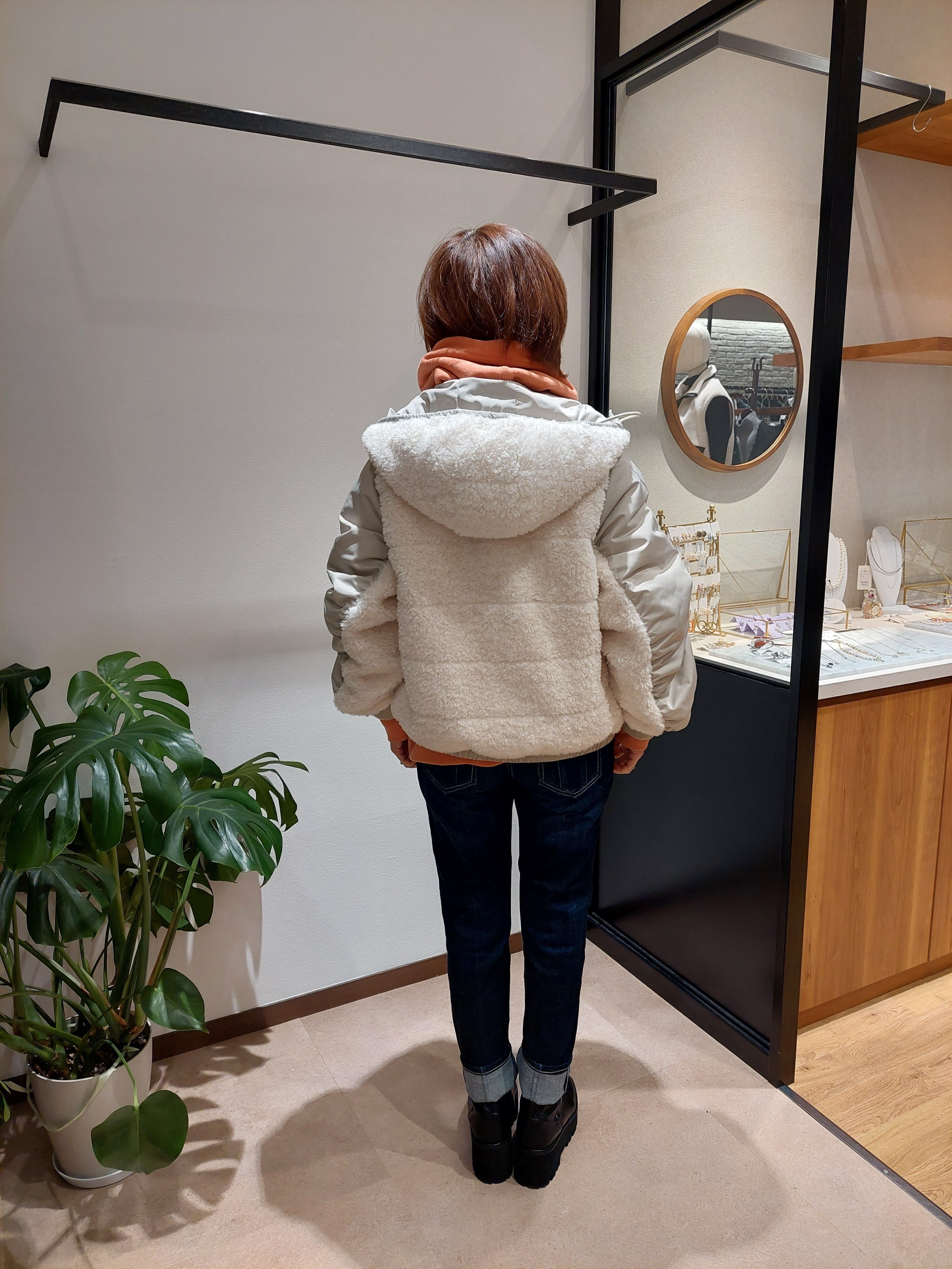 ボアとタフタの異素材切替でメリハリの効いたフードブルゾン。