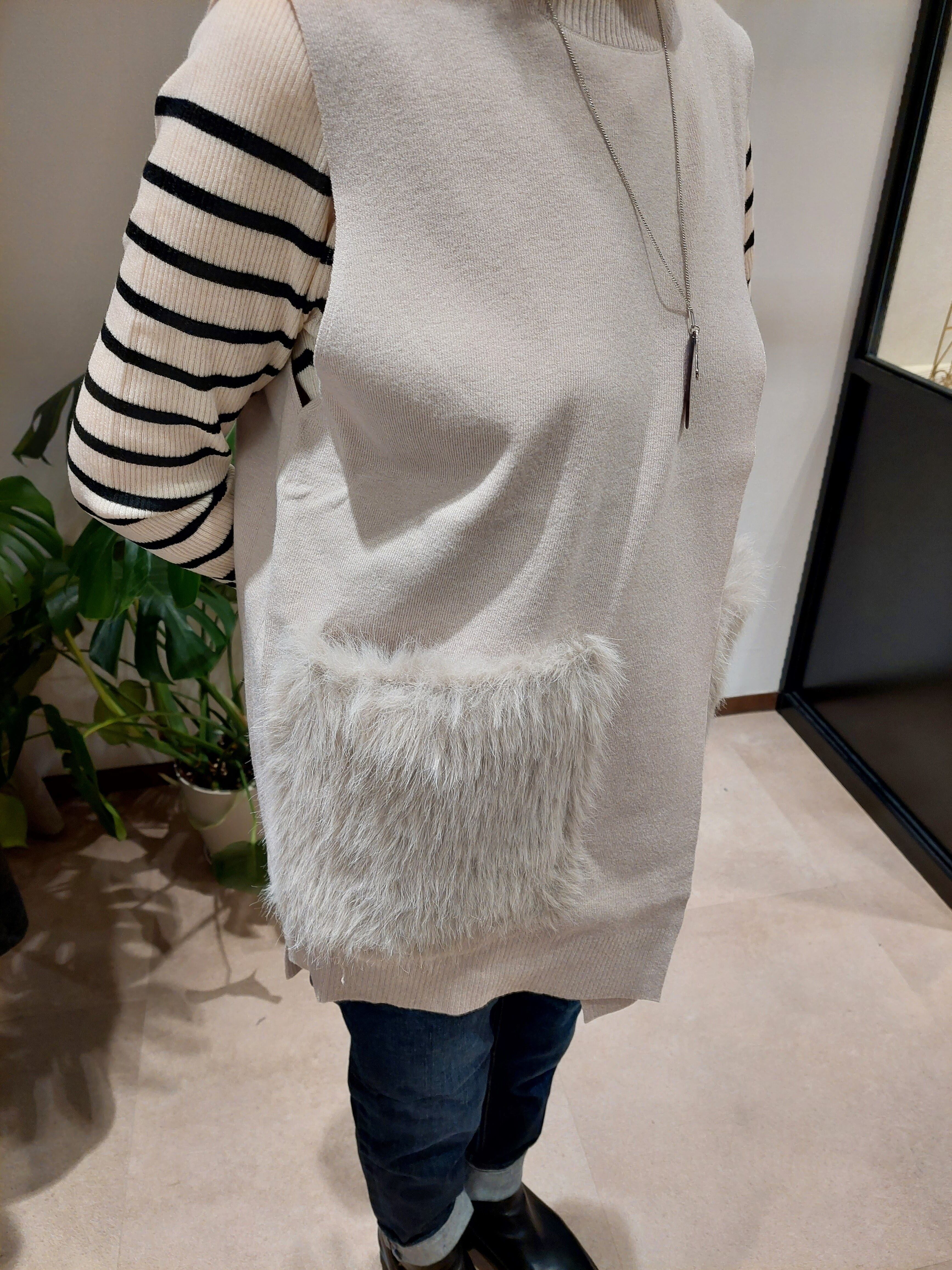 大きめのファーポケットをあしらったプルオーバーベスト。