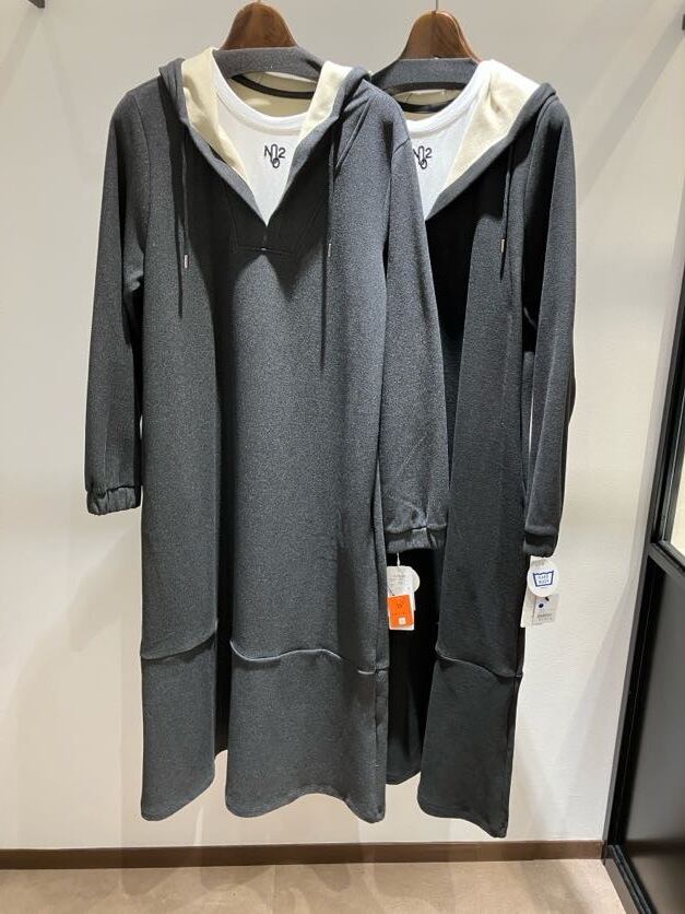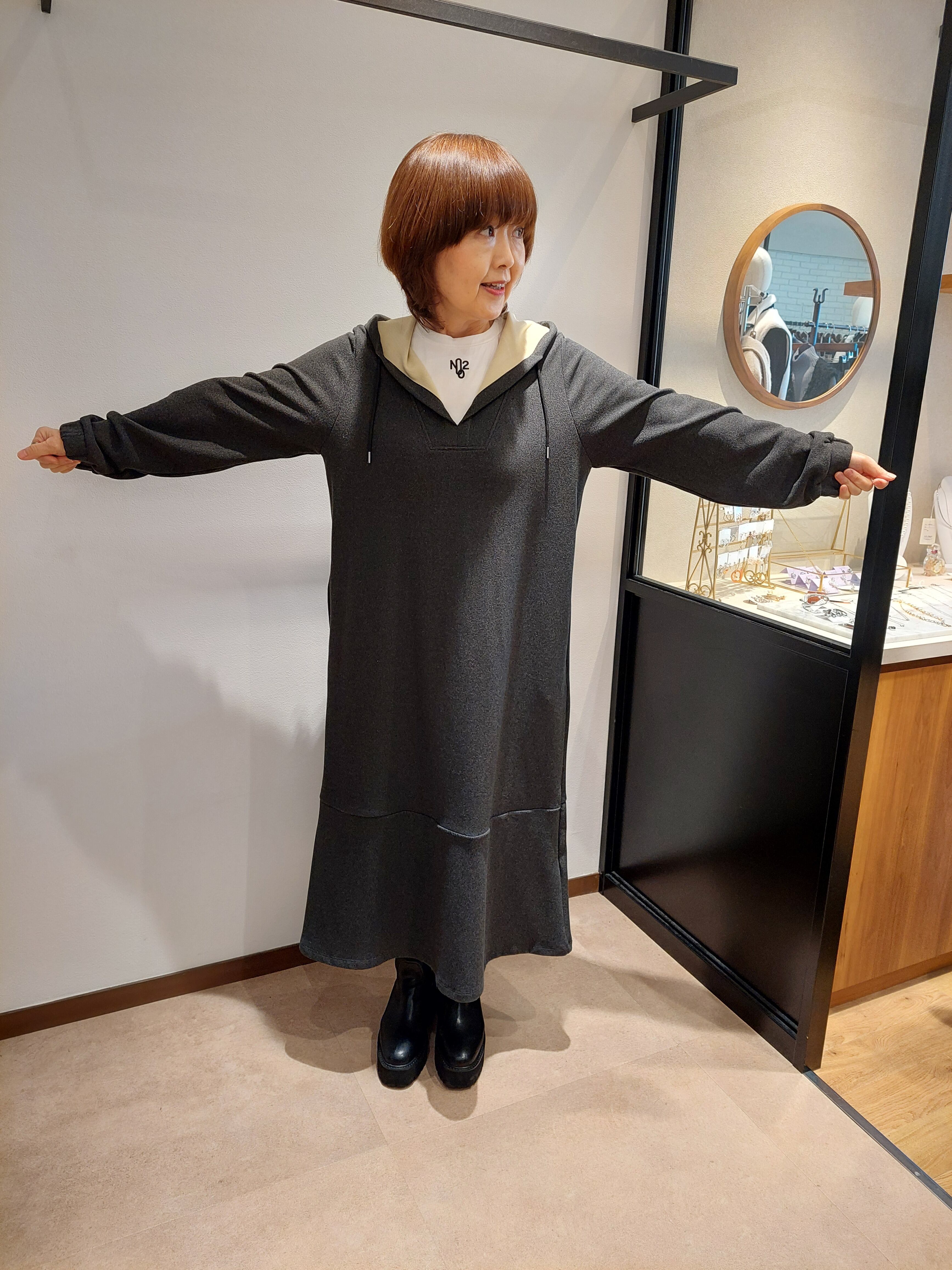 カットソーとフーディがドッキングしたデザインの裏起毛ワンピース。