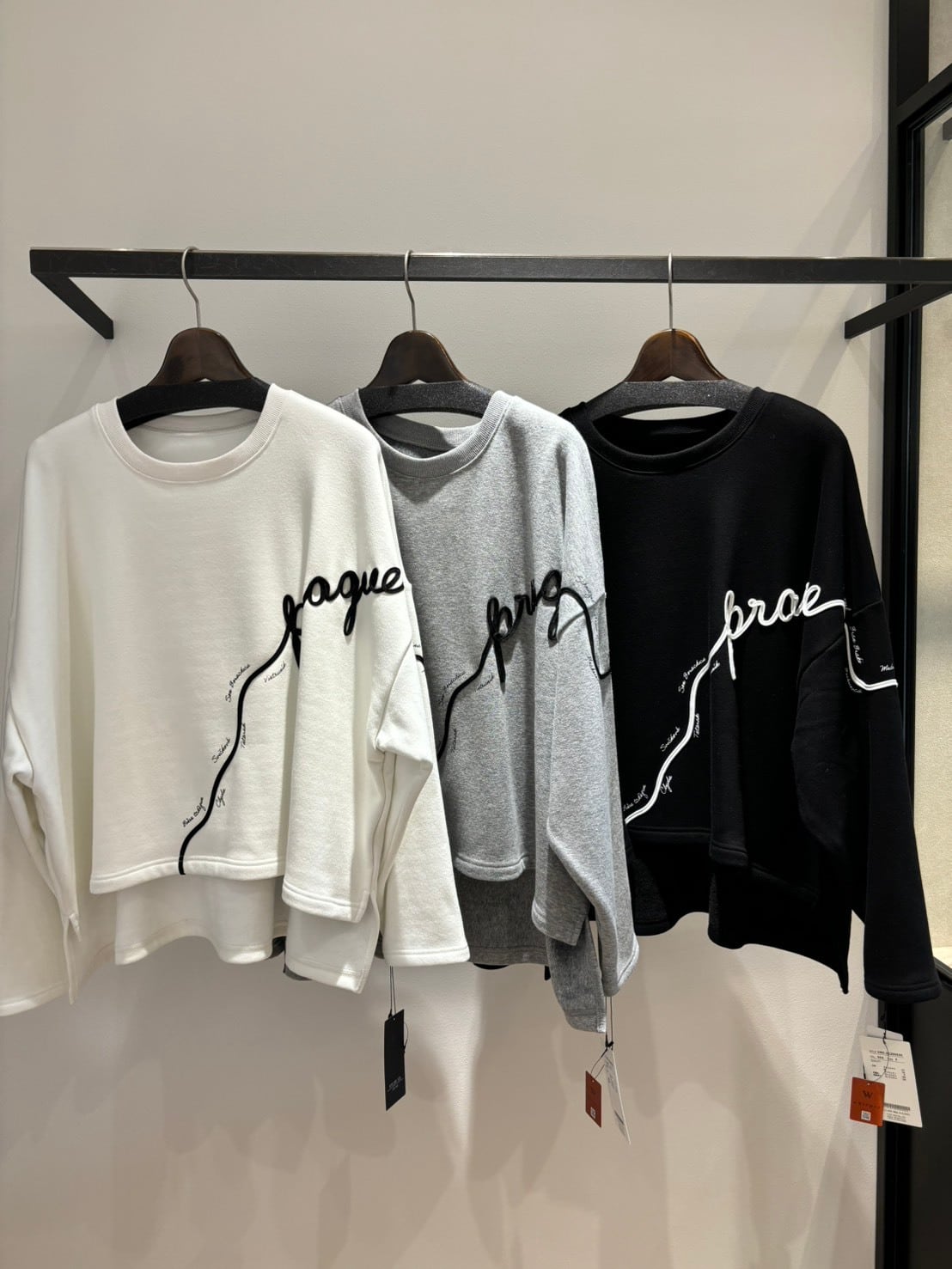 身頃にデザインされたテープ刺繍がアクセントになったニットトップス。