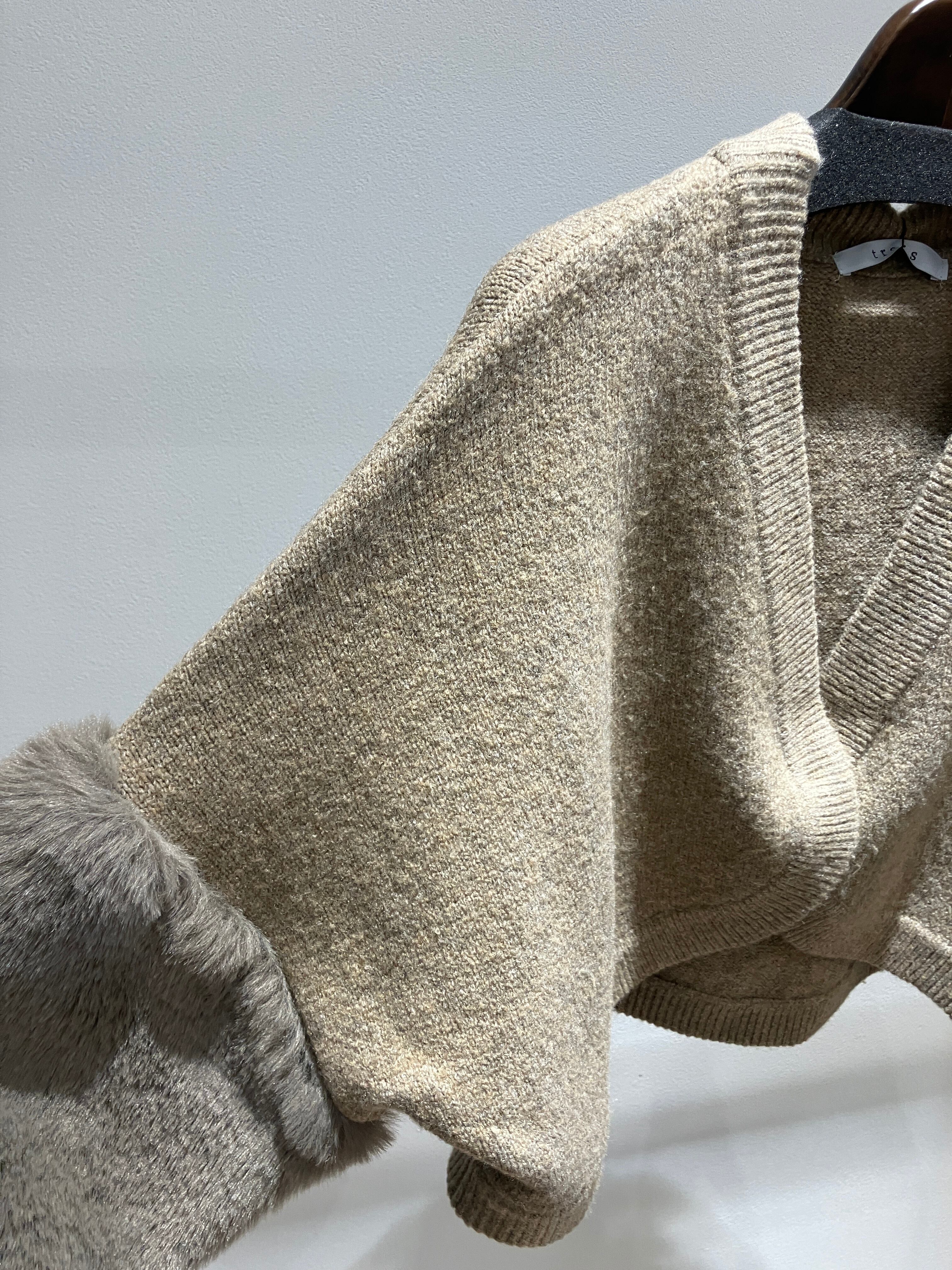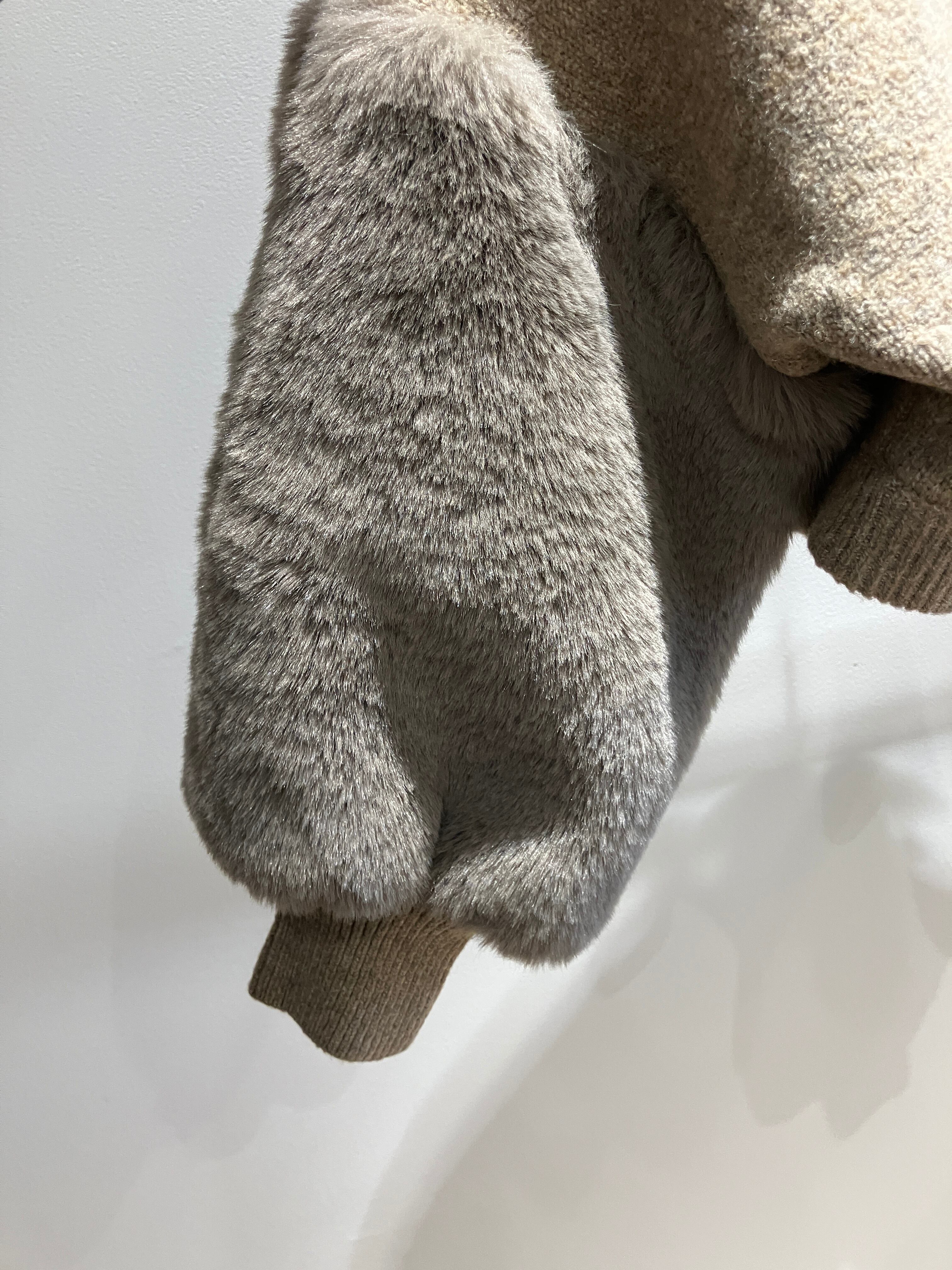 軽く暖かい糸を5Gで編みたてた、弊社人気のエコファー切替ニット。