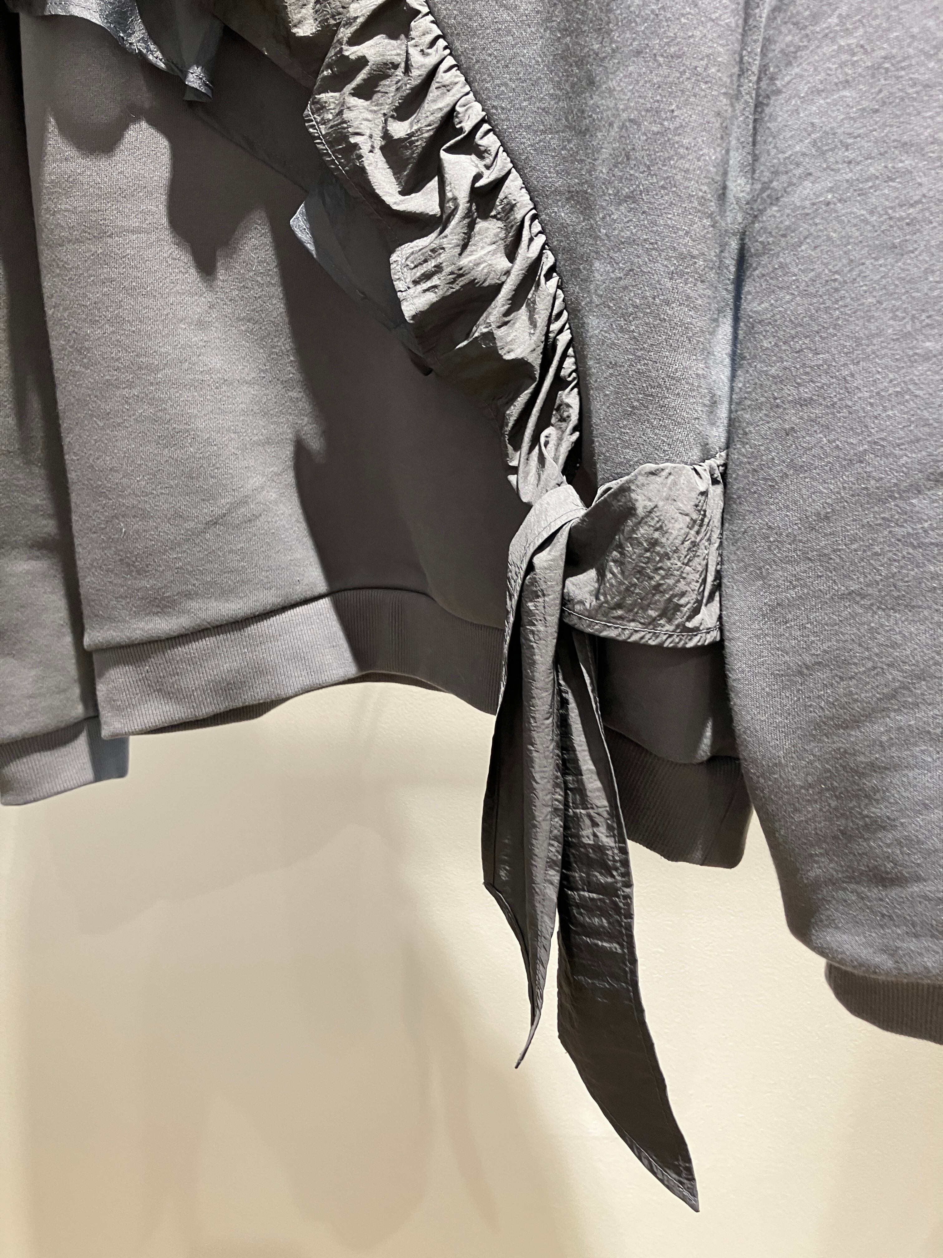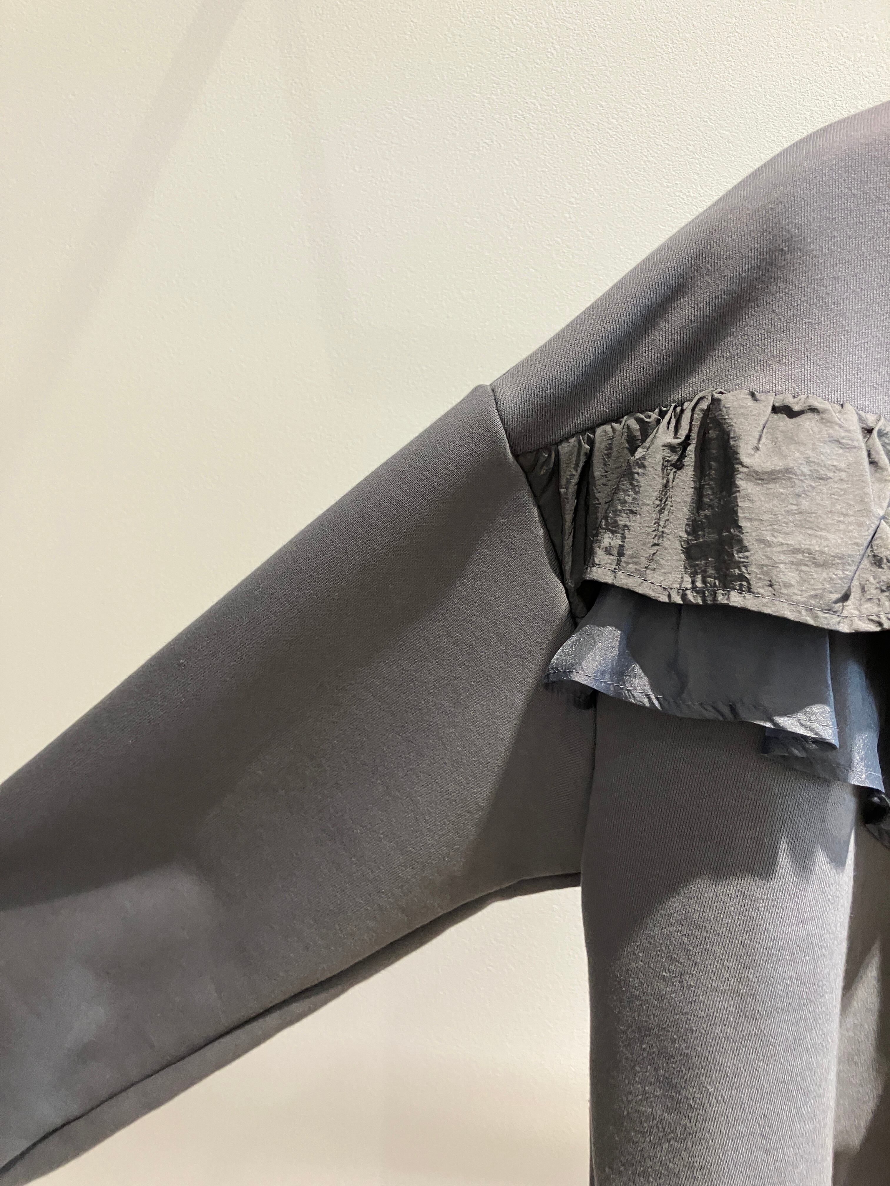 タフタとオーガンジーを重ねたフリルディテールが華やかな印象を与えてくれるスウェットトップス。シーズンレスに活躍する程よい厚みの裏毛素材はポリエステルを混紡することによりハリのある上質な生地感に仕上がっています。