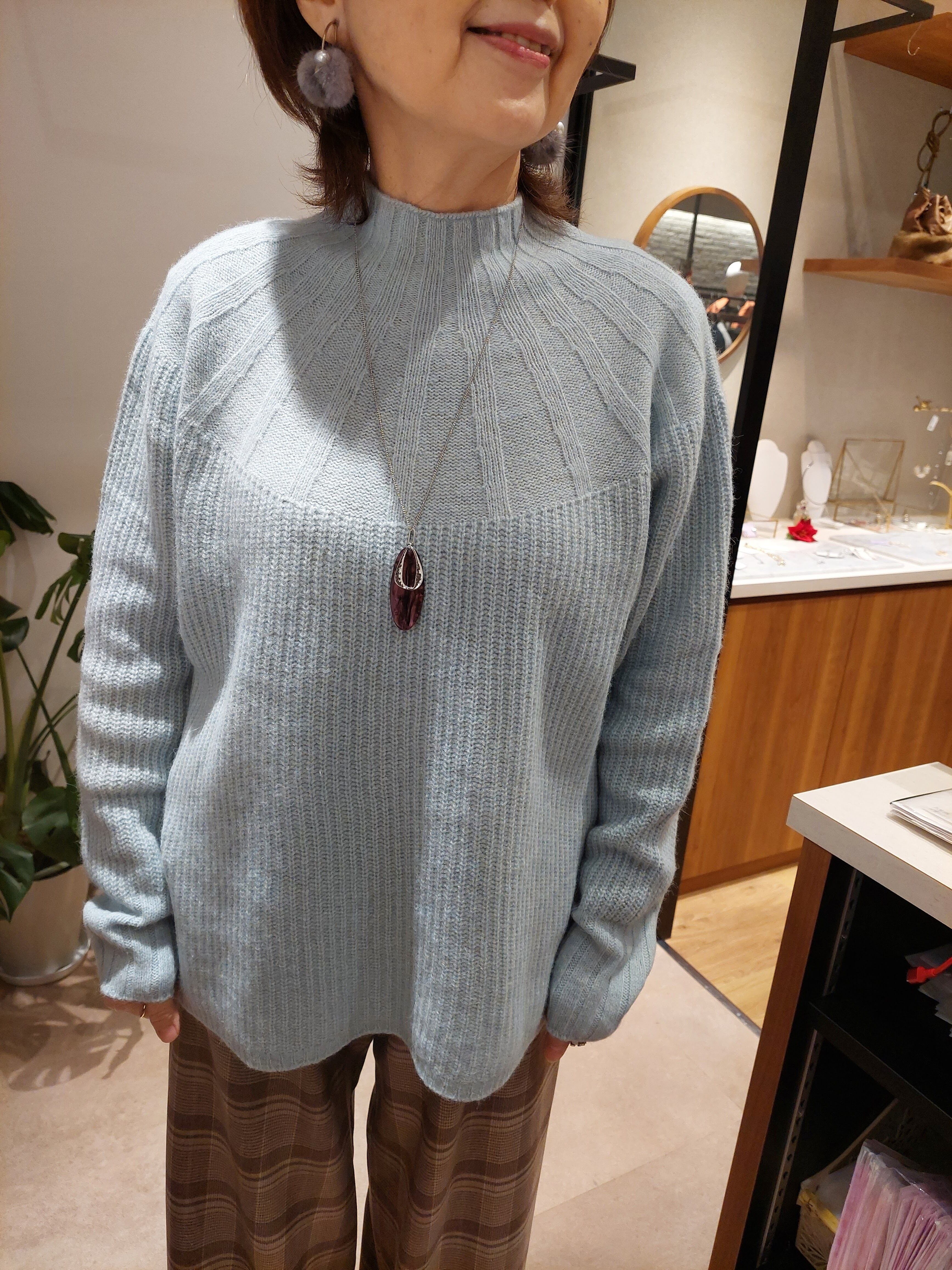 ハイネックとさりげない求心の編み柄がさりげない大人っぽさを演出。