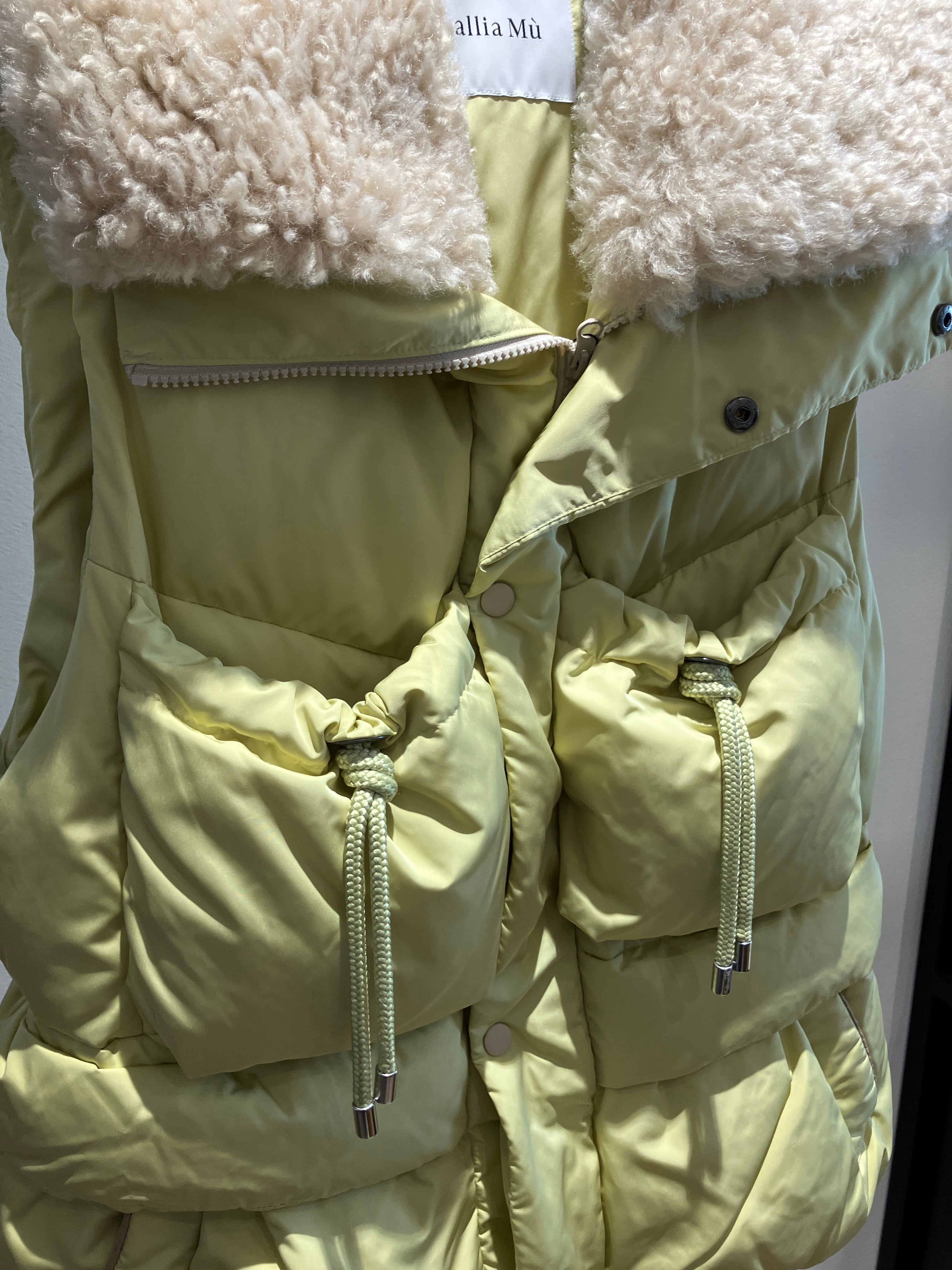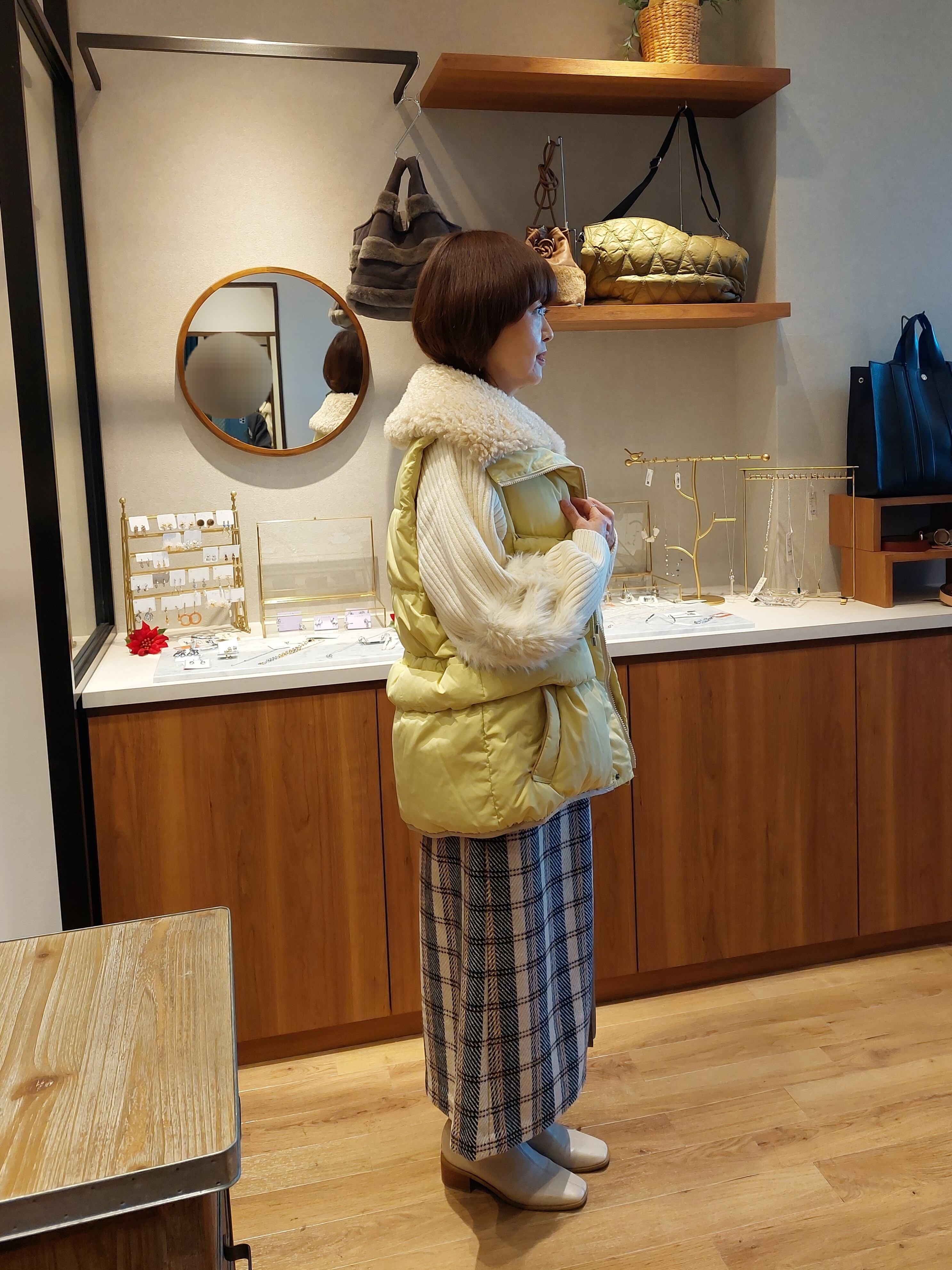 スポーティでカジュアルになりがちなダウンベストをフェミニンで洗練されたムードにデザインされたダウンベスト。