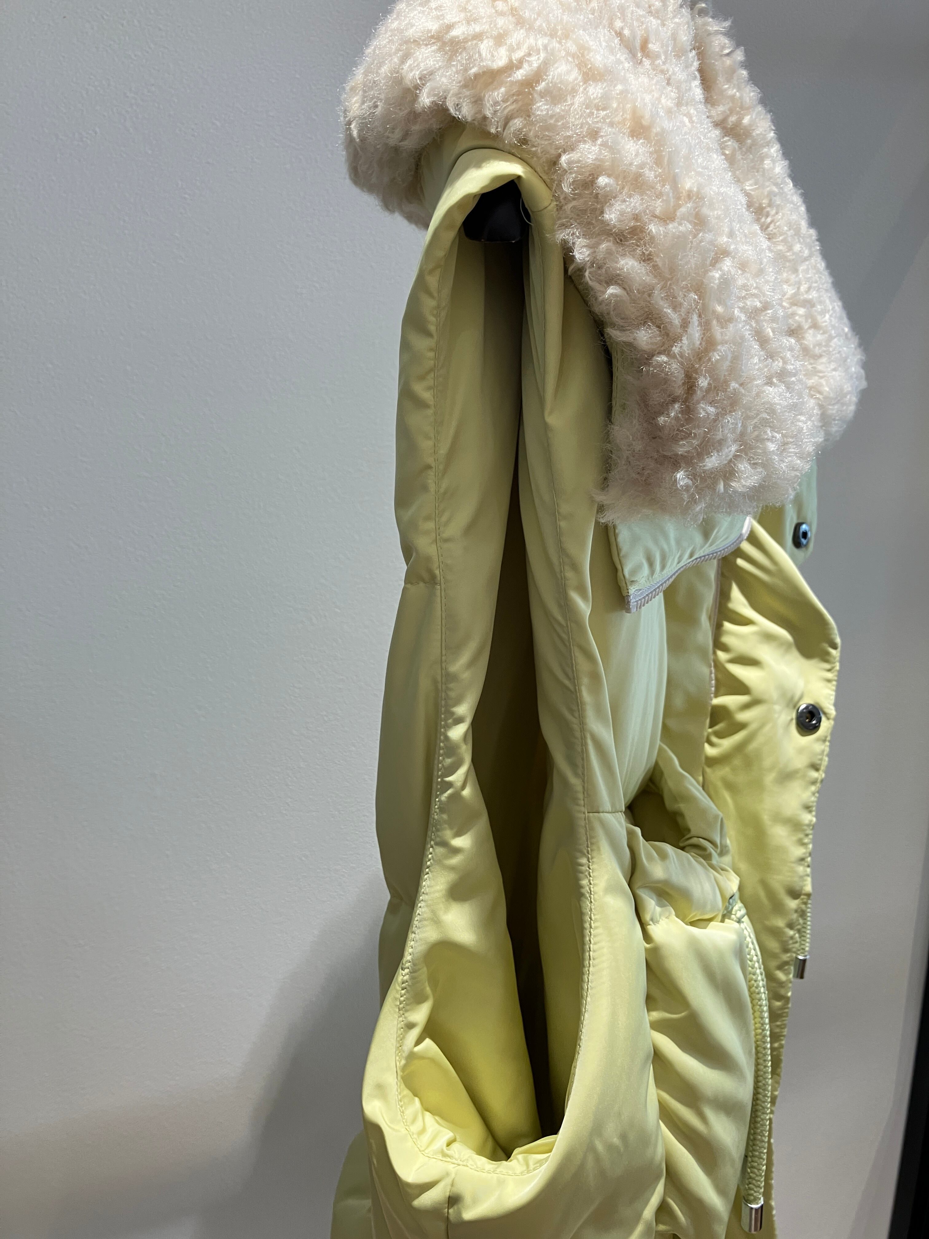 取り外し可能なエコファーの衿はしっかりとクリンプ加工が施され、リアルな羊毛のような毛並みが品の良さとラグジュアリーなムードをプラスします。