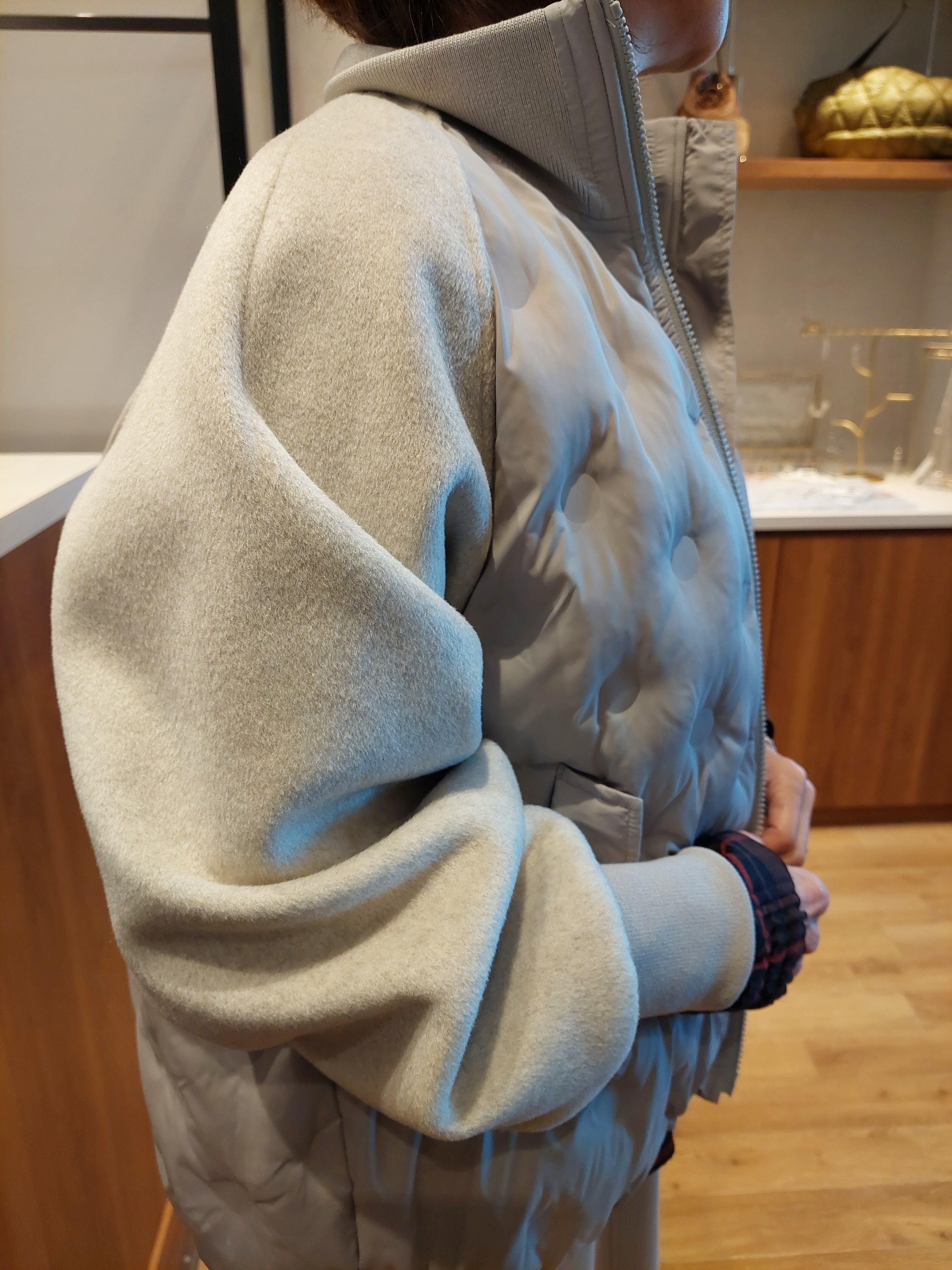 ウール×キルトのハイブリッド素材が特徴的なハイネックコート。