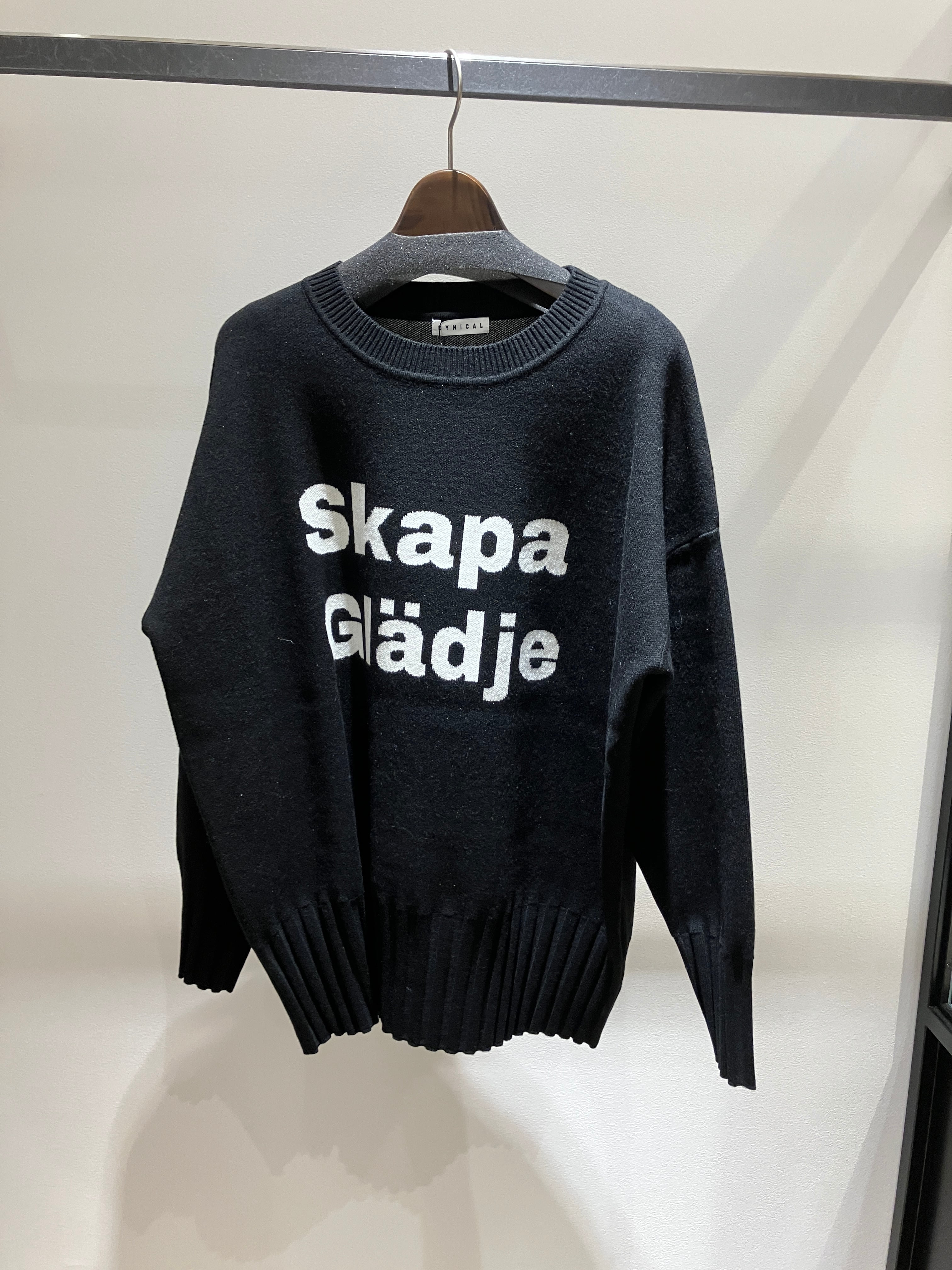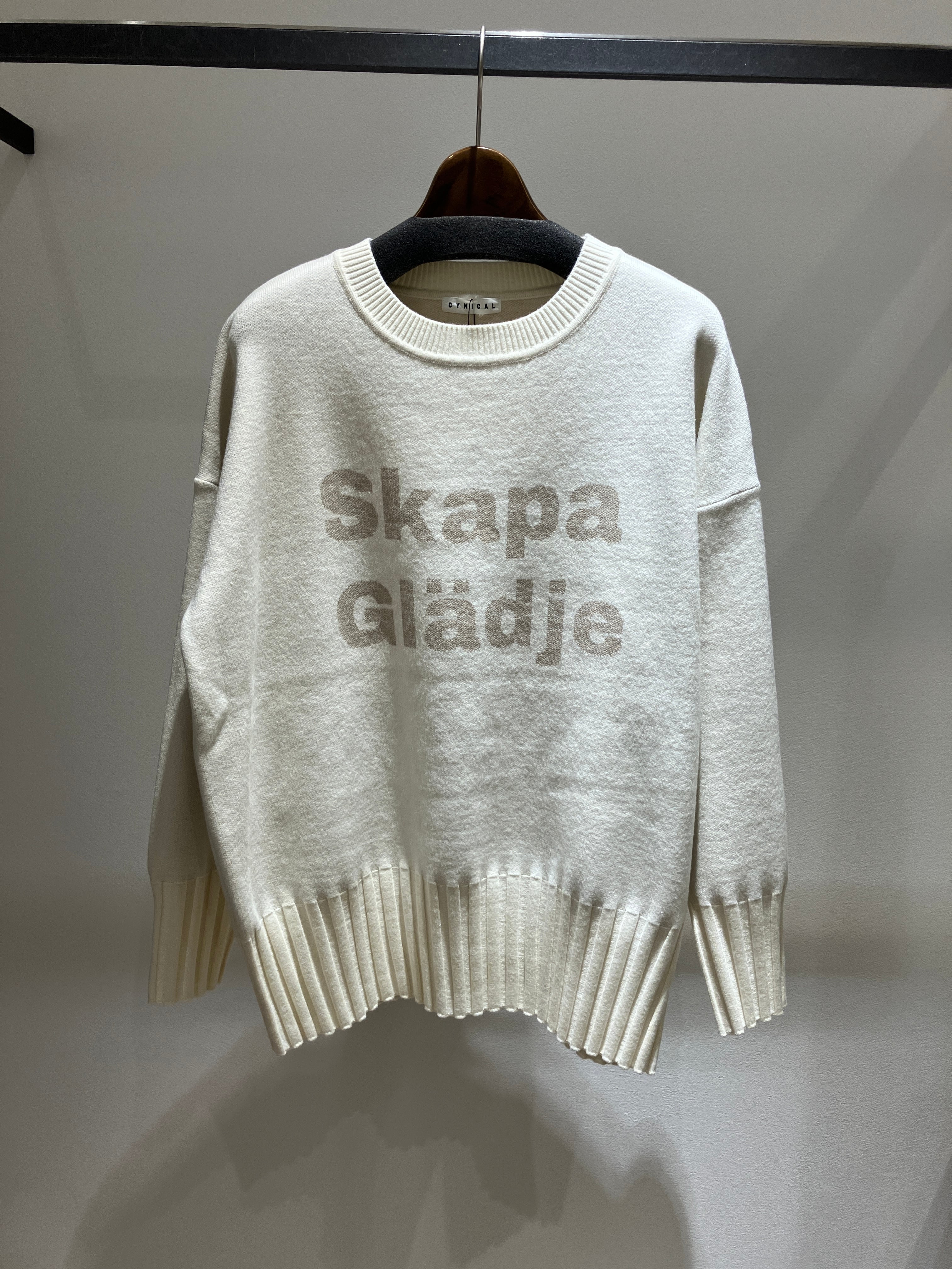 スウェーデン語のロゴが施されたプルオーバーニット。