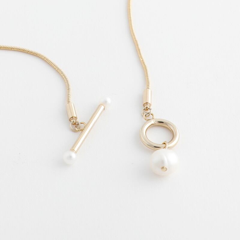 スネークチェーンと淡水パールのつなぎ目をあえてなくして、流れるようなデザインにこだわったネックレス。 留め具はマンテル仕様となっており、正面にマンテルパーツを持ってきていただくとポイントになります。 100cmのロングネックレスとなっており、二重に重ねて着けていただくと旬な着け方に変わります。 スタイリング提案としておすすめのアイテムとなります