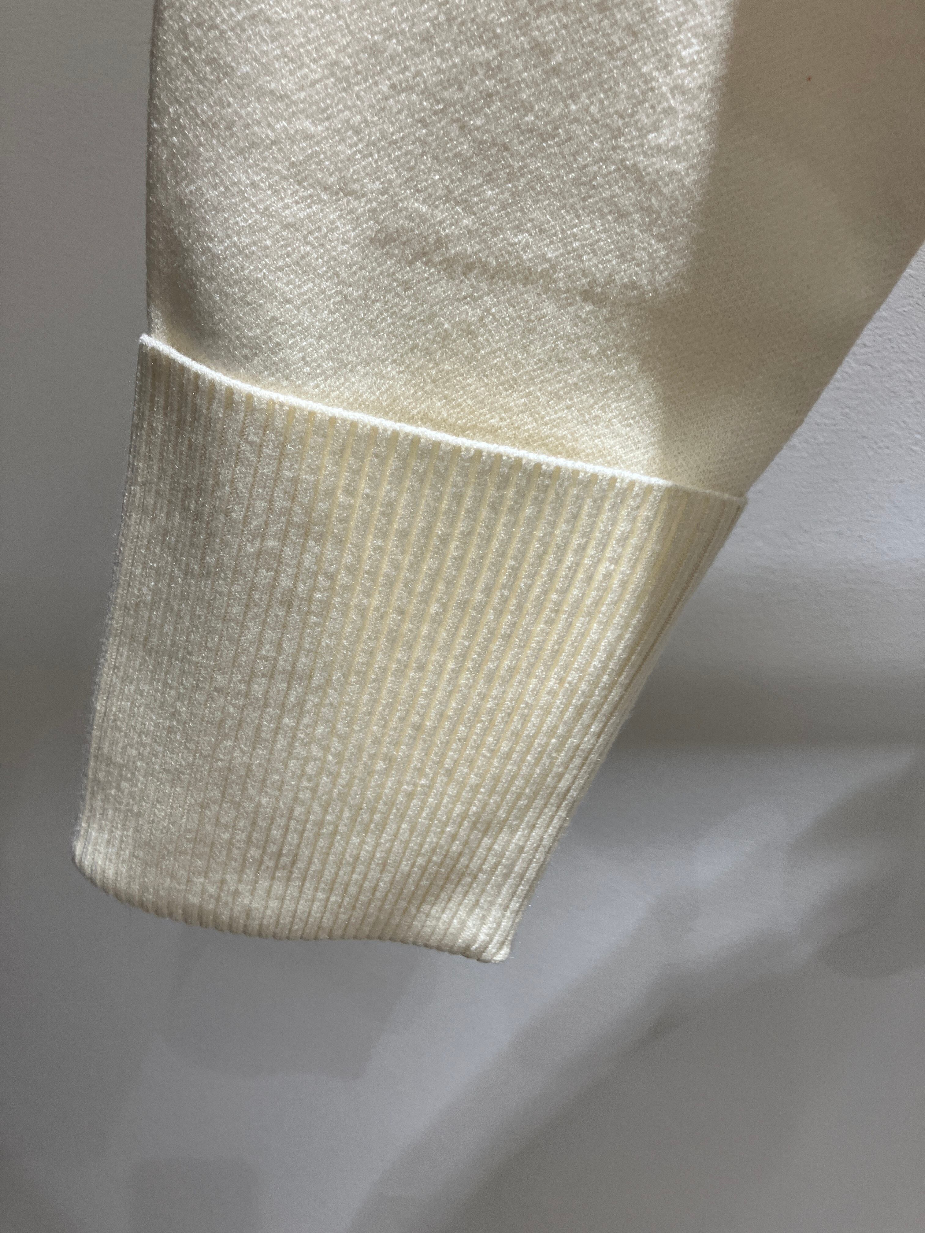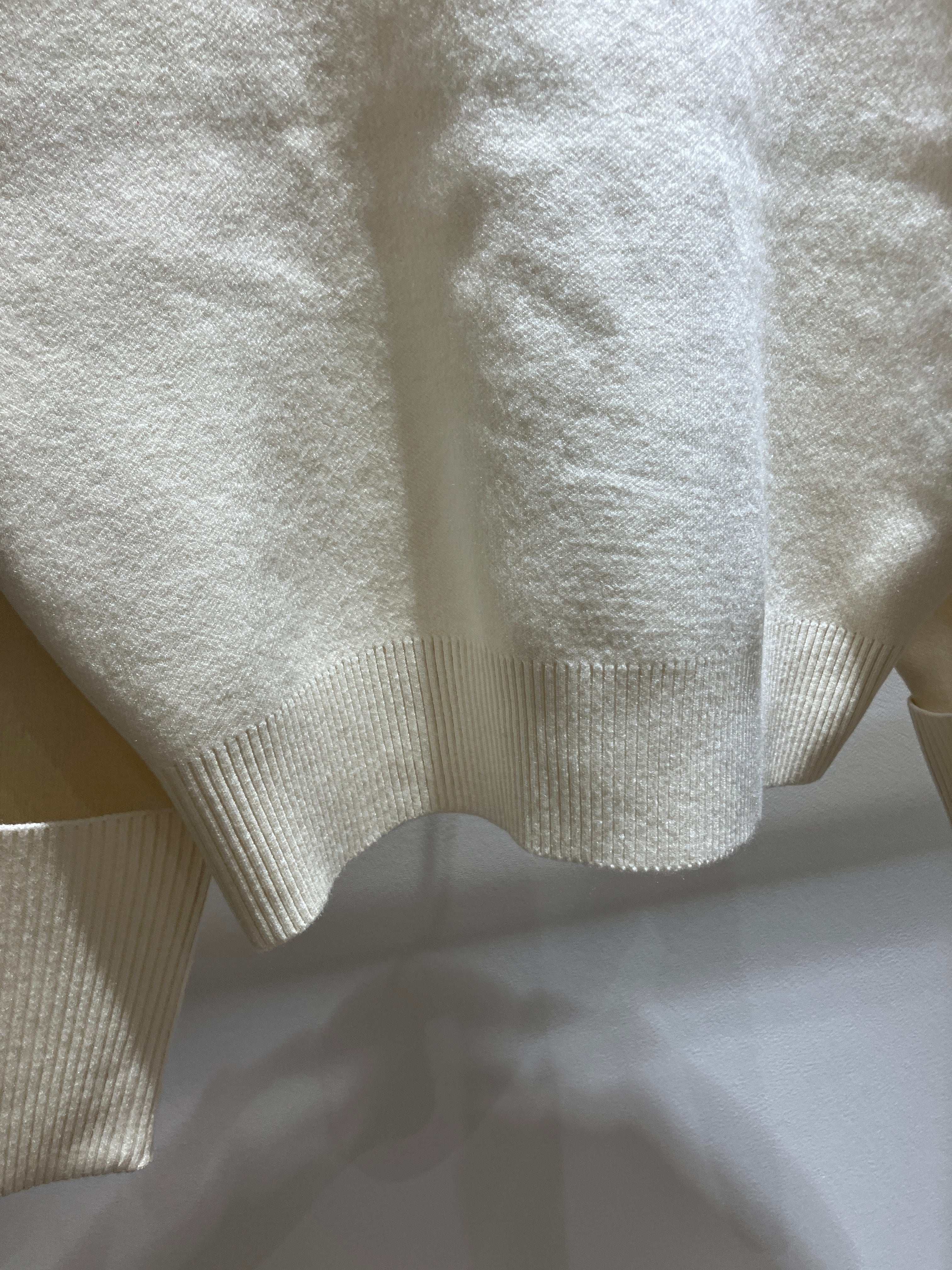 デザイン性のあるVネックは程よい深さで、長めのリブ袖が特徴的。