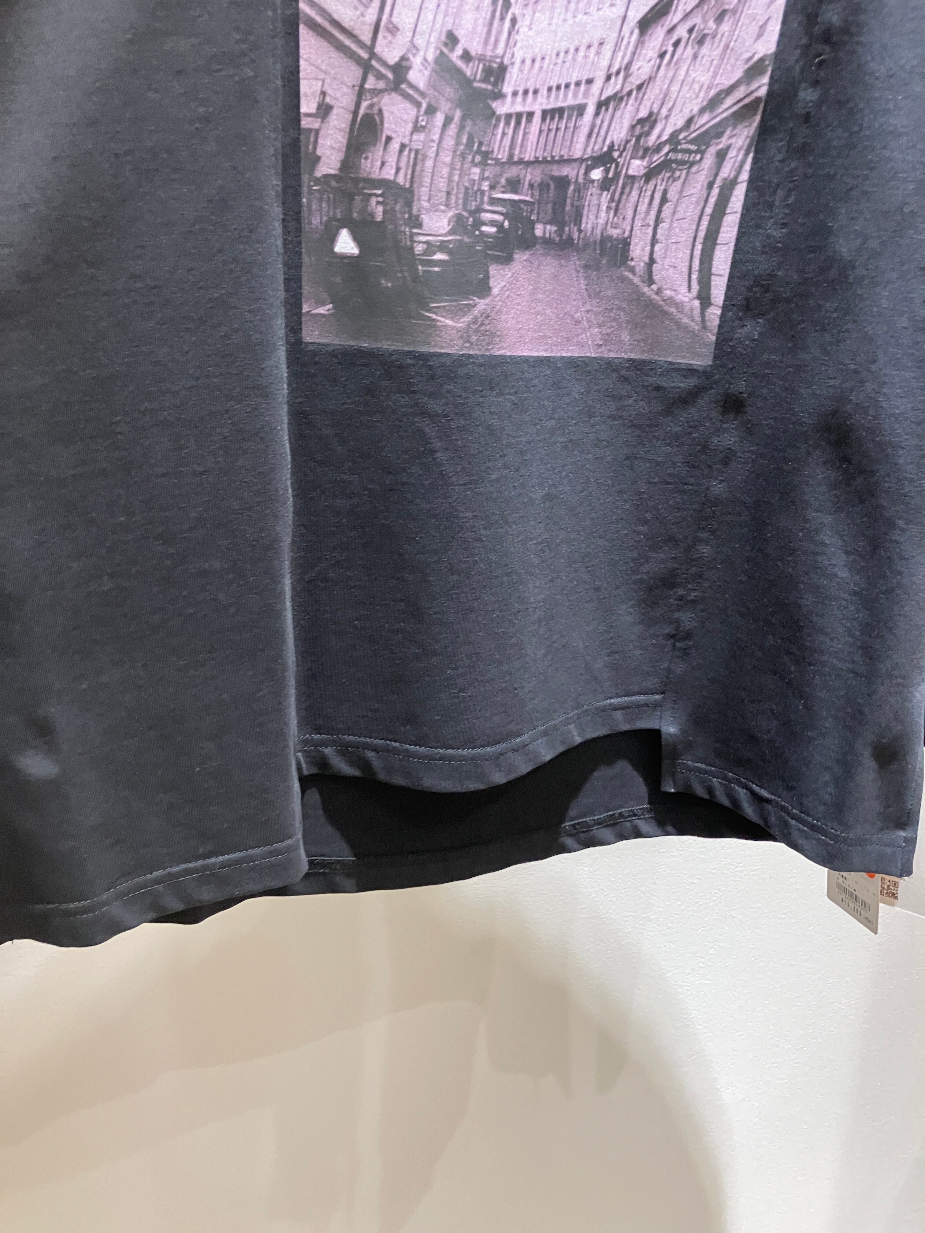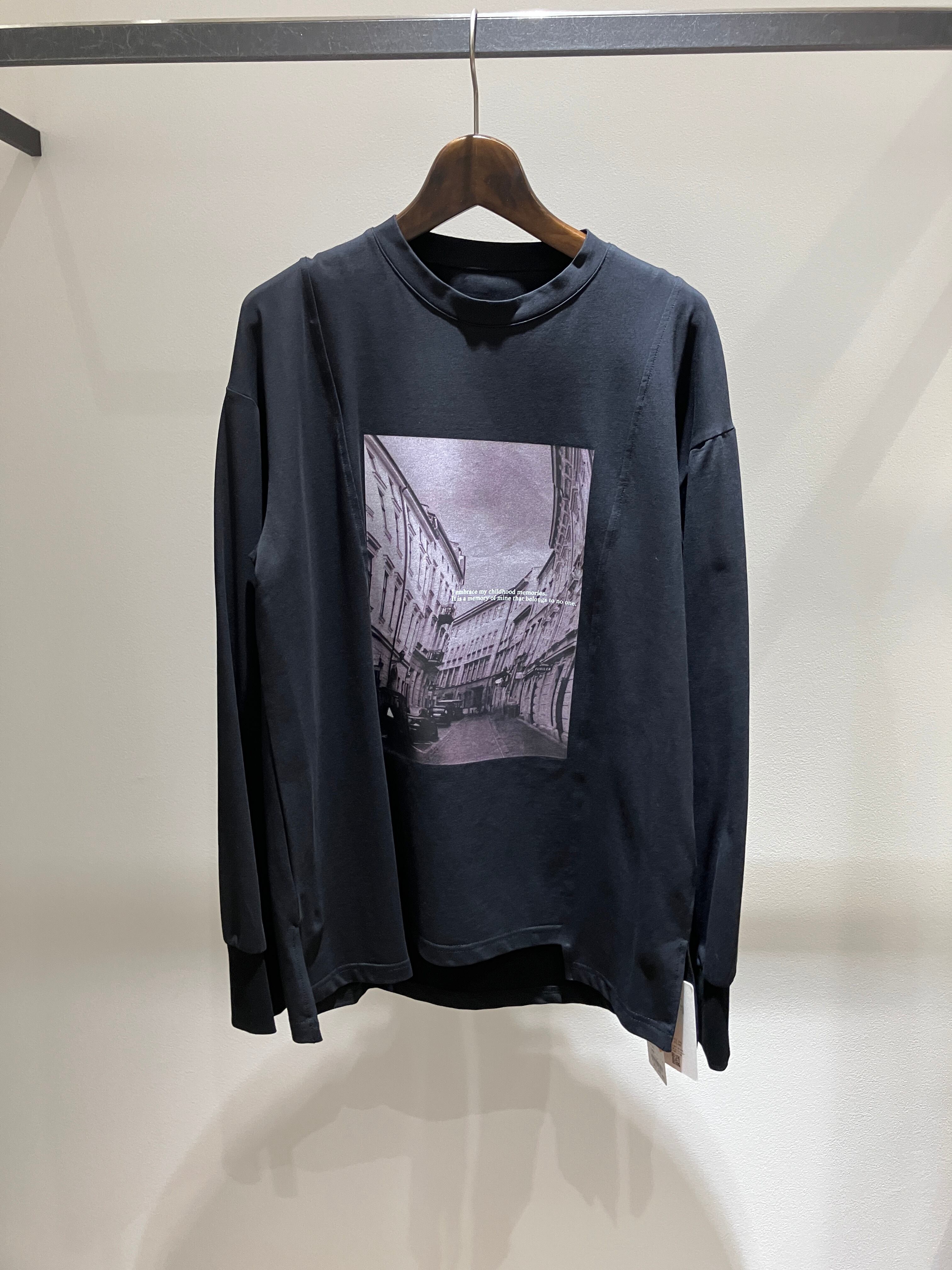フロントのグラフィックプリントが目を惹く、カジュアルながらも洗練された印象のロングTシャツ。