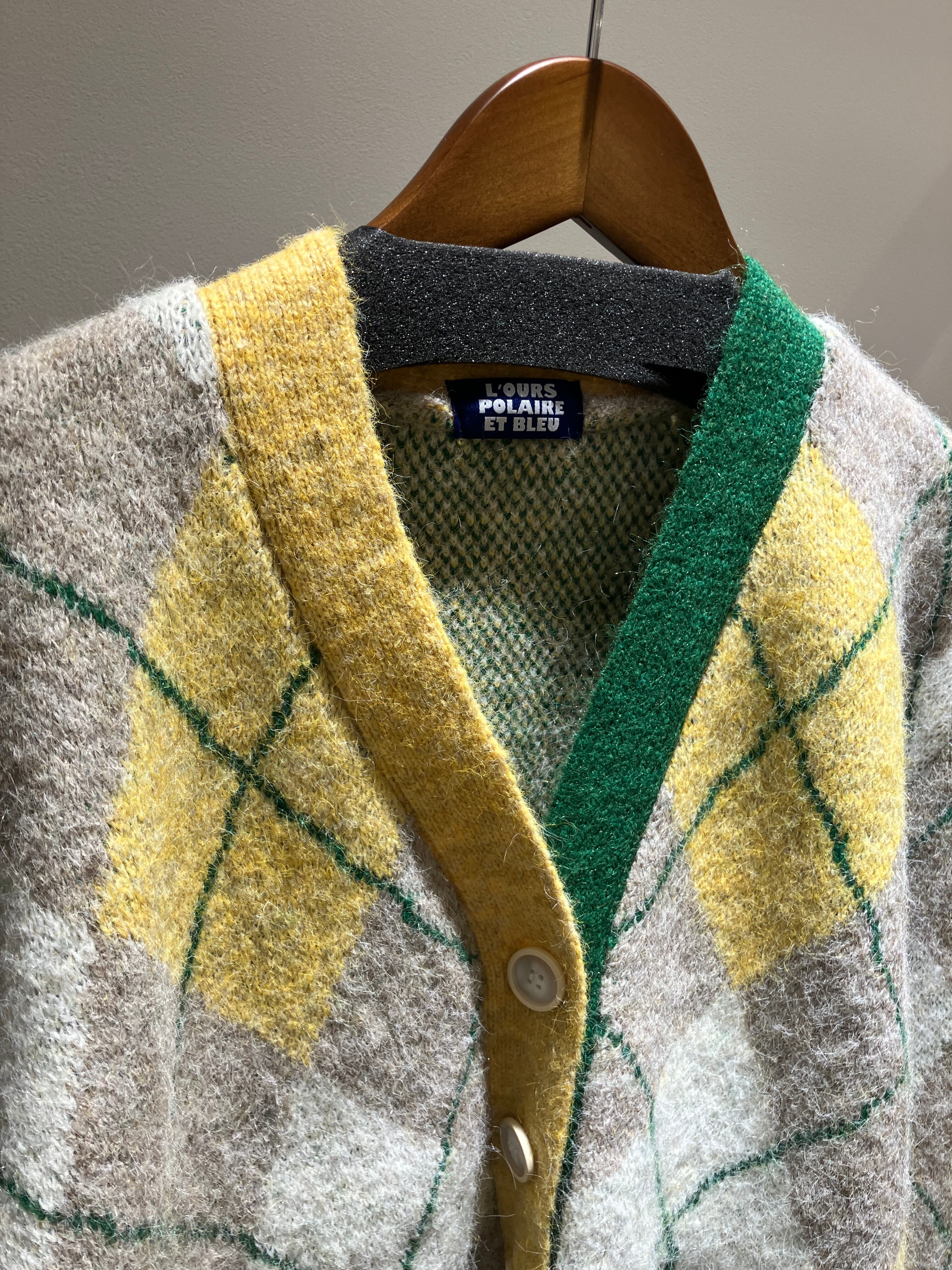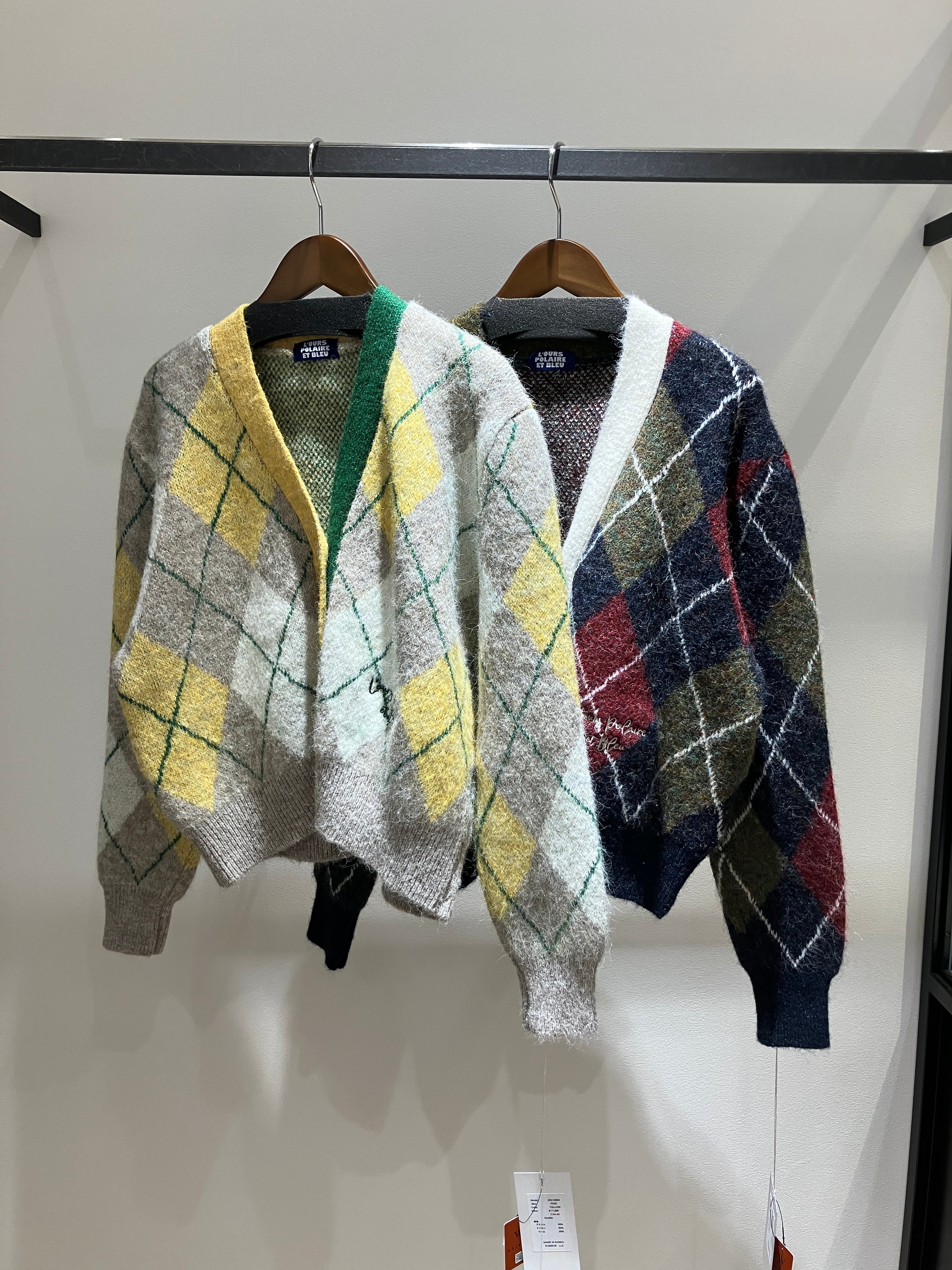 マルチカラーでデザインされた柄が特徴的なアーガイルニットカーディガン。