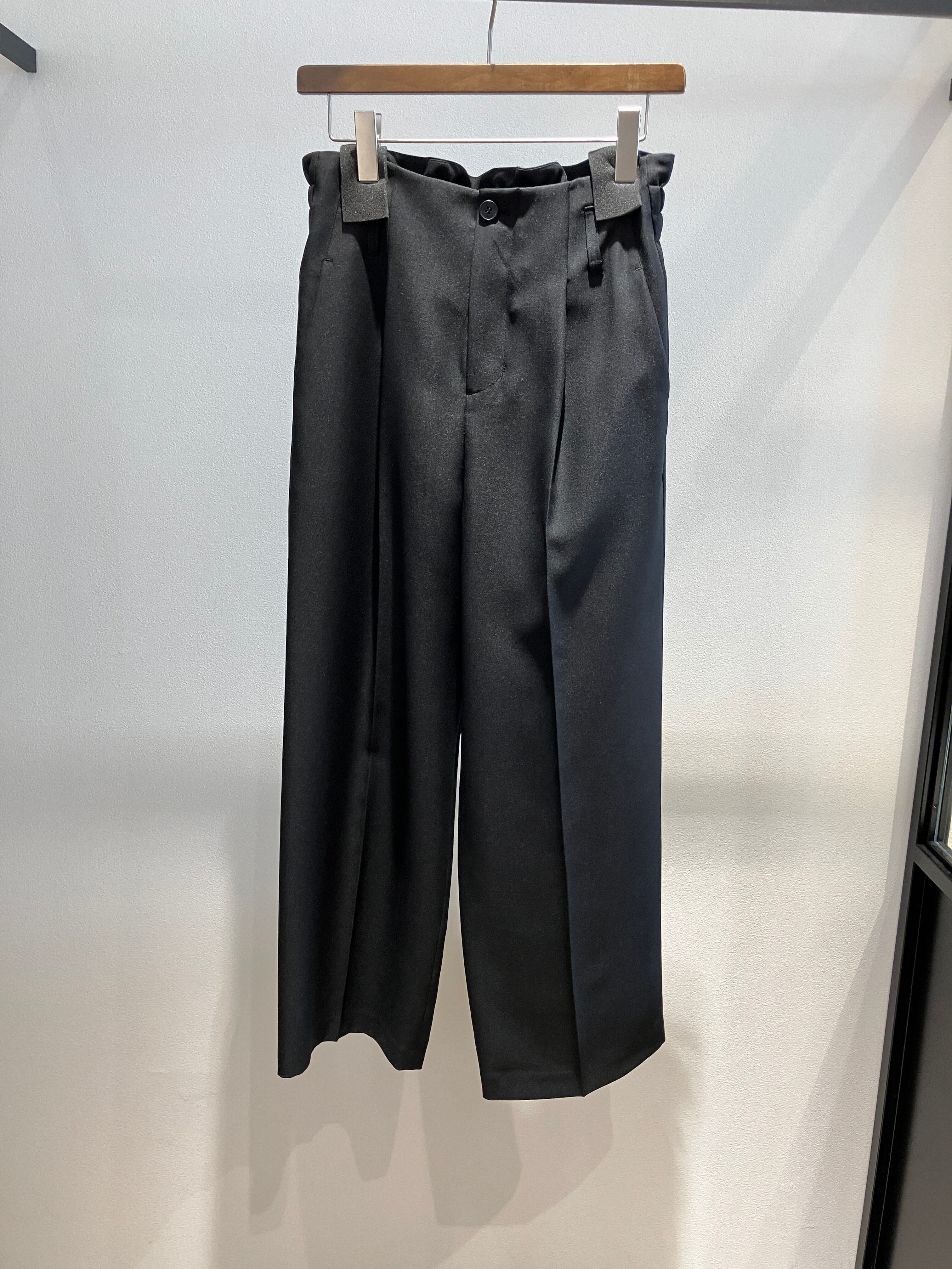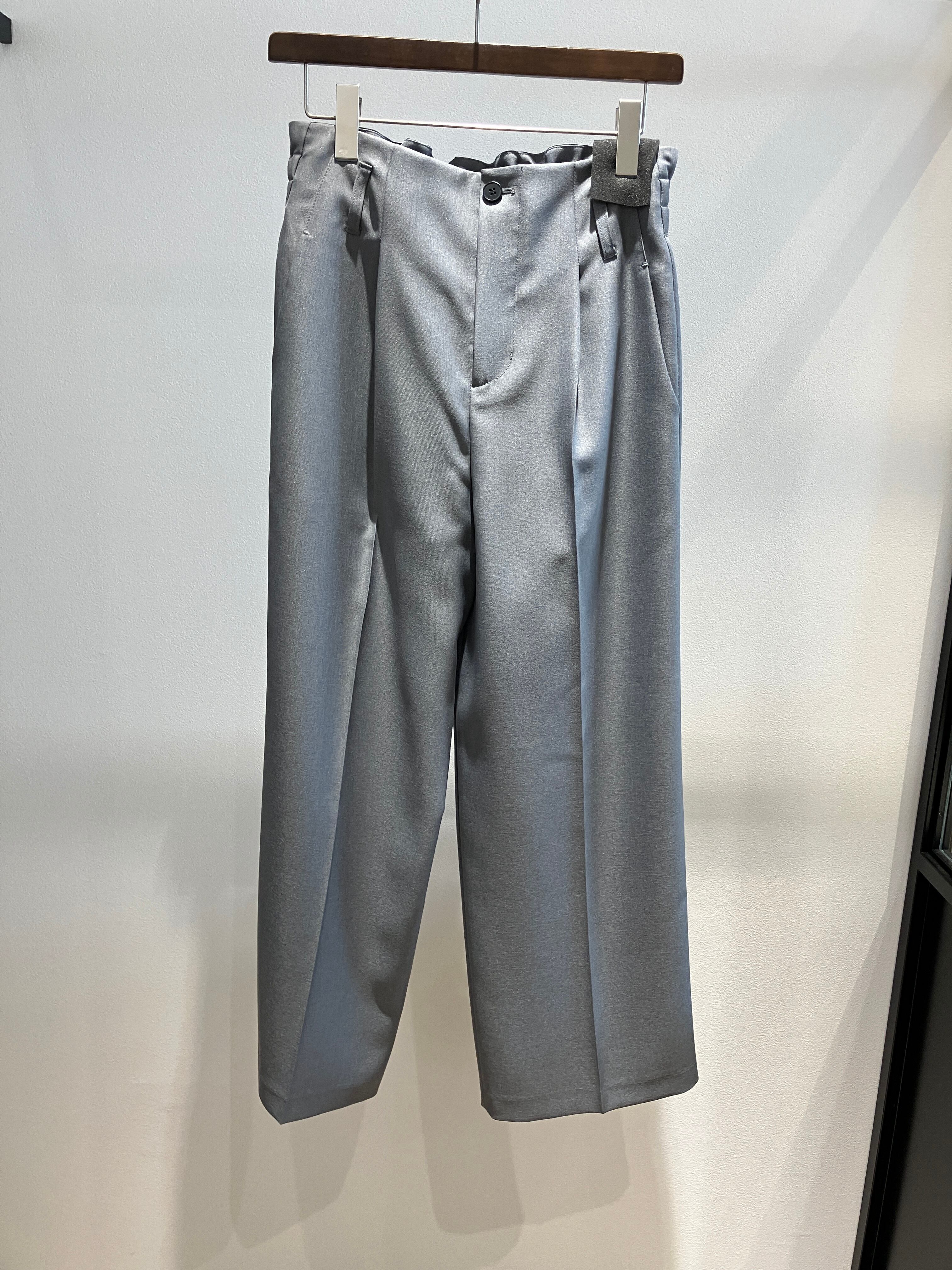 パウダリータッチのポリエステルツイルを使用したストレートパンツ。