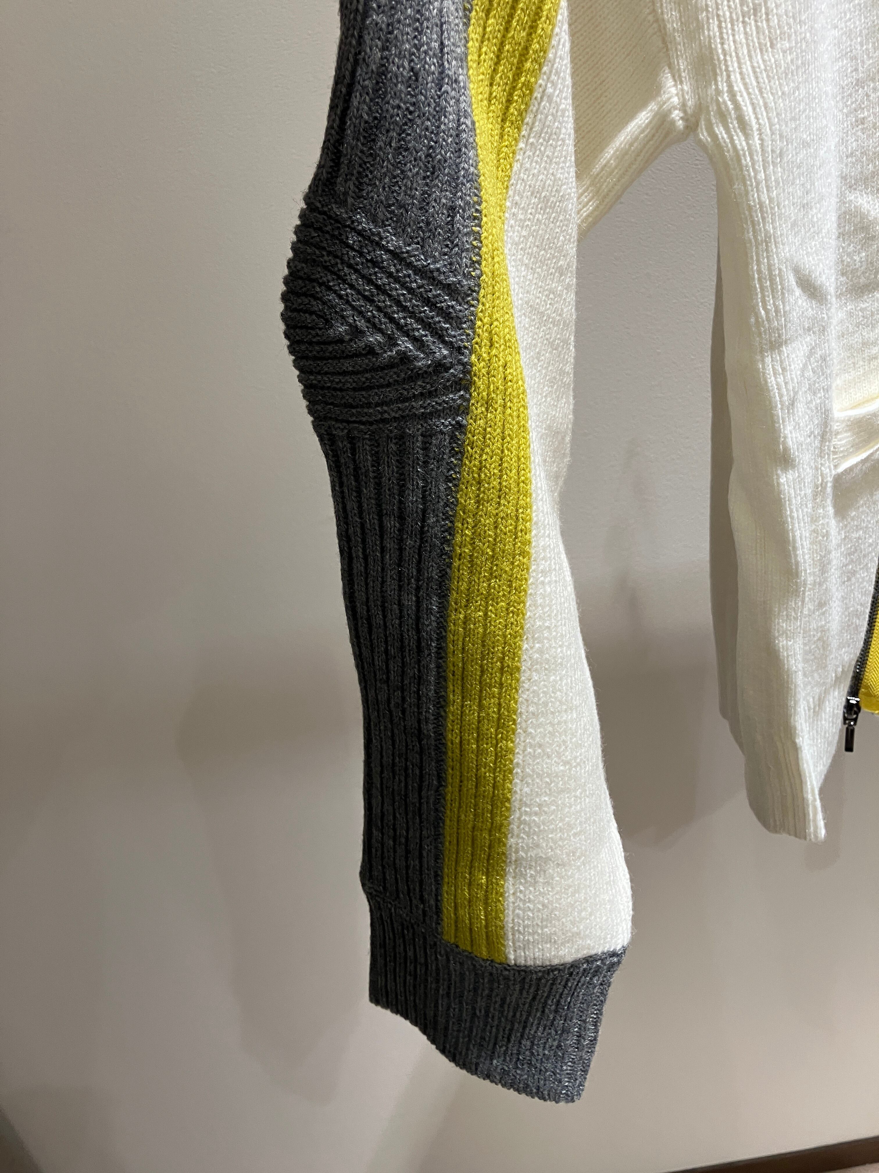 ジップを開け閉めすることでニットとしてもカーディガンとしても着回し自在なアイテムです。