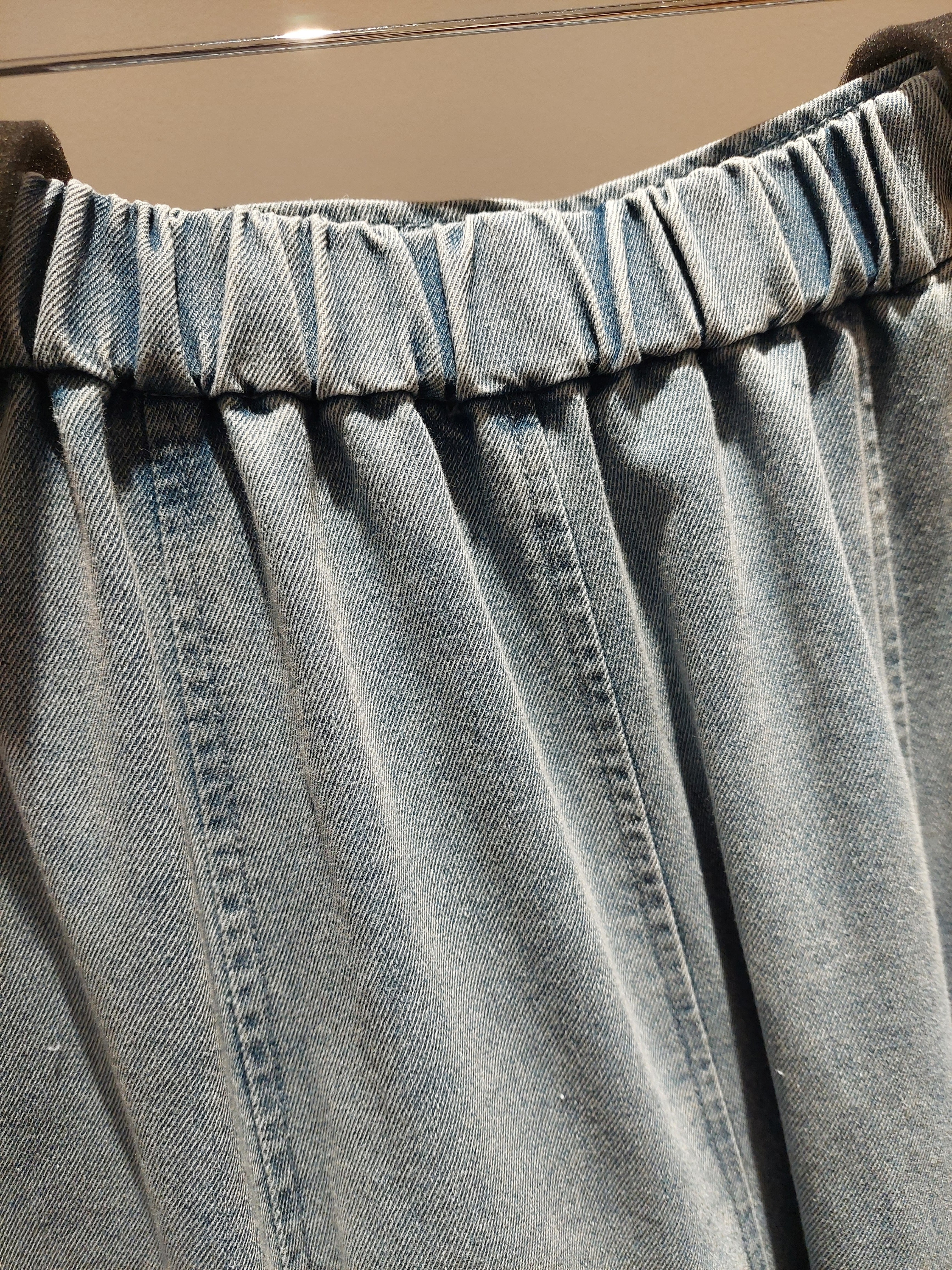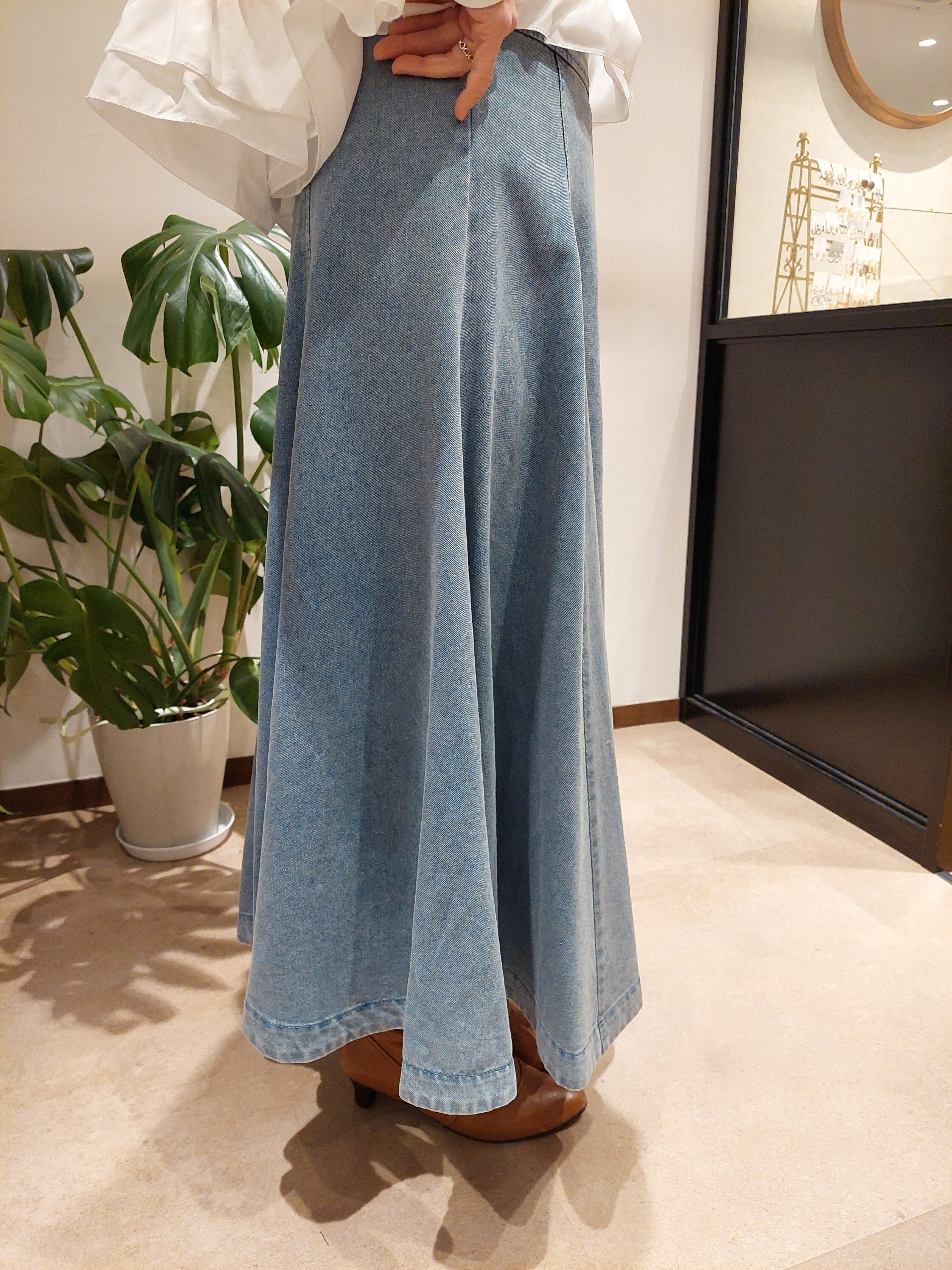 やわらかなデニム素材を使用した、動きのあるフレアシルエットが魅力のスカート。