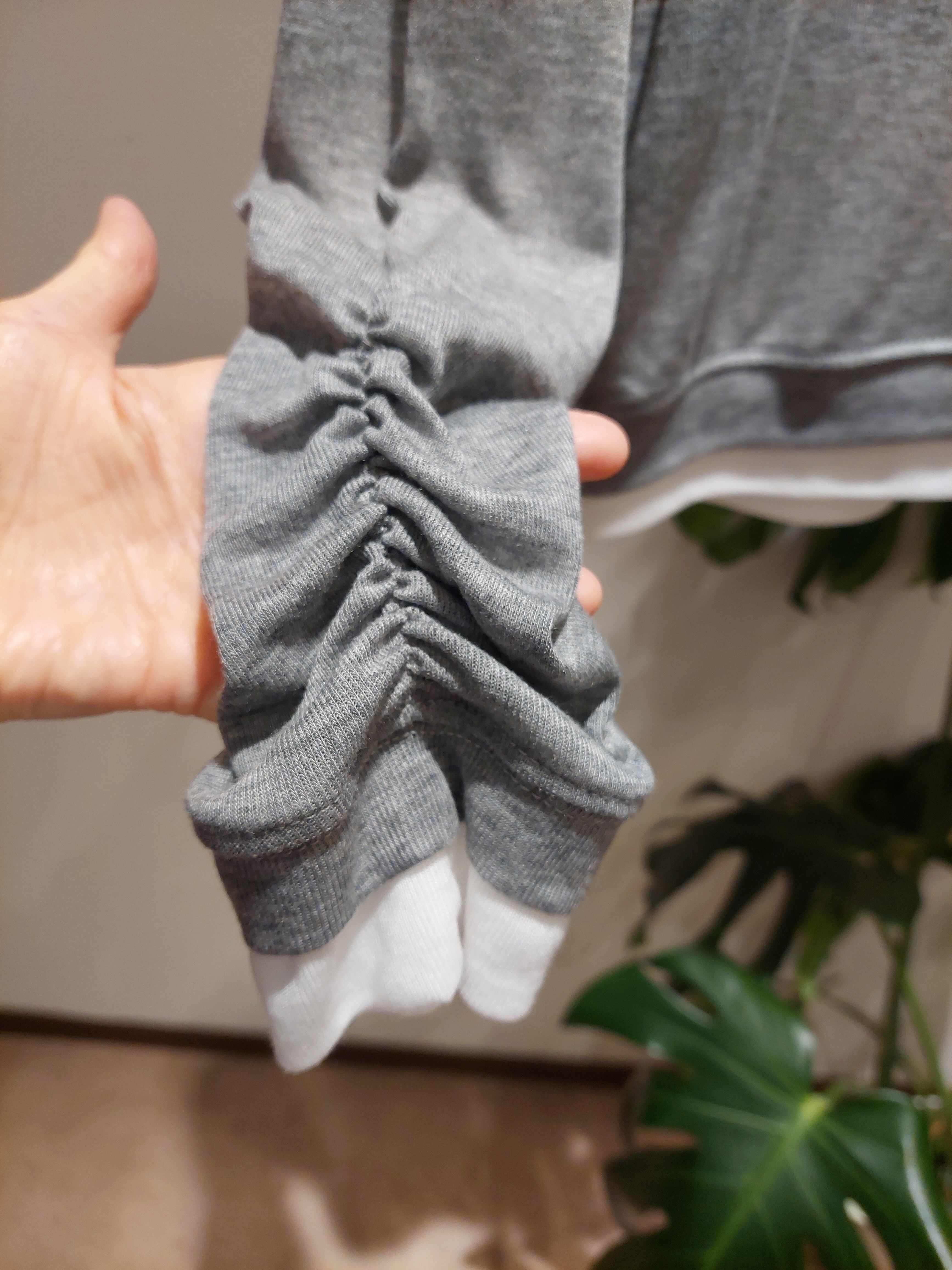 肌触りの良い日常に優しく寄りそう着心地で、お袖に施されたシャーリングもポイントに。