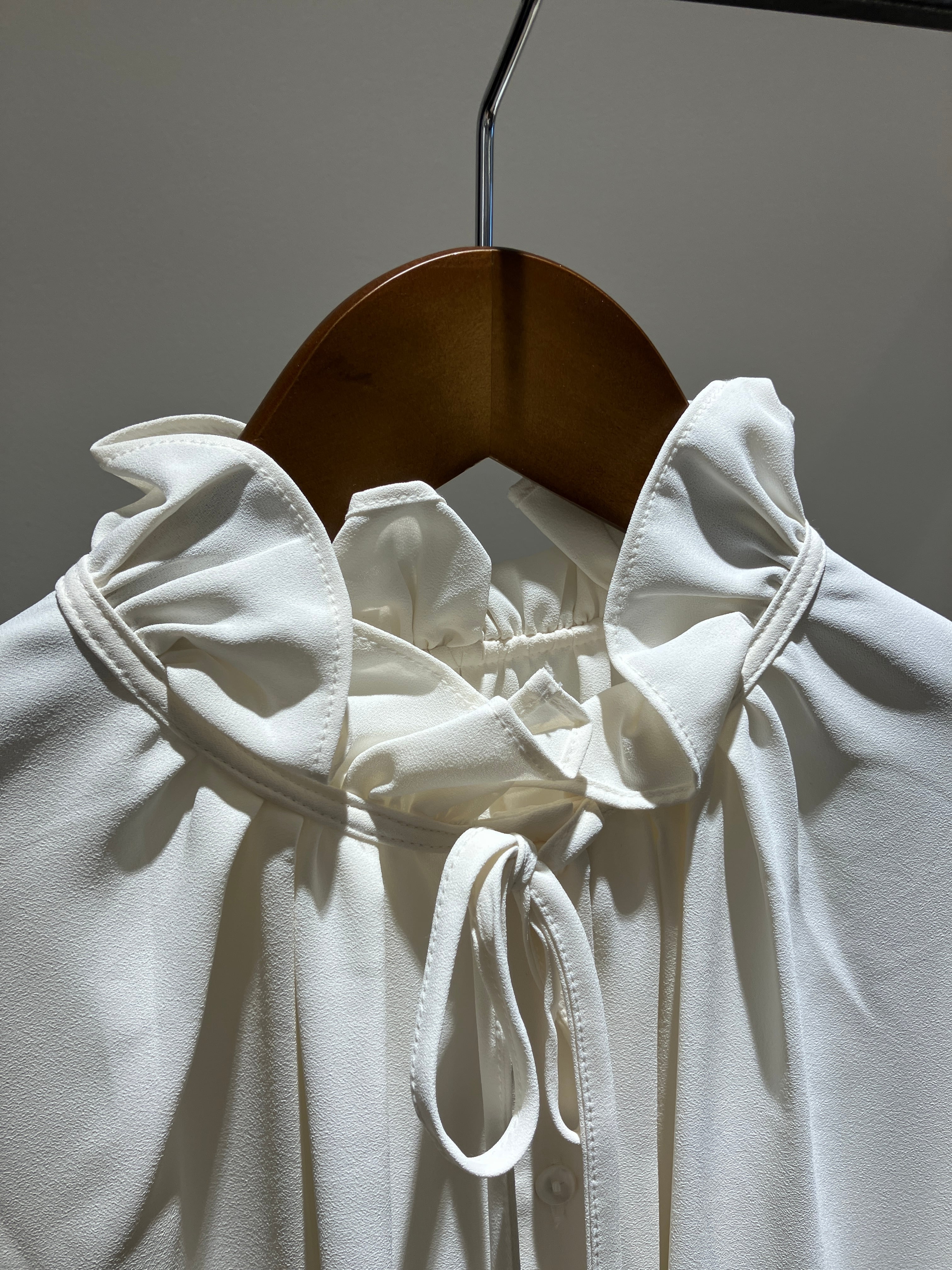 襟もとによせたフリルとギャザー、華奢リボンがpointのブラウスです。
