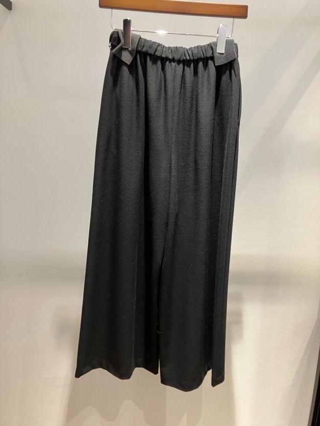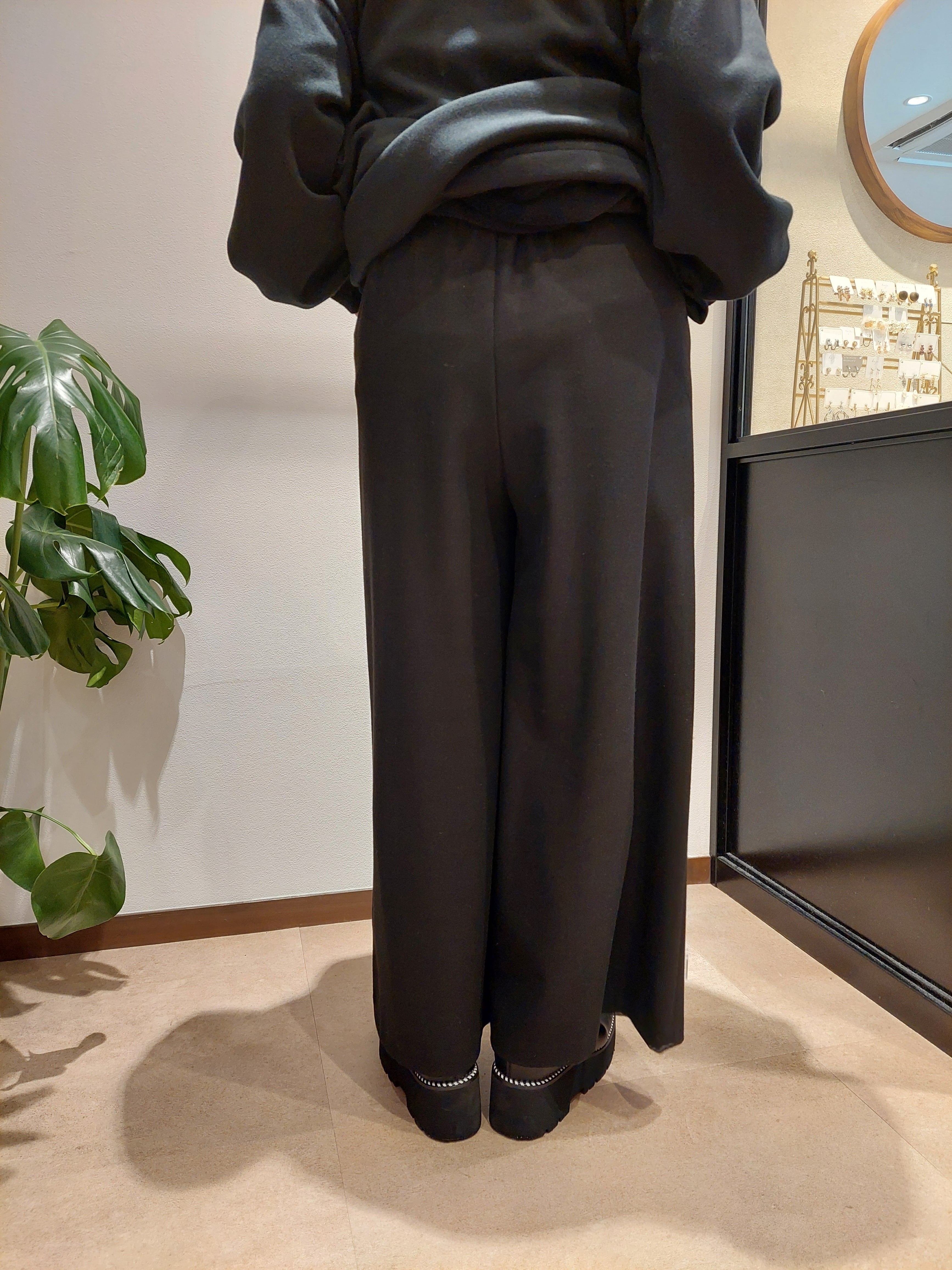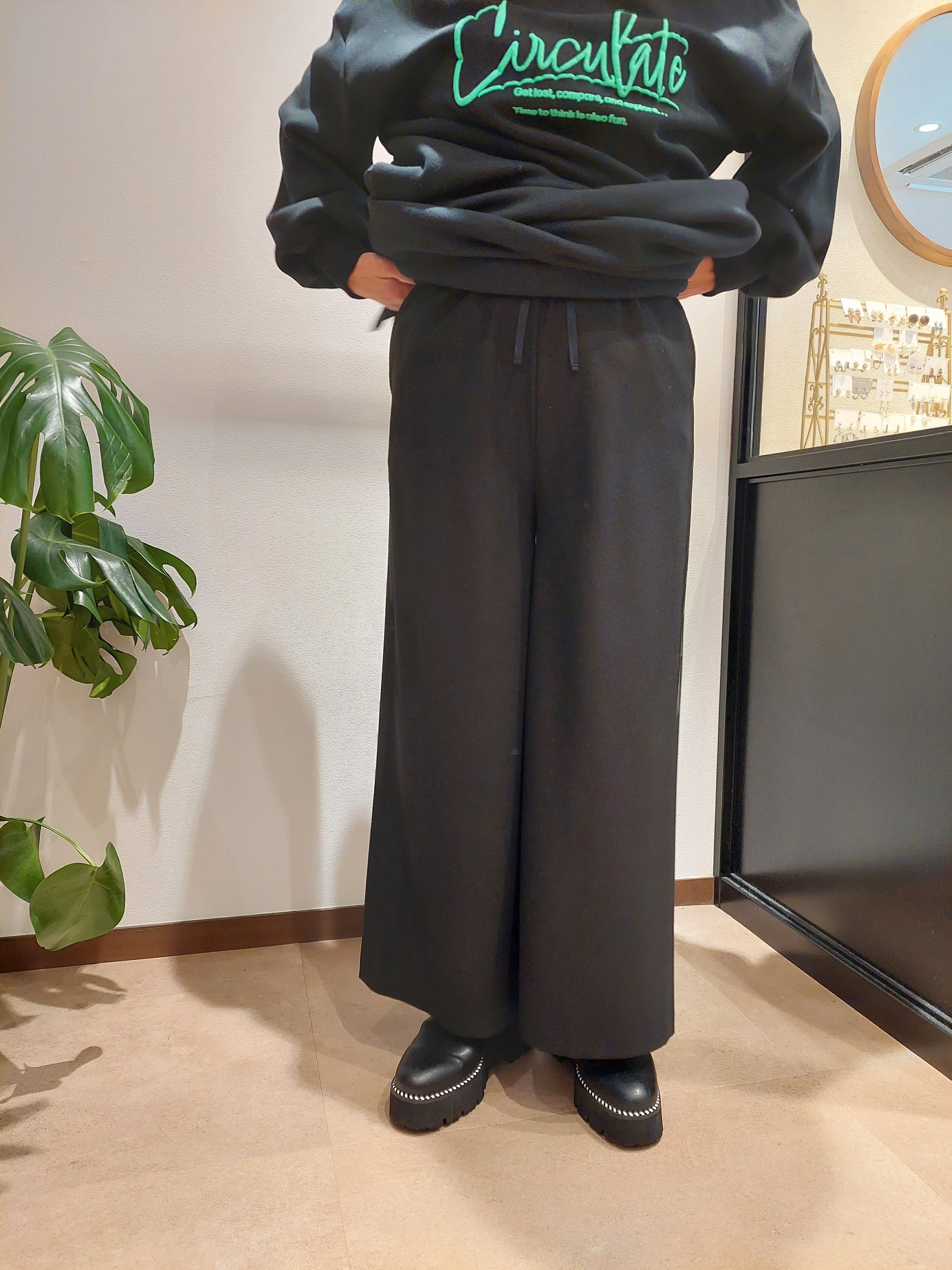 コスミカルウォームという生地を使った、落ち感のあるワイドパンツ。