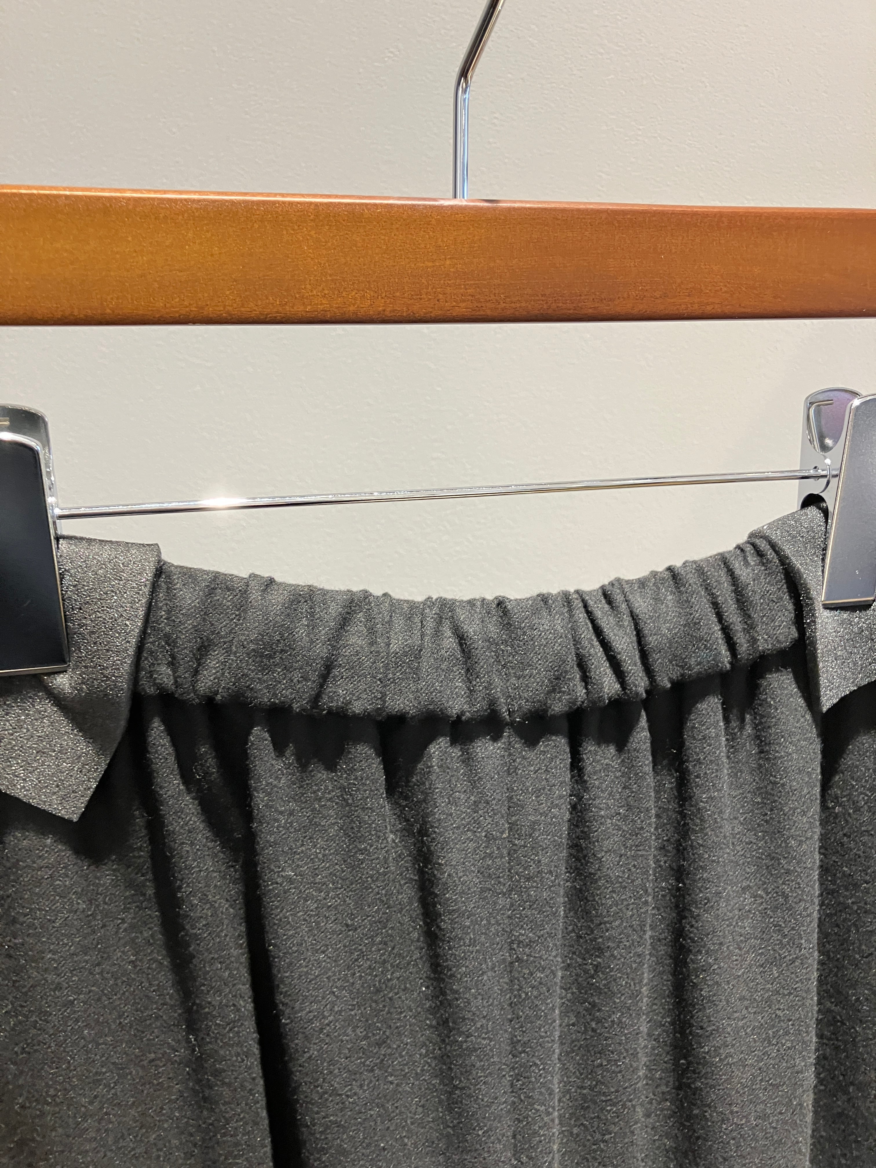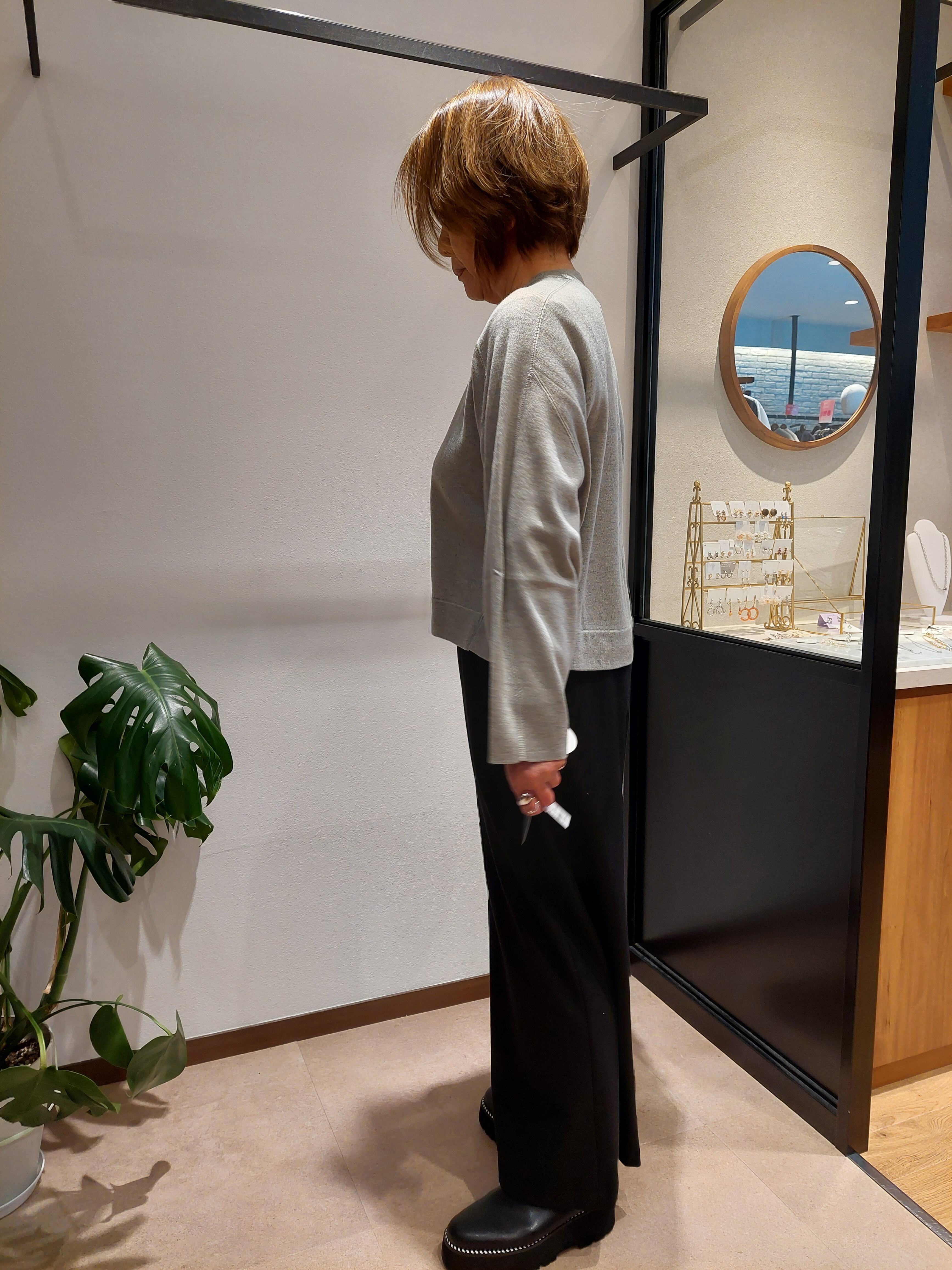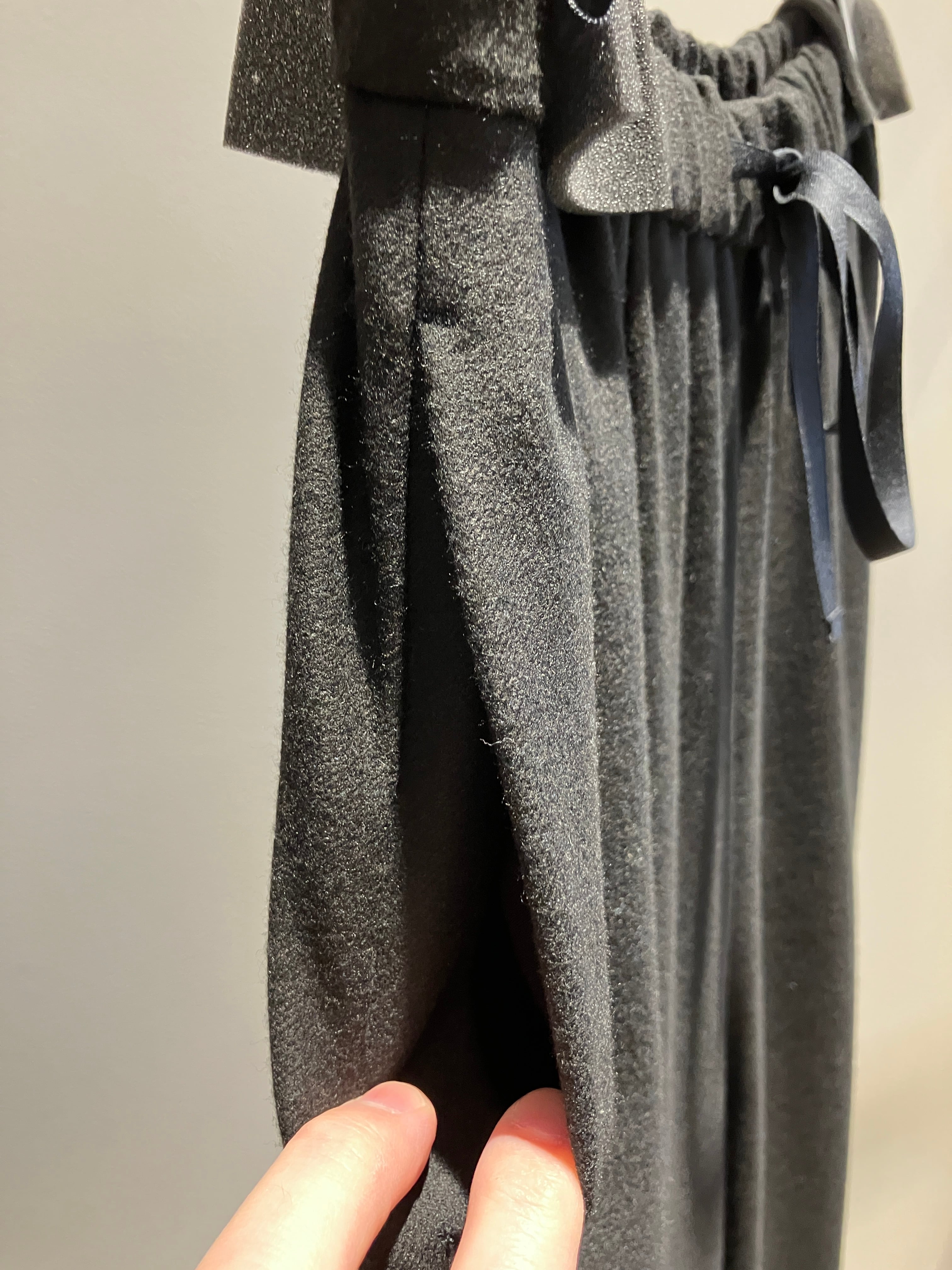 コスミカルウォームという生地を使った、落ち感のあるワイドパンツ。