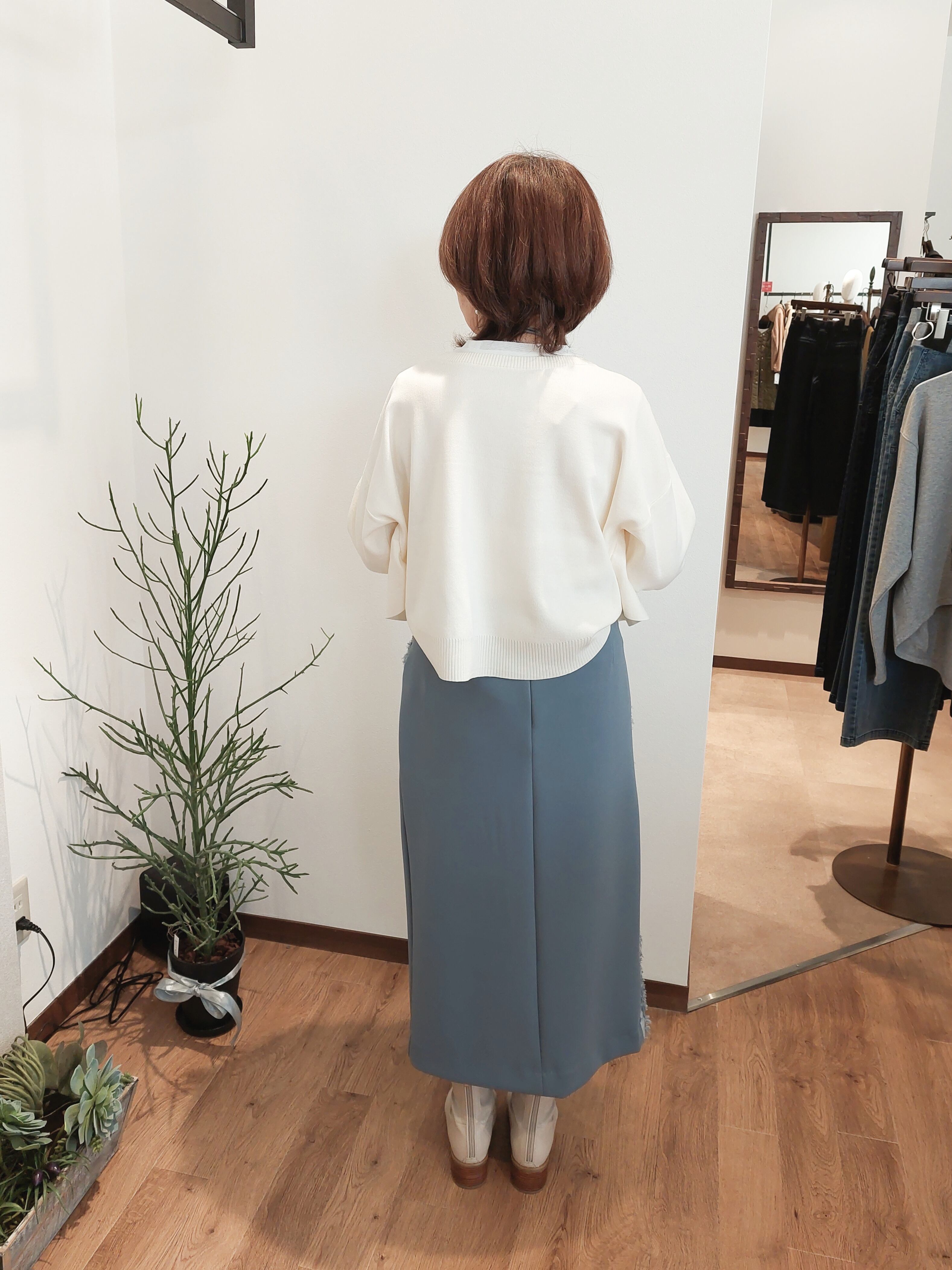 ストレートに近いタイトシルエットに仕上げているのですっきりとしたスタイルに。