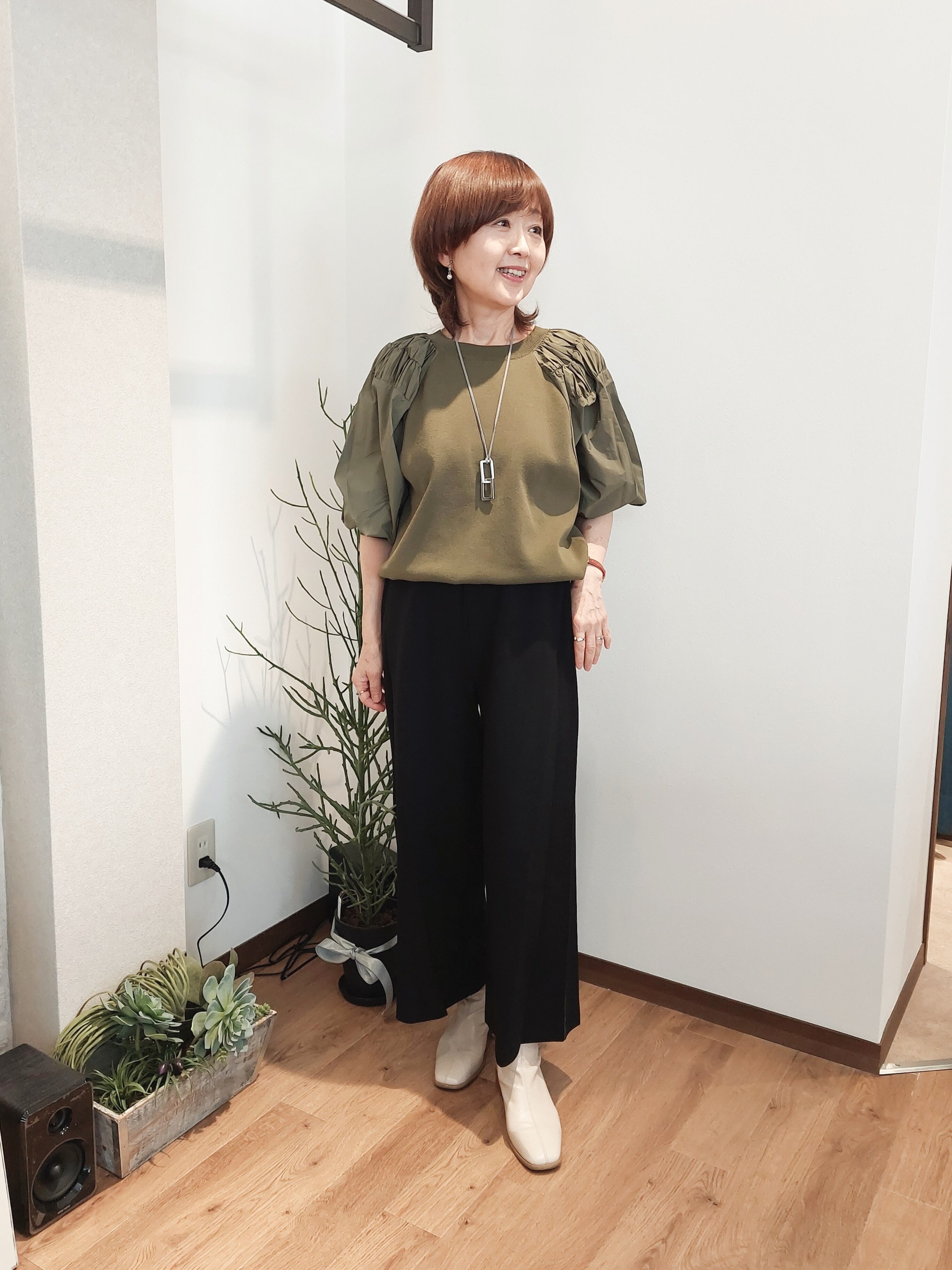 丸みをつけたボリュームスリーブは二の腕ラインのカバーにも最適。