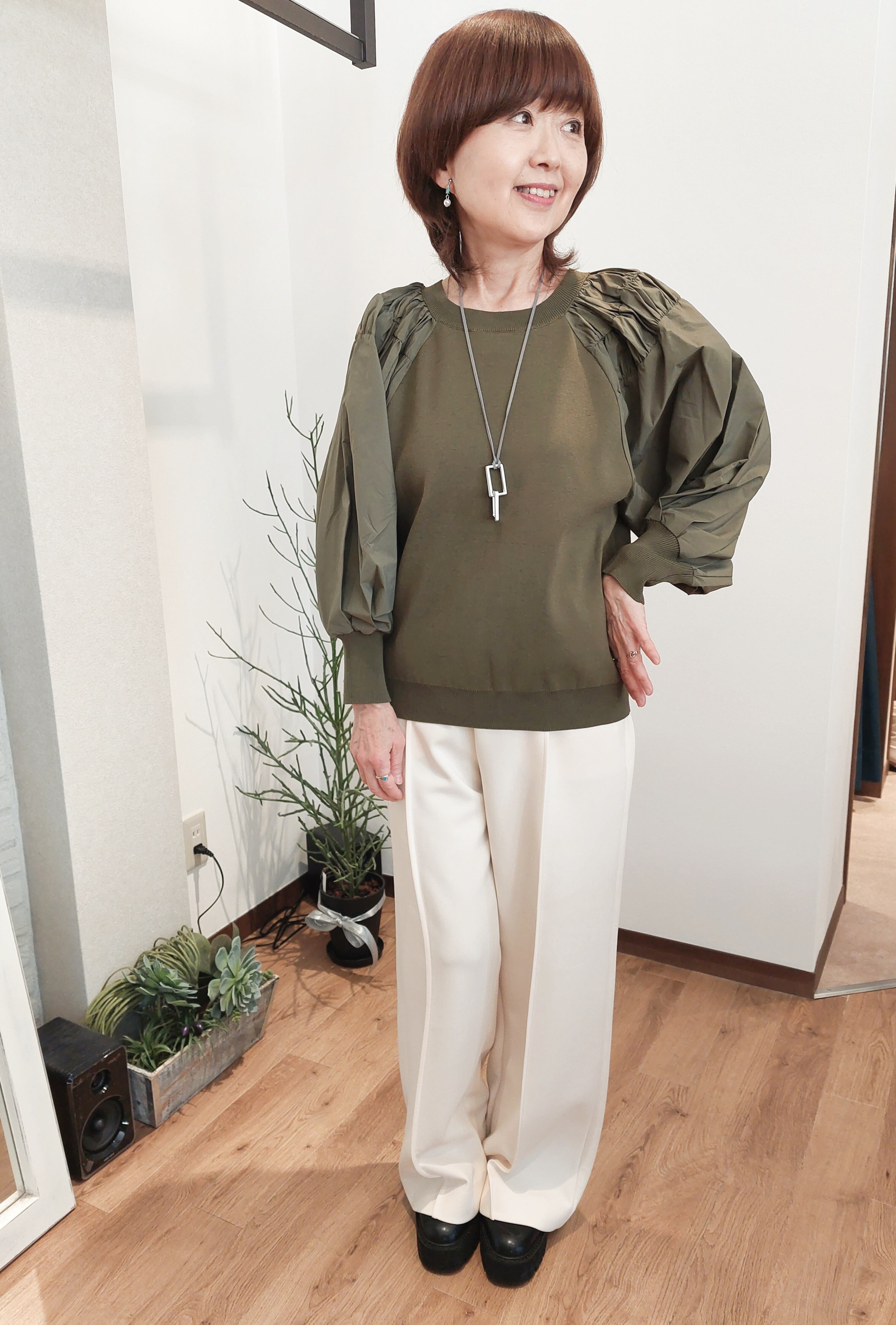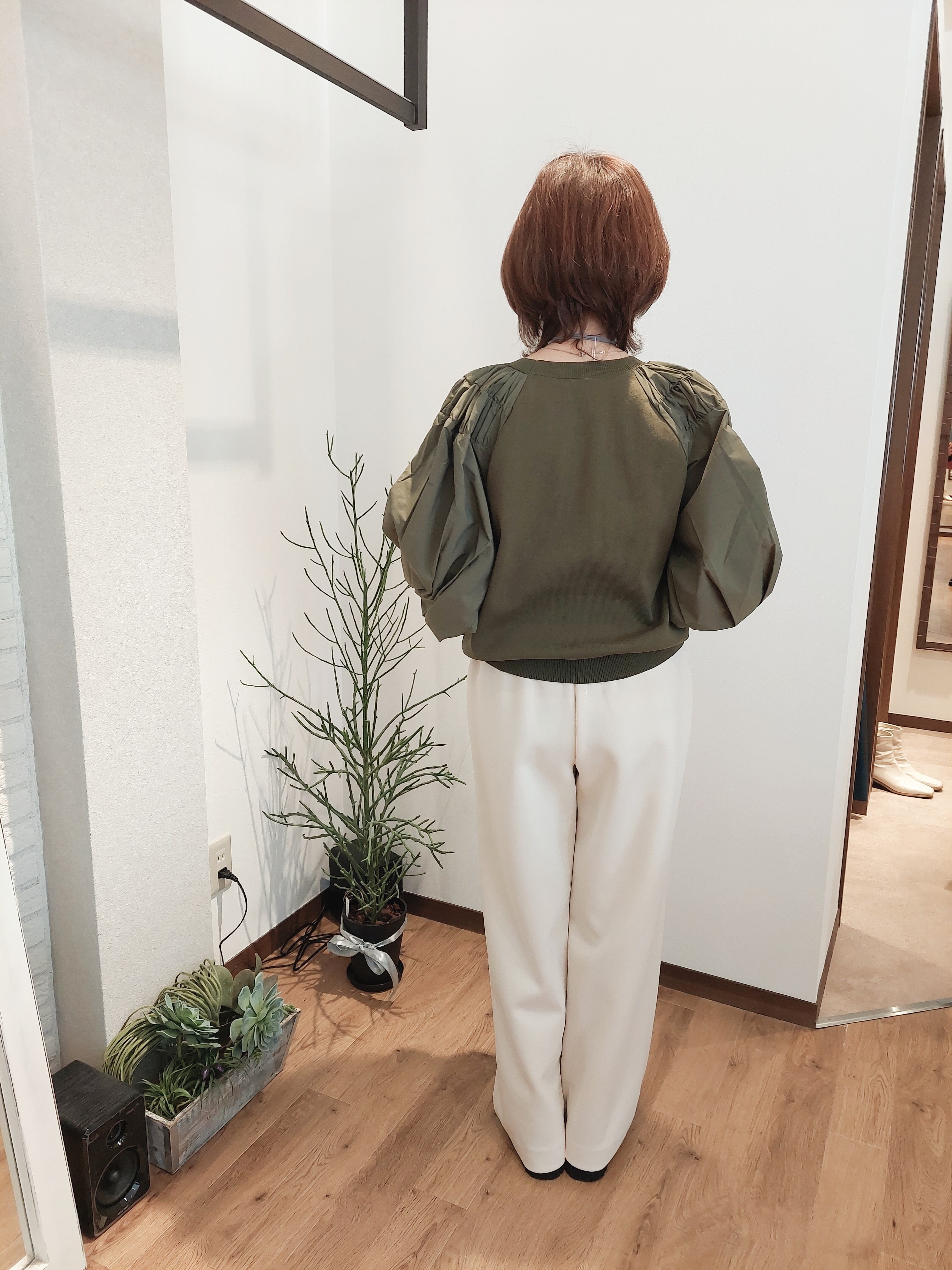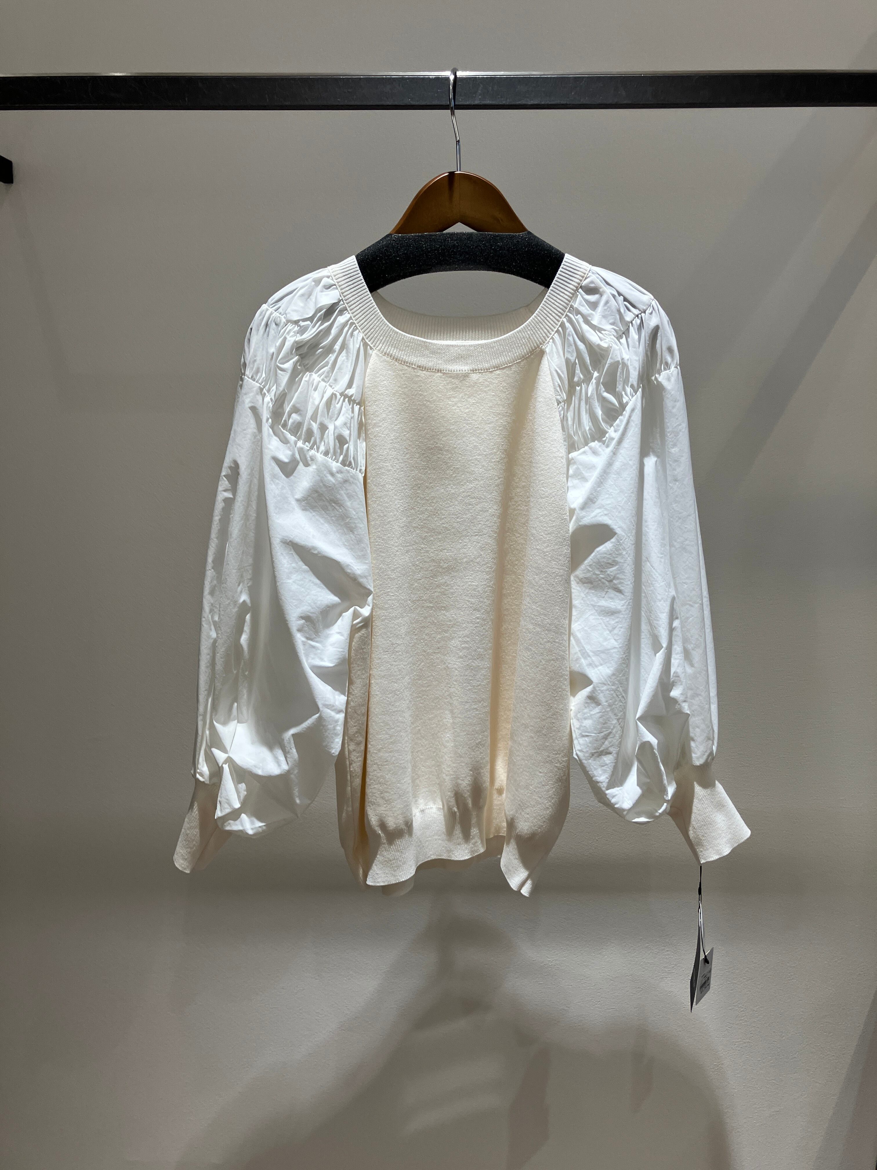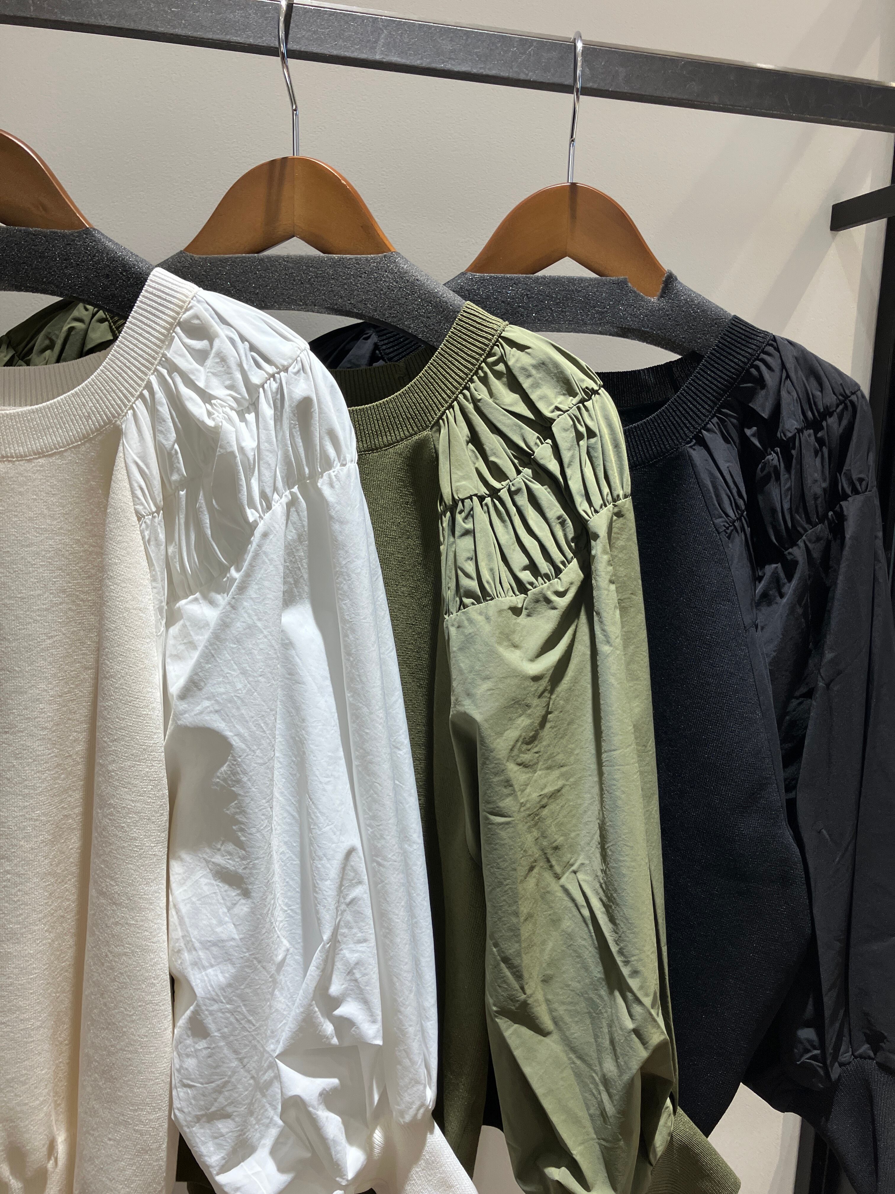 袖口ボリューム布帛切替プルオーバー。