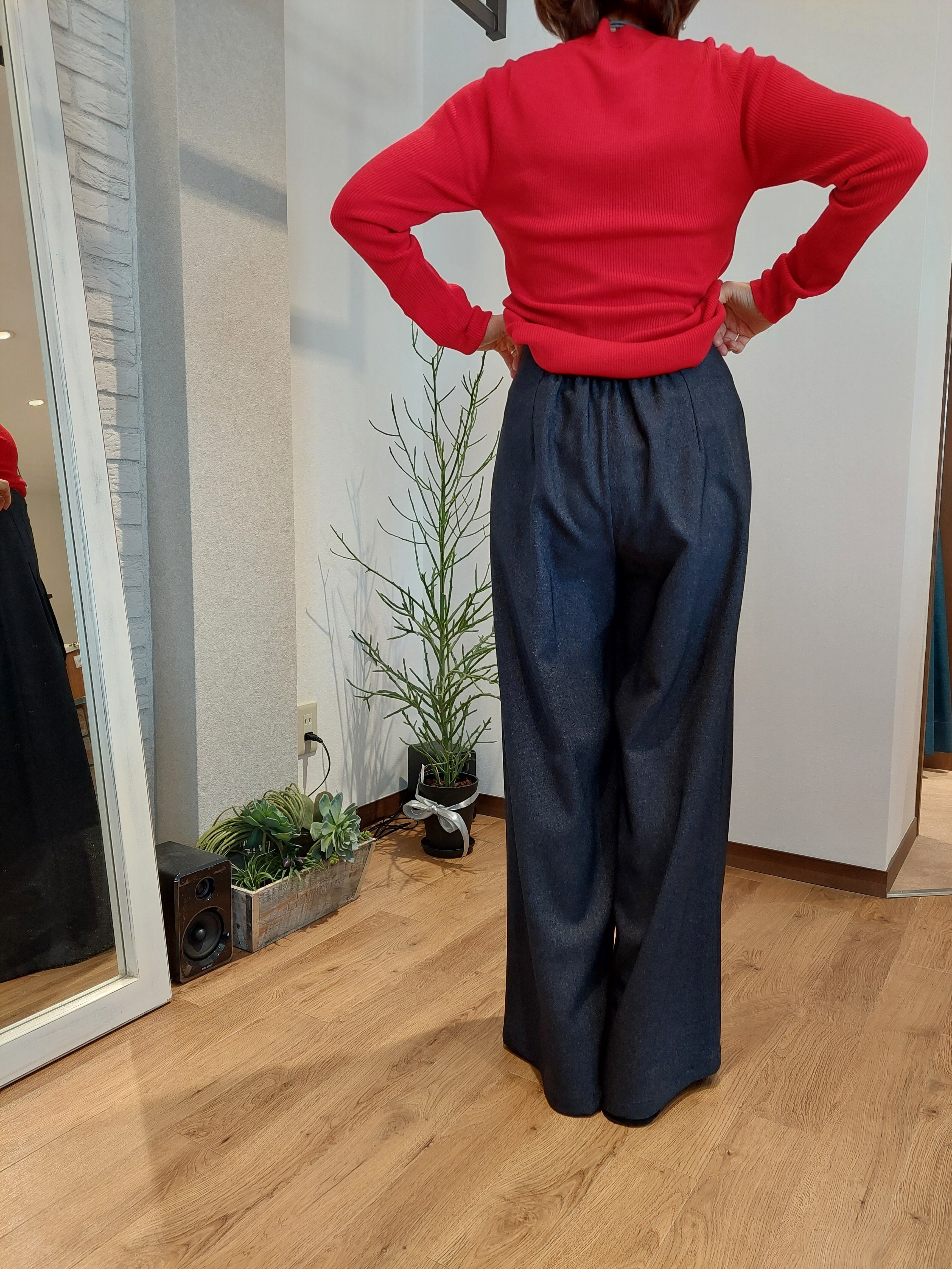 耐久撥水加工を施した素材のワイドデニムパンツ。