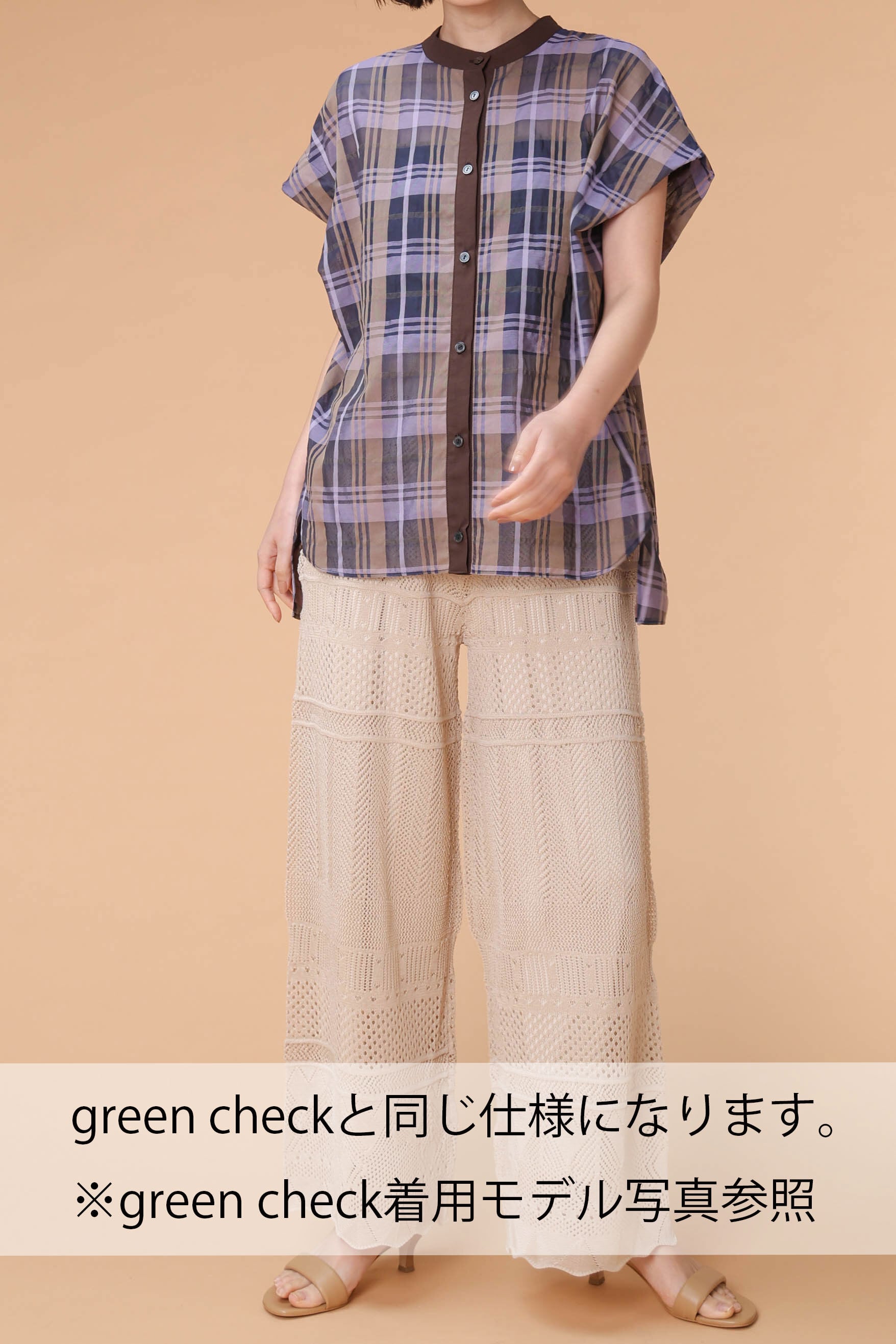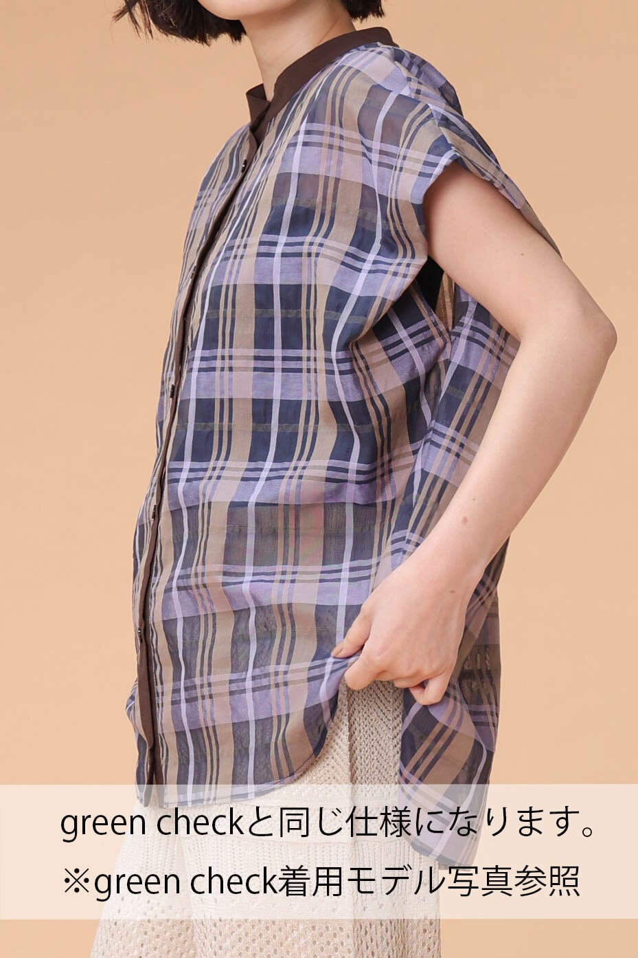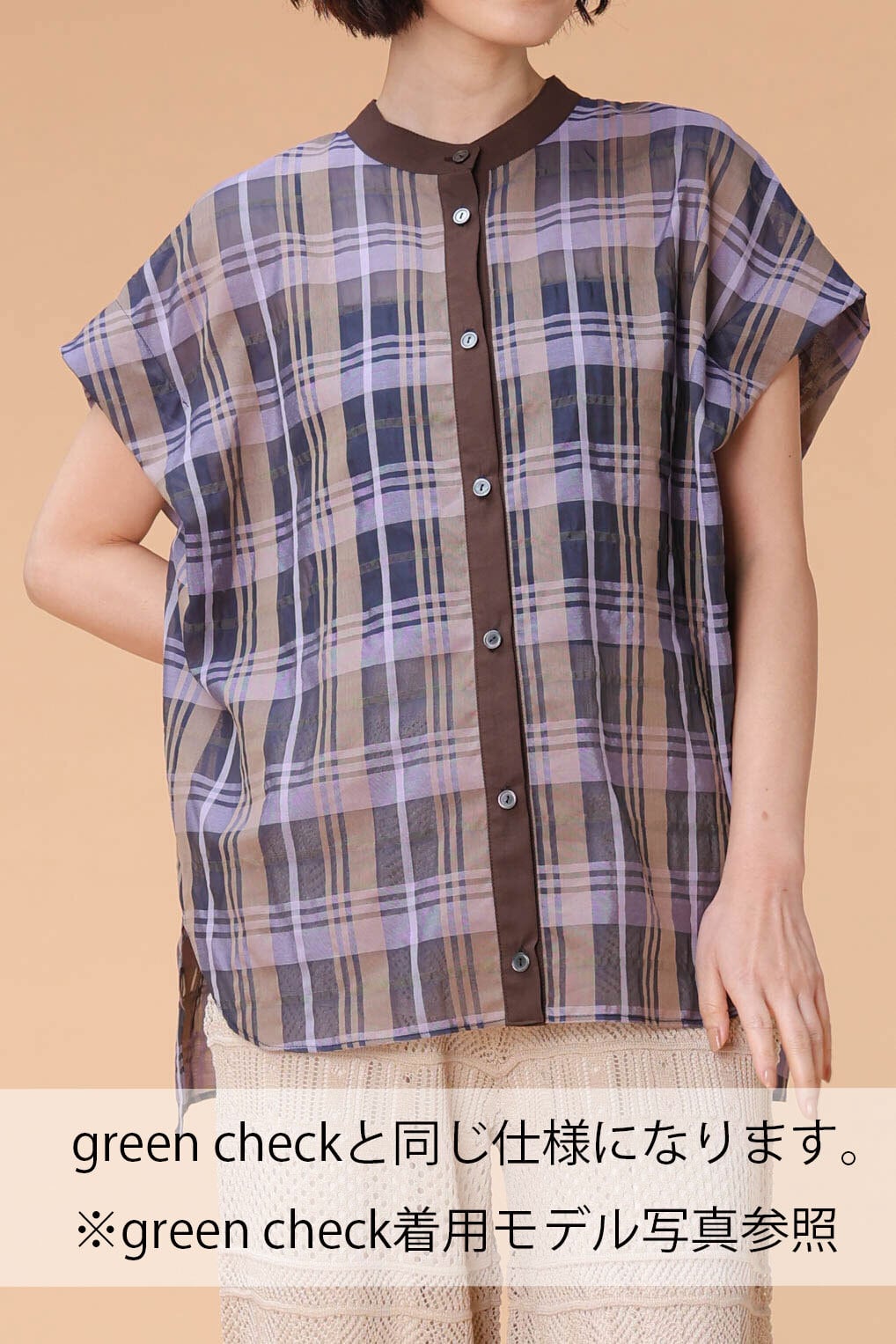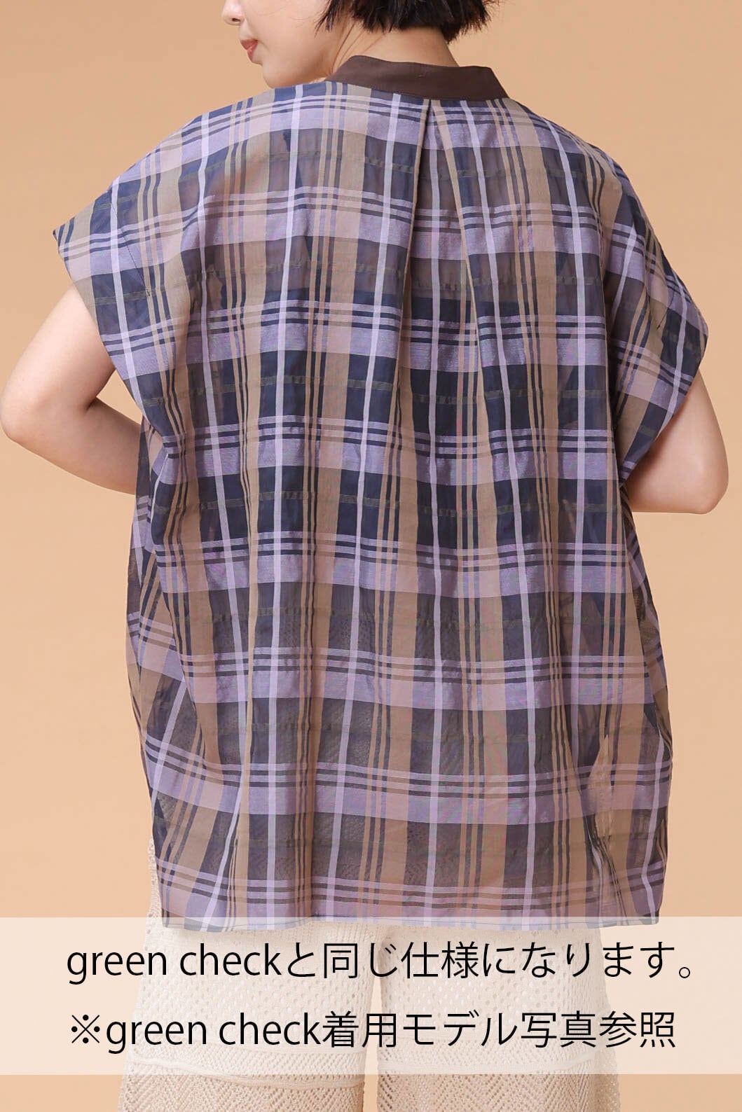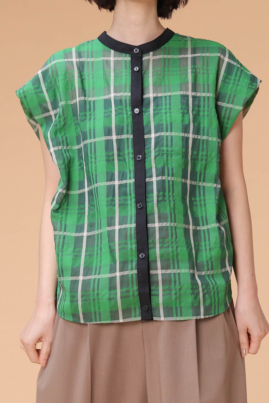 パッと目を引く鮮やかなチェック柄に、トレンドのシアー感を掛け合わせた、軽やかな表情のブラウス。肩のラインを華奢に見せるフレンチスリーブと、フロントを走る黒のラインが、全体を品よく都会的な印象に引き締めます。さらりとした肌触りで涼しく、夏のカジュアルスタイルを爽やかに彩る主役級のアイテムです。