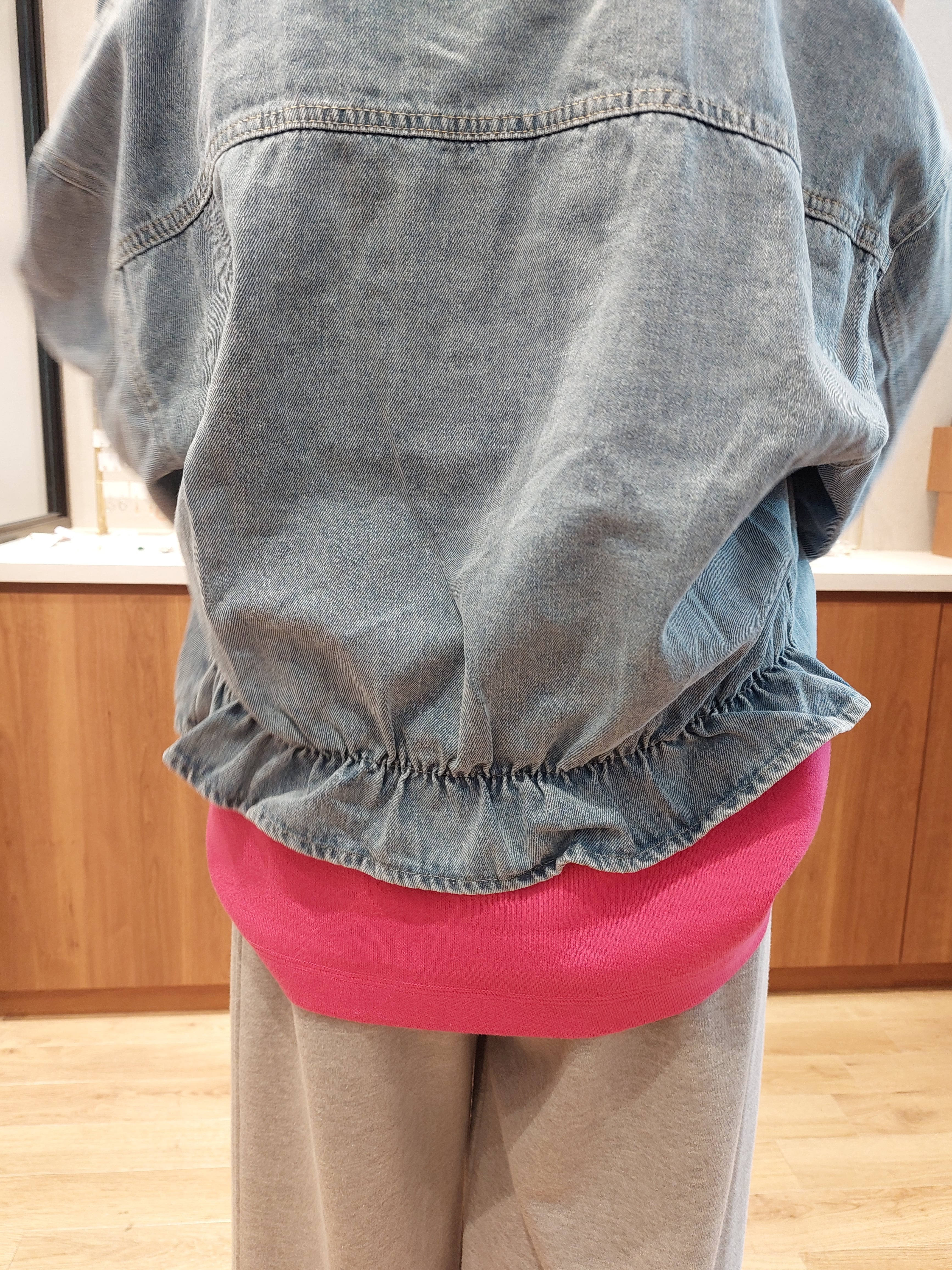 すっきりとした襟元が洗練された印象を与える、ノーカラーのデニムジャケット。裾部分にゴムを配し、さらに後ろはギャザーを寄せることで、デニムのタフな質感にふんわりとした女性らしい丸みをプラスしました。トレンド感のあるショート丈は、ワンピースやハイウエストボトムスとも相性抜群で、スタイルアップを叶えつつバックスタイルまで印象的に見せてくれる一着です。