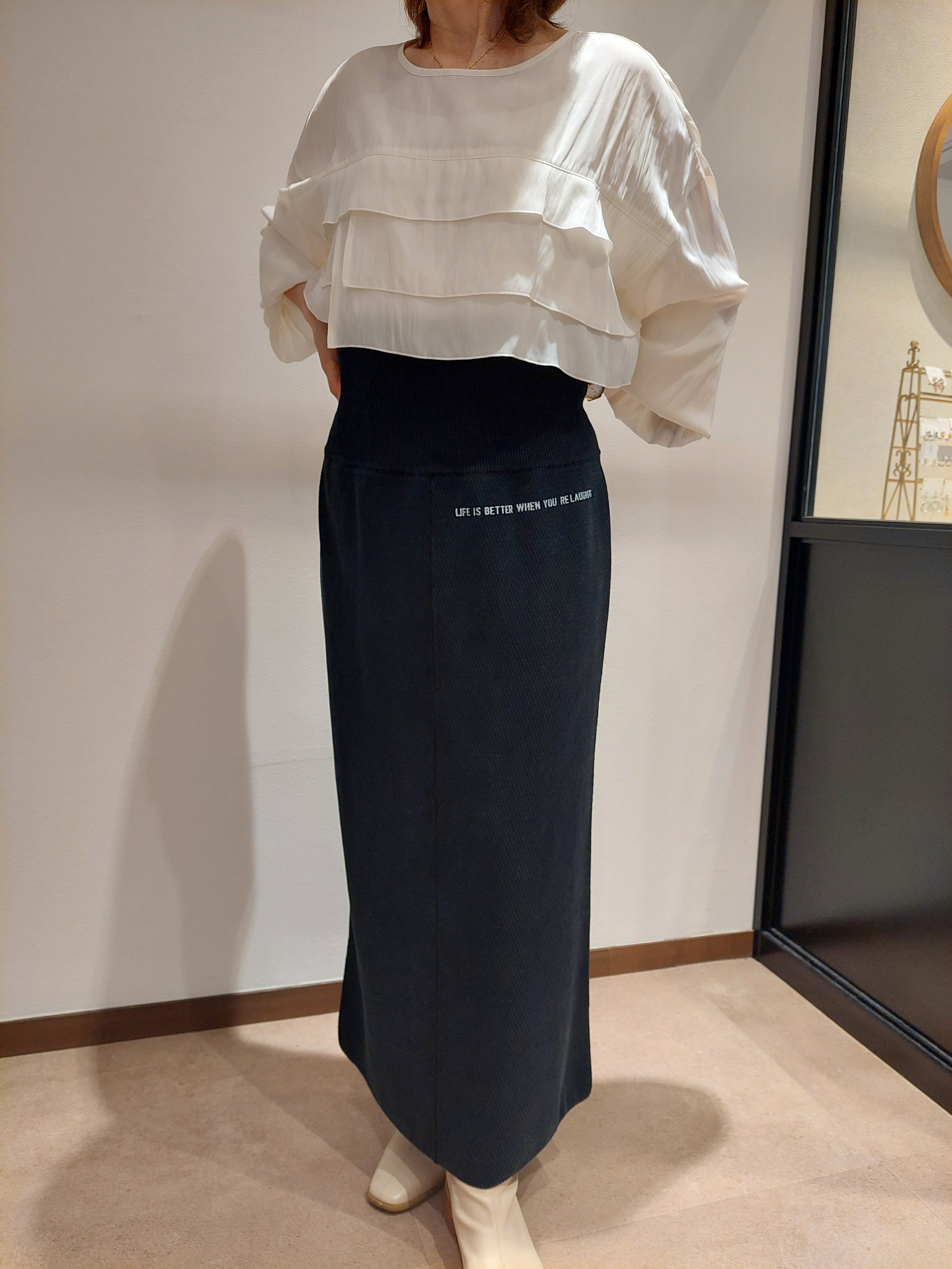 ハニカムワッフル素材を使用した、リラックス感と上品さを兼ね備えたロングスカート。