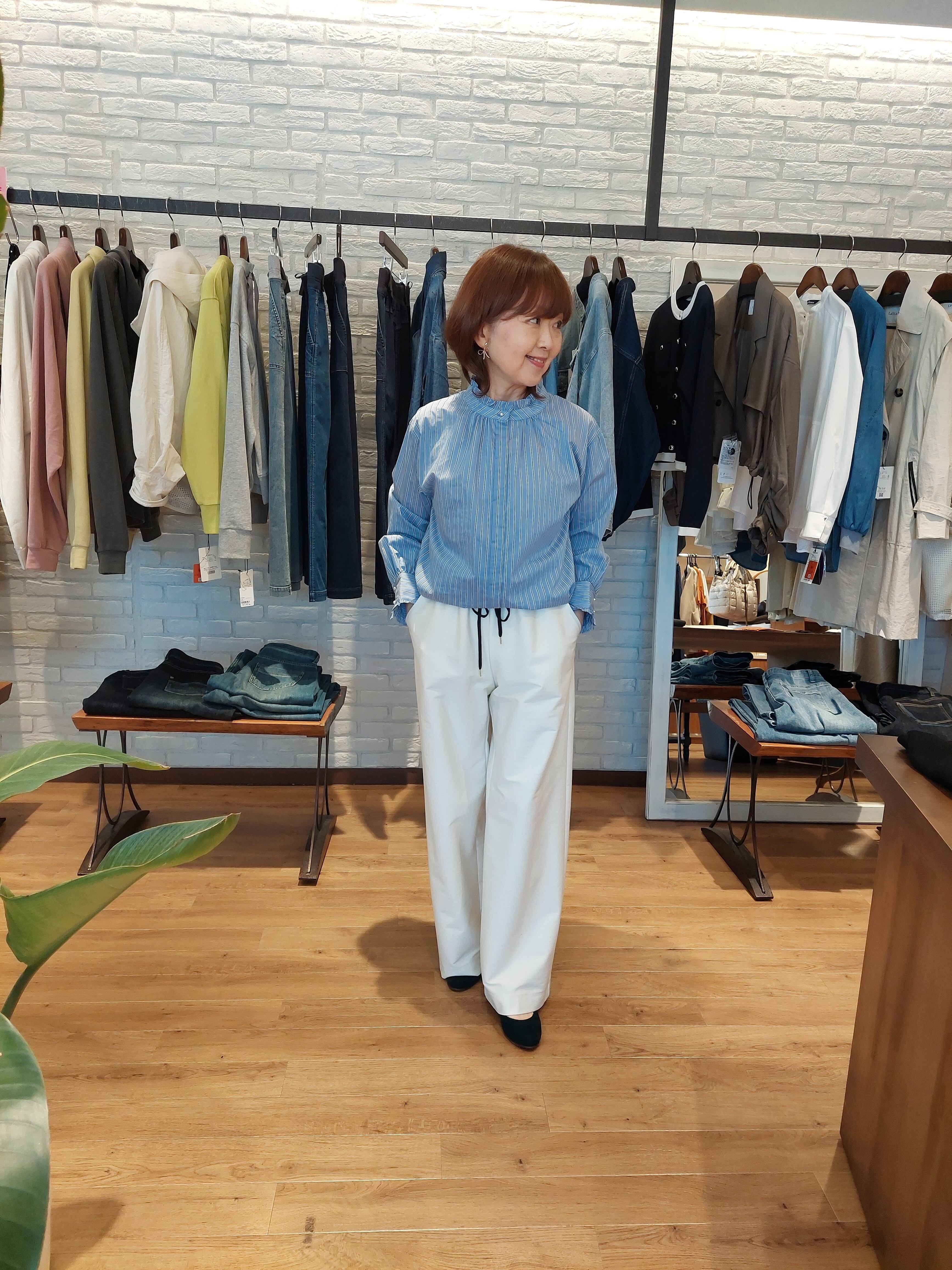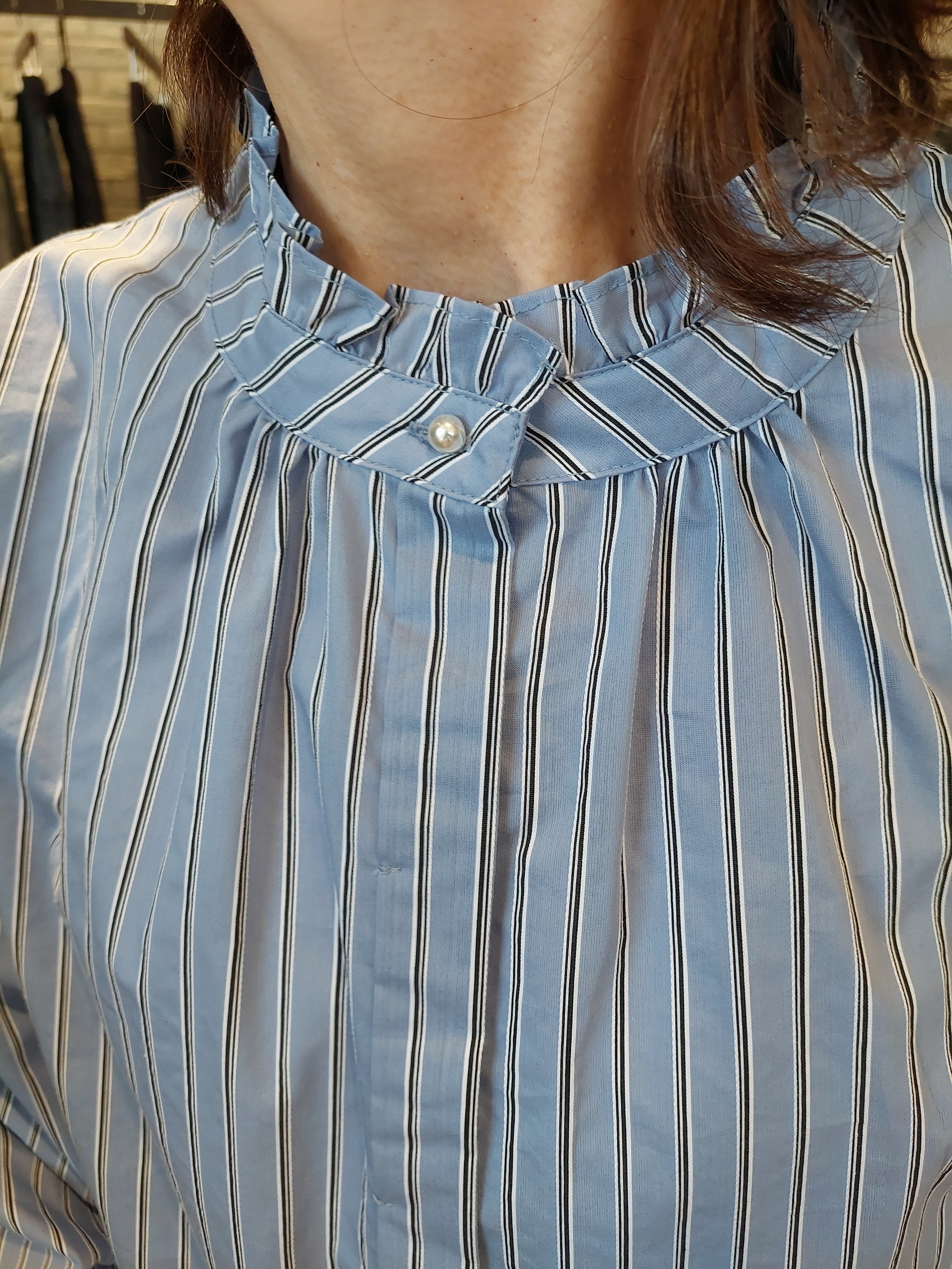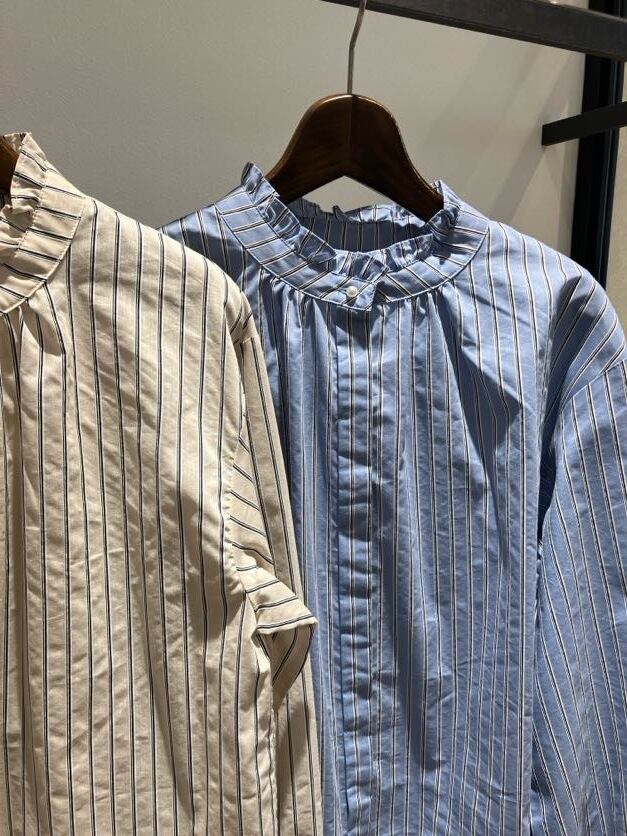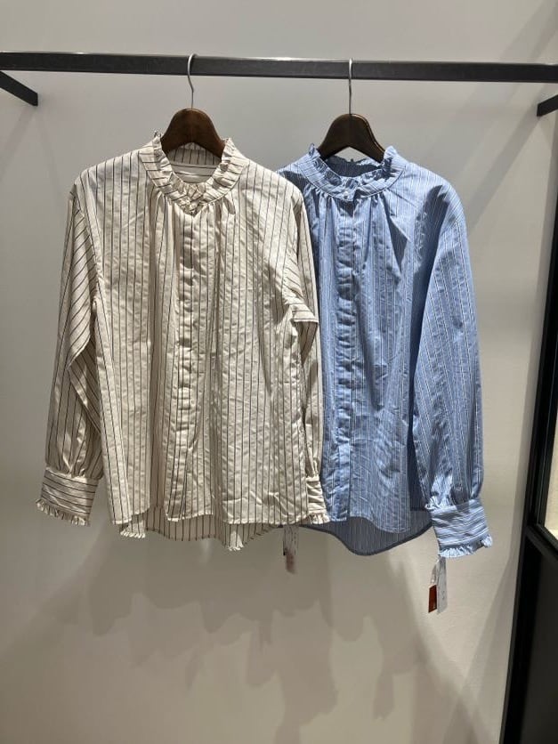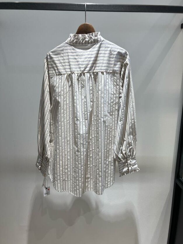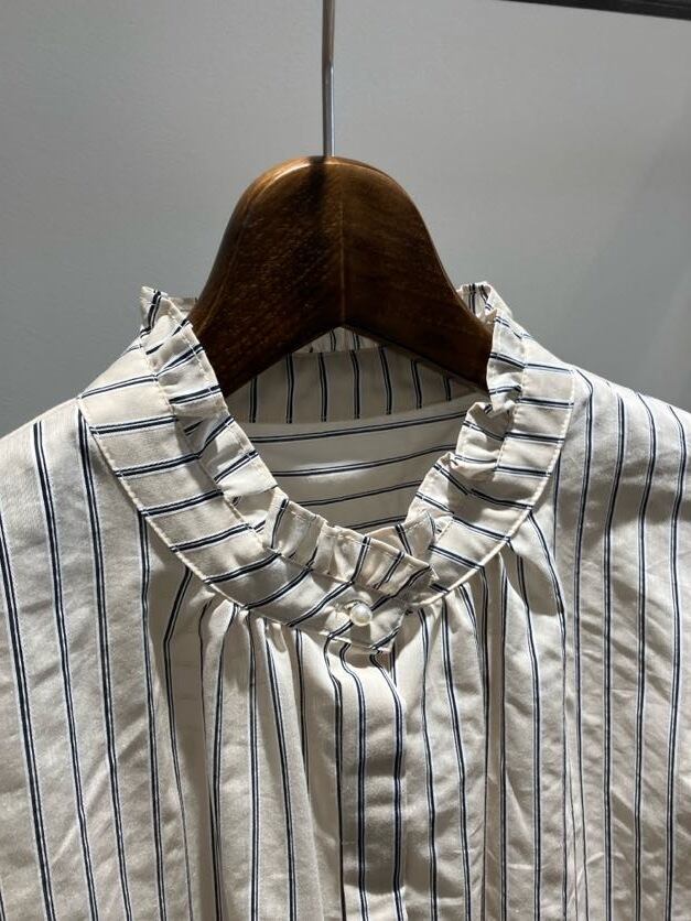 爽やかなストライプ柄に、フェミニンなディテールを散りばめた主役級シャツ。首回りと袖口にたっぷりと施されたギャザーが、程よいボリューム感と柔らかなニュアンスを演出します。フロントの一番上のボタンにはパールをあしらい、顔まわりに上品な華やぎをプラス。マニッシュになりがちなストライプシャツを、女性らしくエレガントに昇華させた、春の装いにふさわしい一着です。