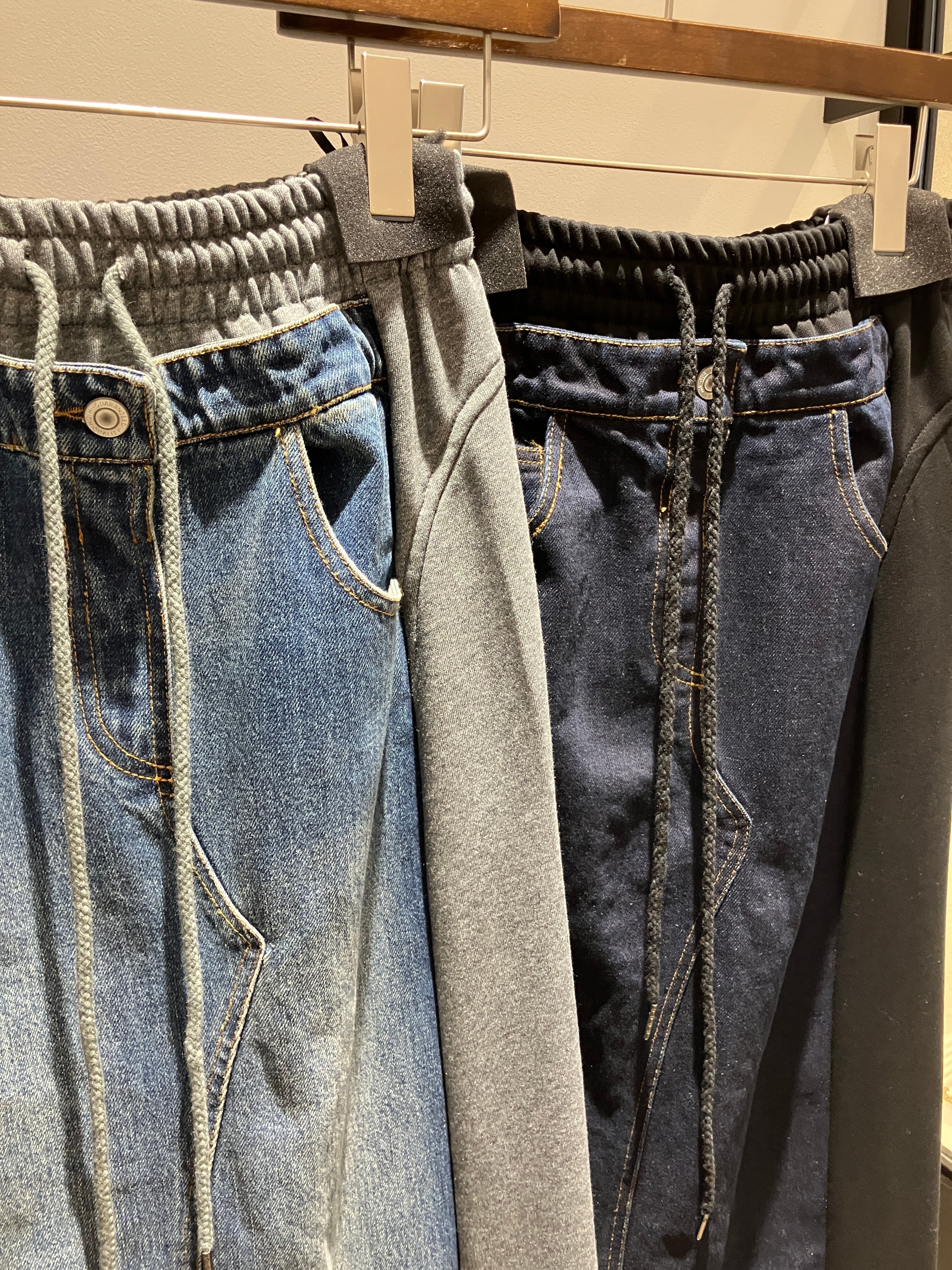 前身頃に12ozの本格的なデニムをドッキングさせた、リメイク風のデザインが目を引くロングスカート。サイドから後ろ身頃にかけては柔らかい裏毛生地を使用することで、デニム特有のゴワつきを解消し、スウェットパンツのようなリラクシーな穿き心地を実現しました。カジュアルな素材使いながらも、広がりすぎないストレートなシルエットが都会的な印象をキープ。ウエストゴム仕様で動きやすく、シンプルなトップスを合わせるだけで「ひと癖ある」お洒落が完成する、主役級のスカートです。