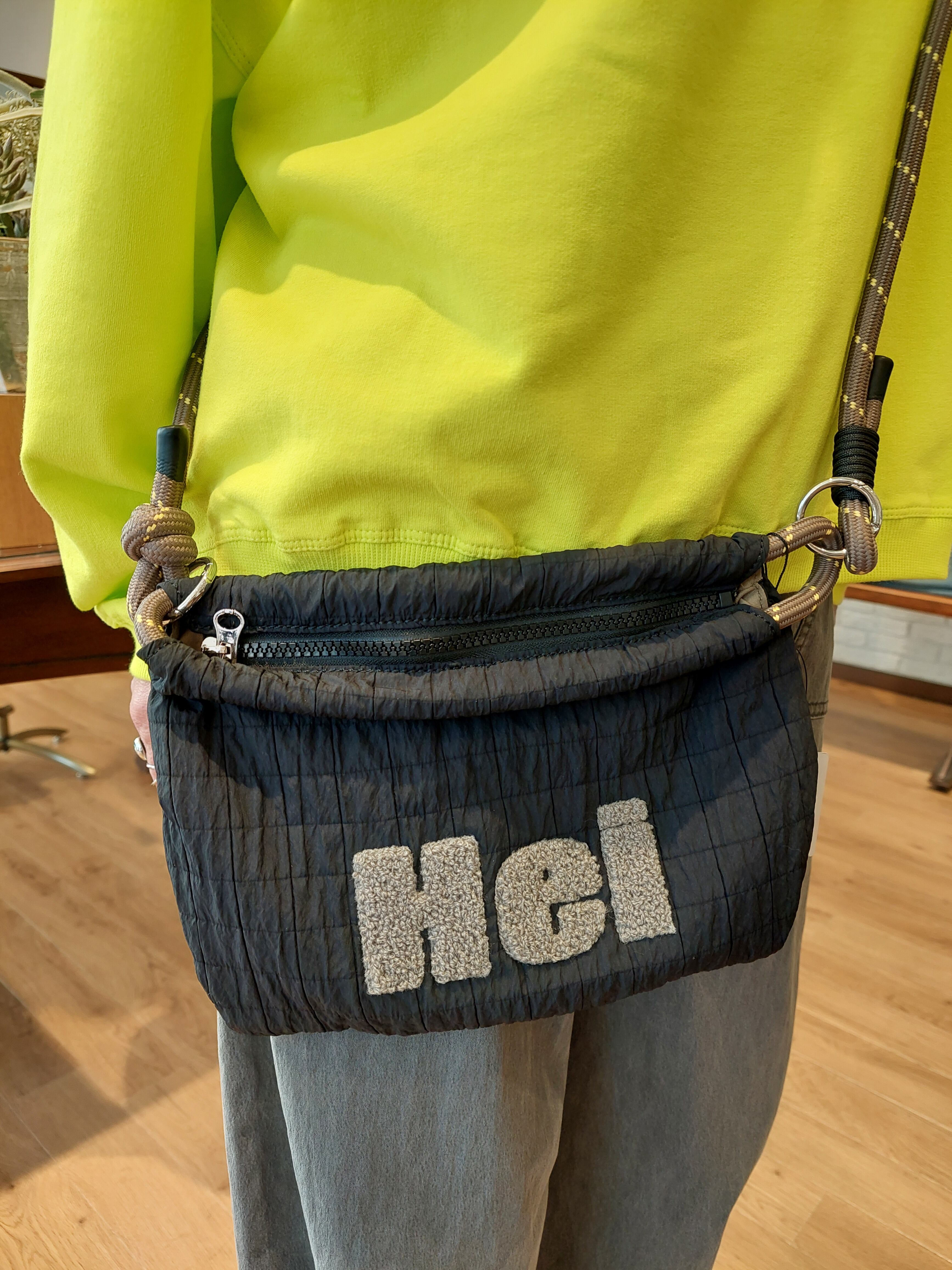 フロントに施された大胆な「Hei」という刺繍が、コーディネートに遊び心を添えてくれるトートバッグ。立体的なパイル刺繍(サガラ刺繍)のような質感が、シンプルなデティールに奥行きと温かみのある表情をプラスします。デイリーに必要な荷物がしっかり収まる、大きすぎず小さすぎない使いやすいサイズ**感も魅力。サブバッグとしてはもちろん、メインバッグとしても着こなしのアクセントになる、毎日連れ出したくなるような一点です。