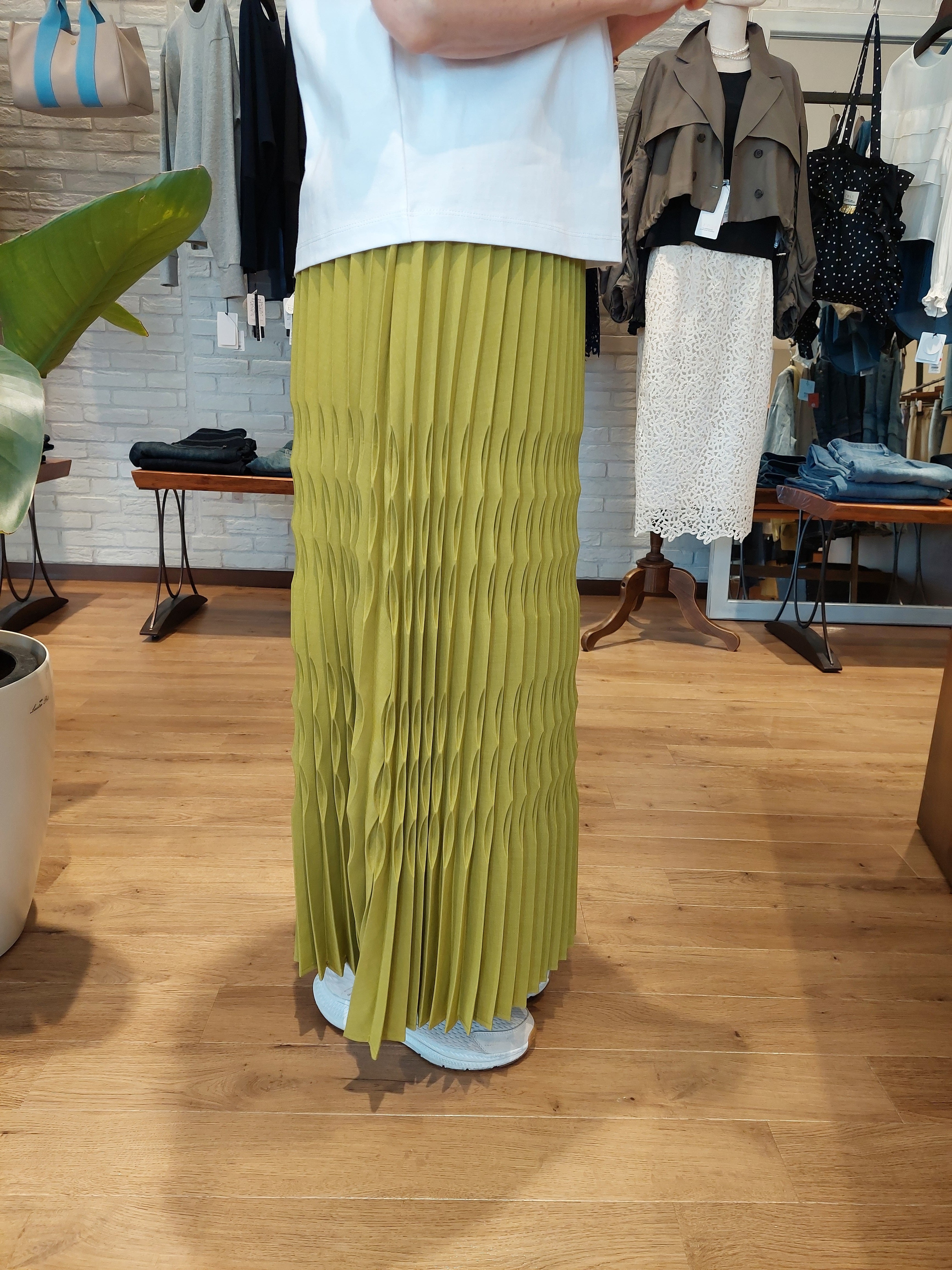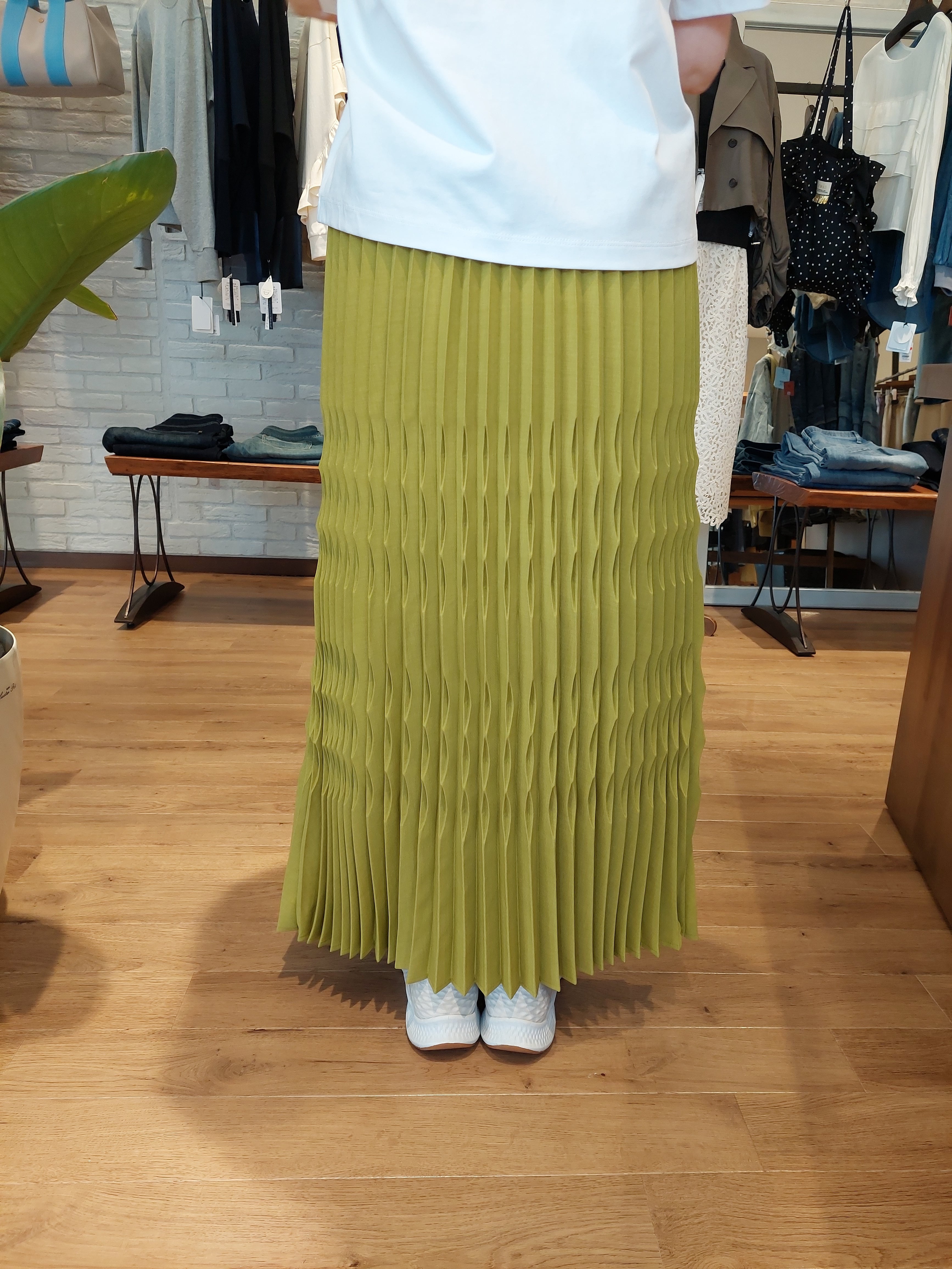裾に向かって段々とプリーツ加工が切り替わる、テクニカルで表情豊かなロングスカート。ウエスト周りはすっきりと、裾にかけては細かなプリーツから柔らかな広がりへと変化させることで、腰回りをスマートに見せつつ華やかなボリュームを演出します。歩くたびにドラマチックな動きが出るシルエットは、シンプルなトップスと合わせるだけで洗練された装いに。安心の裏地付きなので透け感を気にせず、さらりと一枚で春夏の軽快なお出かけを楽しめる主役級のボトムスです。