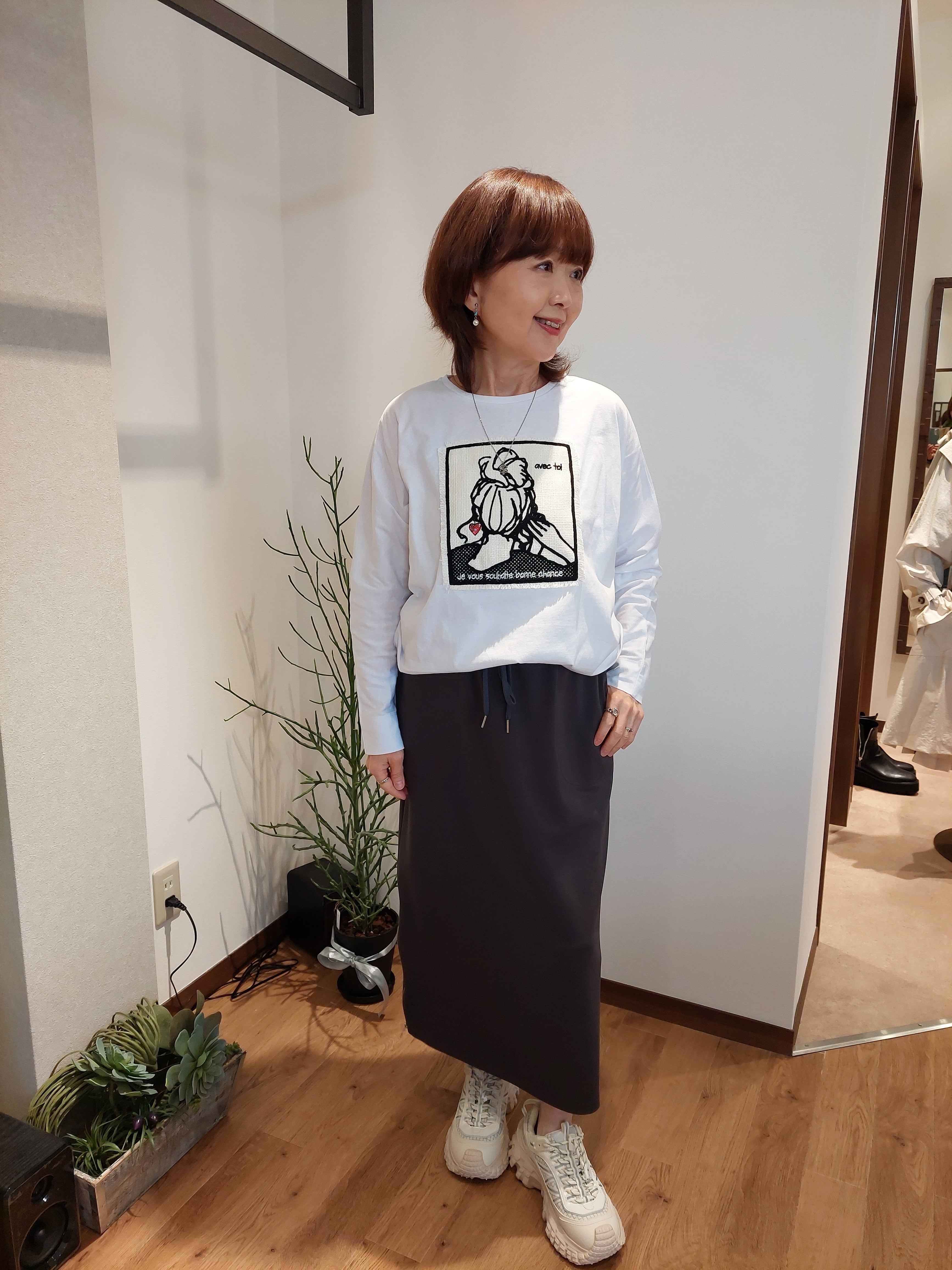 フロントに施されたキャッチーな女の子デザインの刺繍が、大人のカジュアルスタイルにチャーミングなアクセントを添えるプルオーバー。ゆったりとしたドルマンスリーブが二の腕周りを自然にカバーし、リラックス感漂う女性らしいニュアンスを演出します。さらに、裾タック(脇タック)を施すことで、着るだけで立体的なコクーンシルエットが完成。インしなくてもウエスト周りがすっきりまとまり、細身のパンツからボリュームスカートまで、合わせるボトムスを選ばずこなれ感たっぷりに決まる一着です。