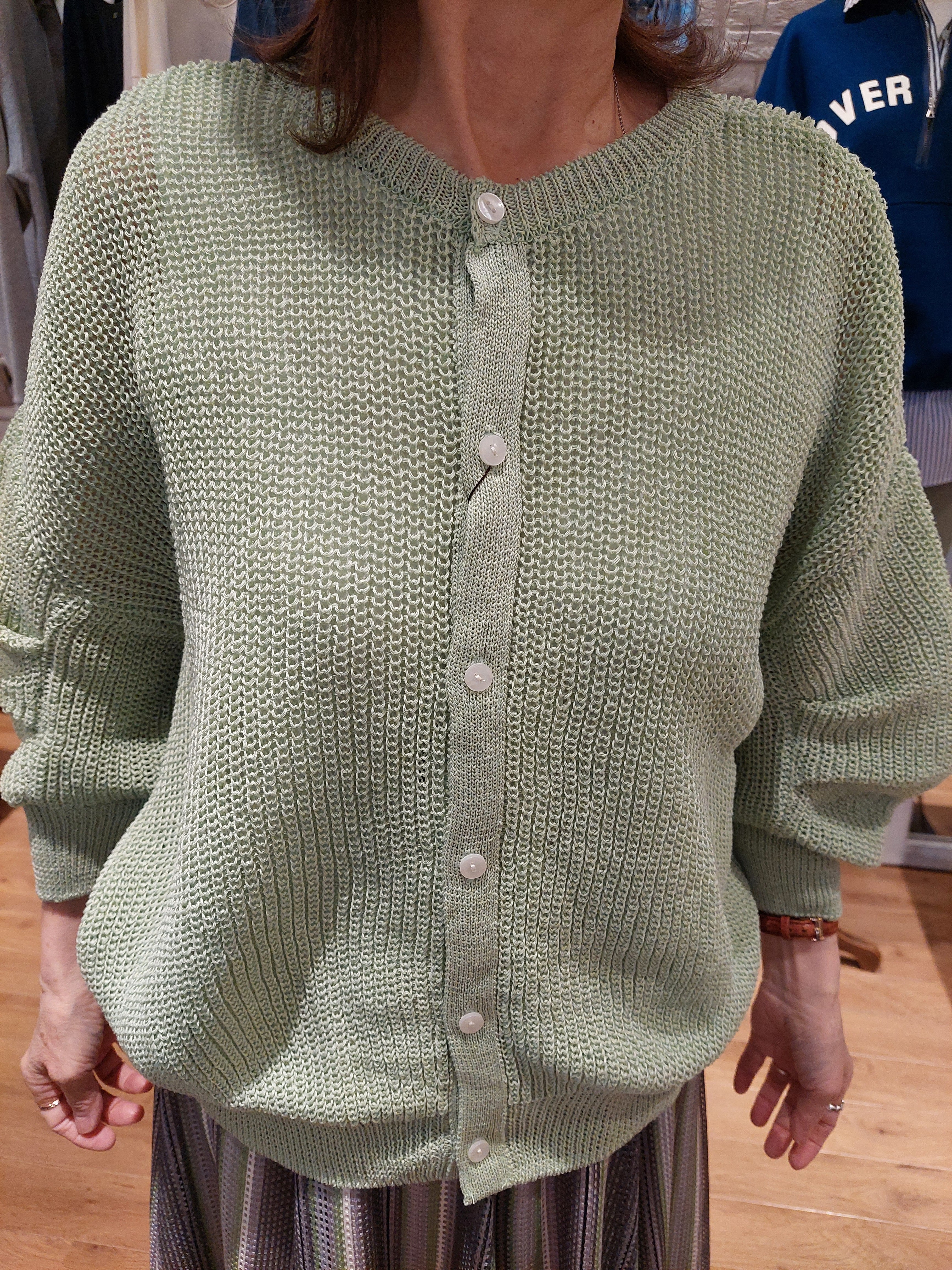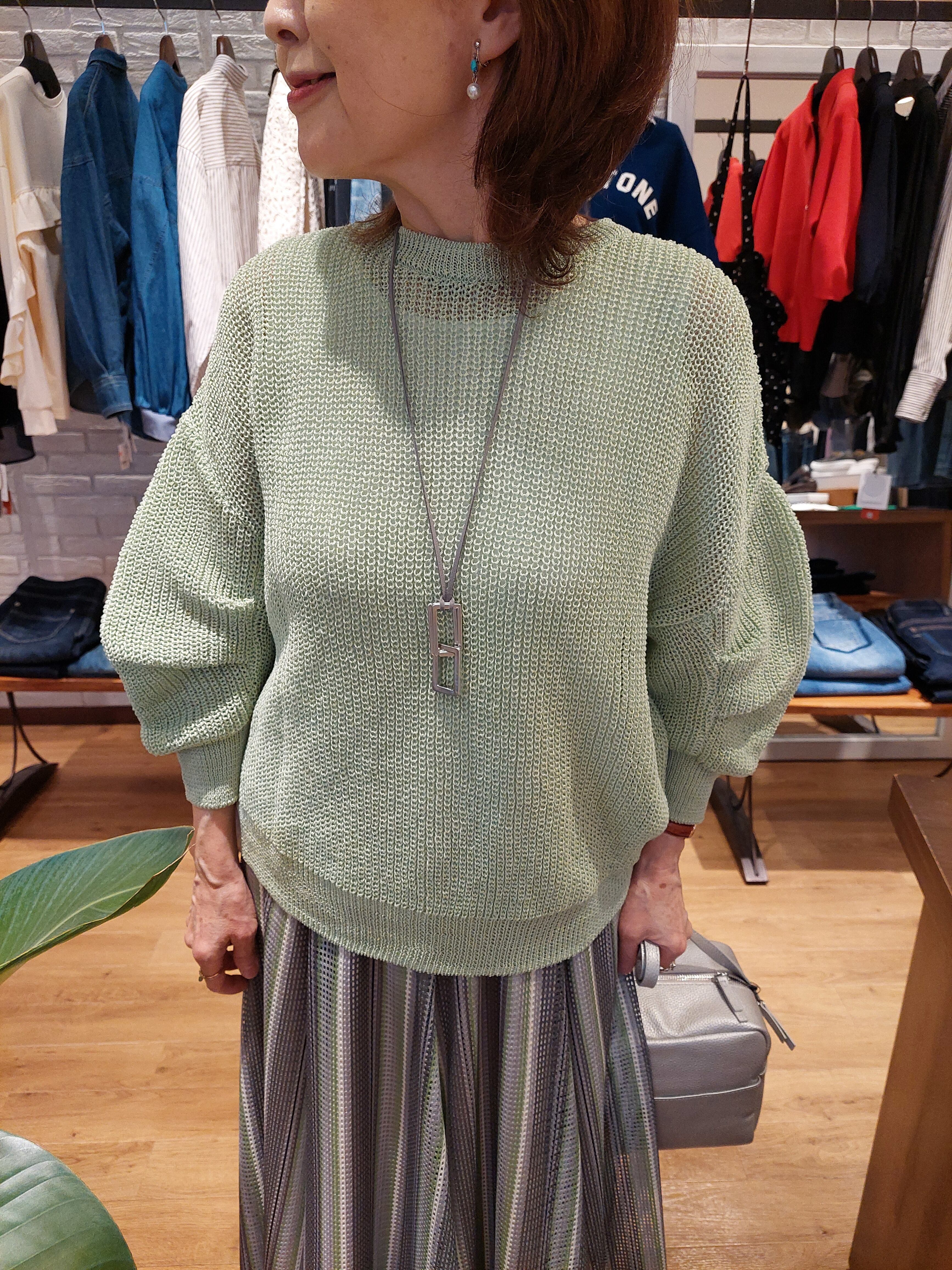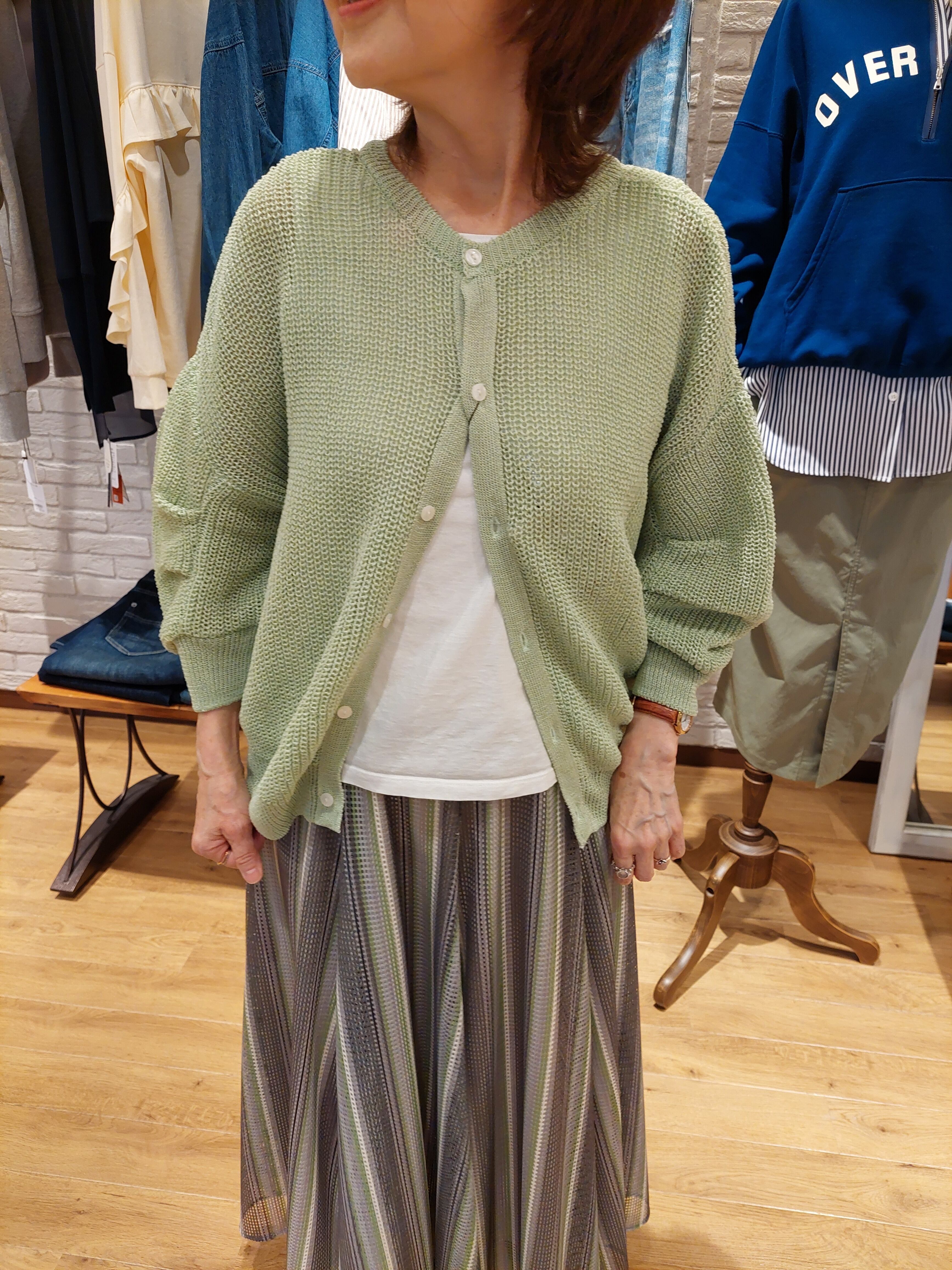 クルーネック側はシンプルでベーシックな印象に、ボタン側を前にすると羽織り感覚でも着用でき、スタイリングの幅が広がります。袖には自然な丸みを持たせ、女性らしい柔らかさを演出しながら、全体はすっきりとまとまるシルエットに仕上げています。