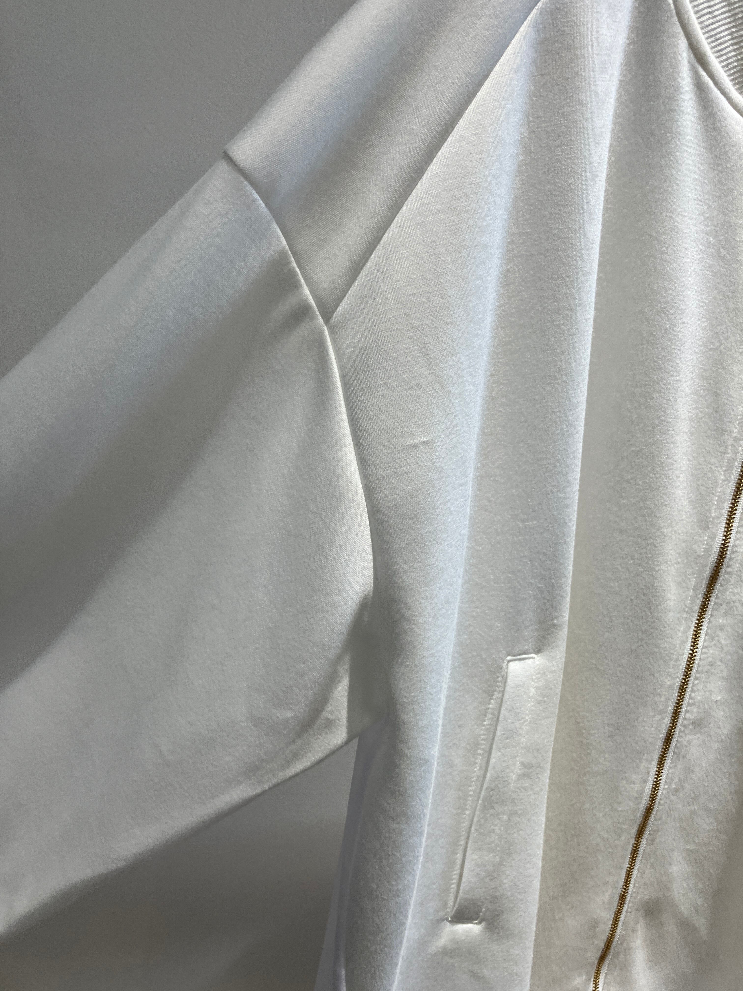 ミリタリーの定番であるMA-1を、洗練されたロング丈で現代的にアップデート。身頃には滑らかな肌触りと程よいハリ感が魅力のダンボール素材を使用し、カジュアルな中にもクリーンで都会的な印象をプラスしました。最大のこだわりは、袖や裏部分に布帛のような素材を組み合わせた異素材ドッキングのデザイン。動くたびに異なるテクスチャーが表情を変え、さらりと羽織るだけで奥行きのあるレイヤードスタイルが完成します。お尻周りをすっぽりとカバーする丈感は、細身のパンツからボリュームのあるスカートまでバランス良く決まり、季節の変わり目のメインアウターとして重宝する一着です。