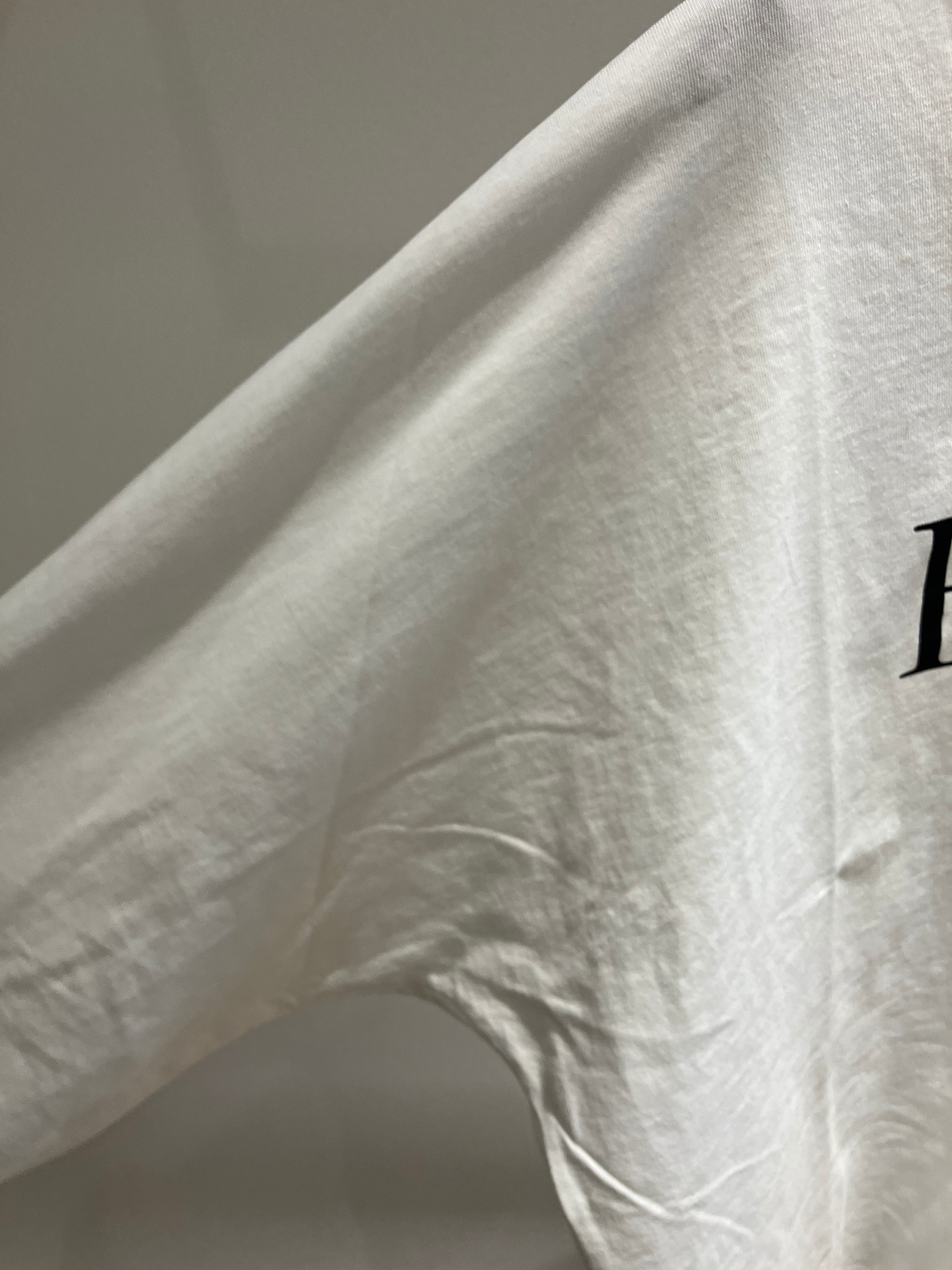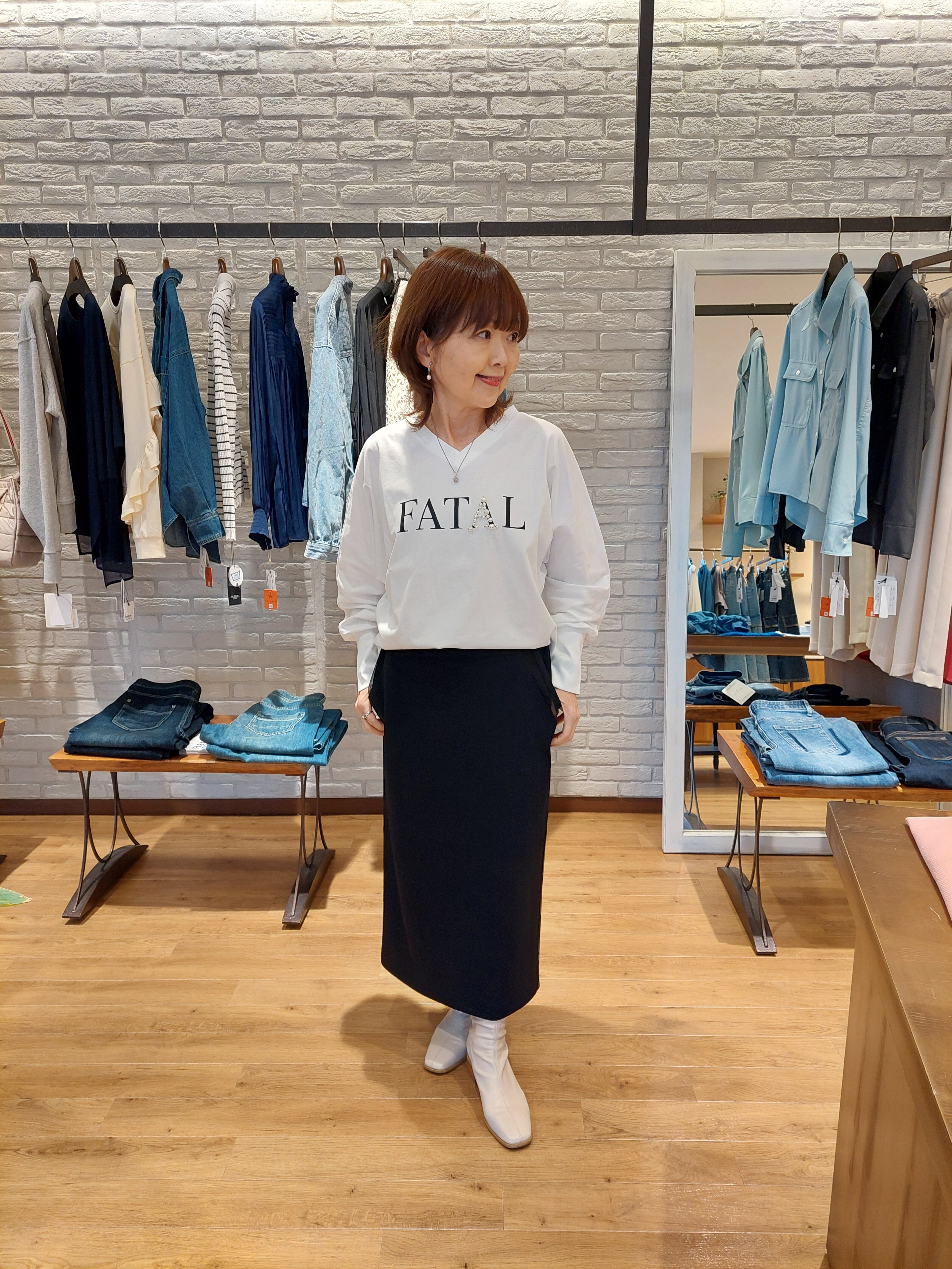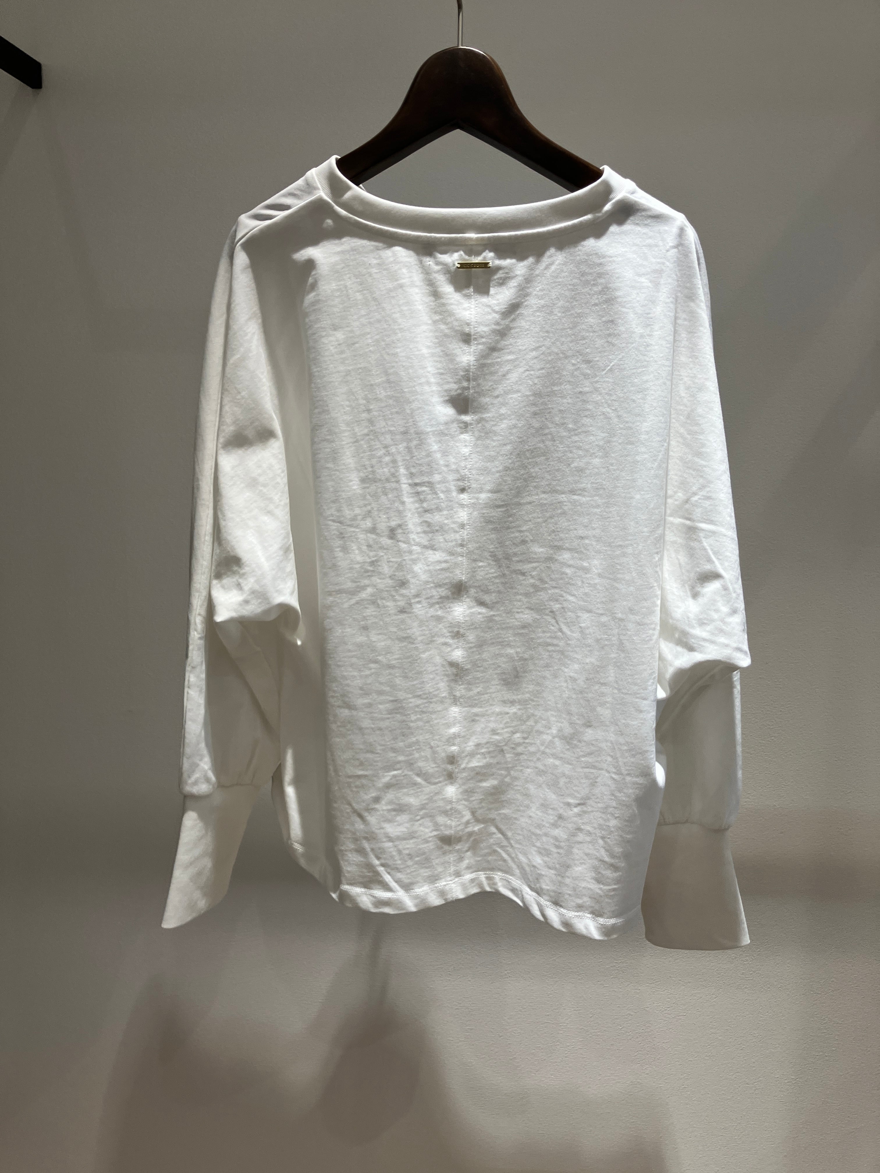 カジュアルなロンTをリュクスに格上げ。フロントにあしらわれた上品なパールロゴが、アクセントになっています。体型を拾わないゆったりとしたドルマンシルエットで、デニムに合わせるだけで大人の遊び心あるキレイめスタイルが完成します。