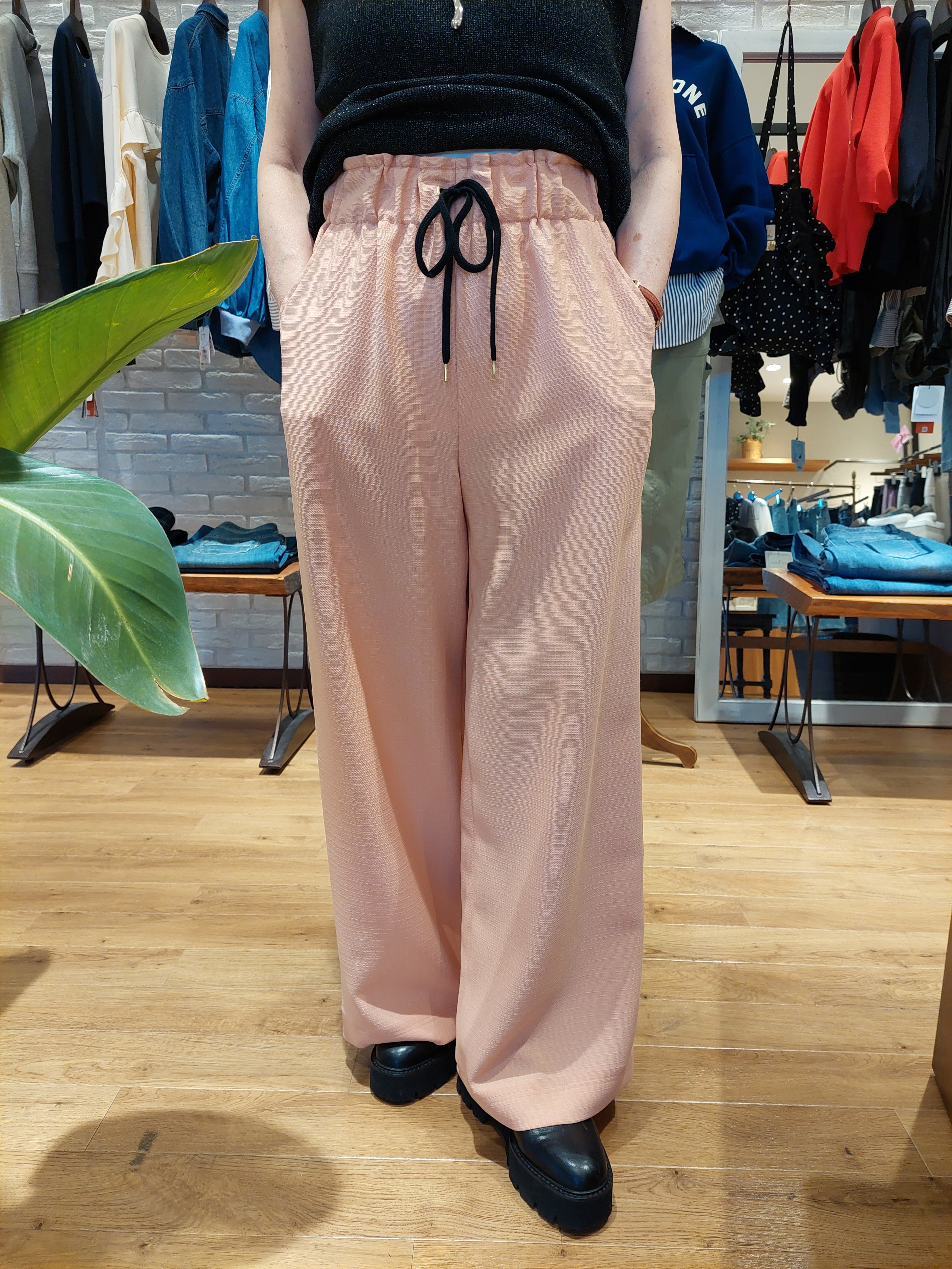 広めのワイドシルエットで、ゆったりとした落ち感のあるラインで大人っぽく仕上げています。ウエストはリラックス感のある仕様で、デイリーに着用しやすいのもポイントです。