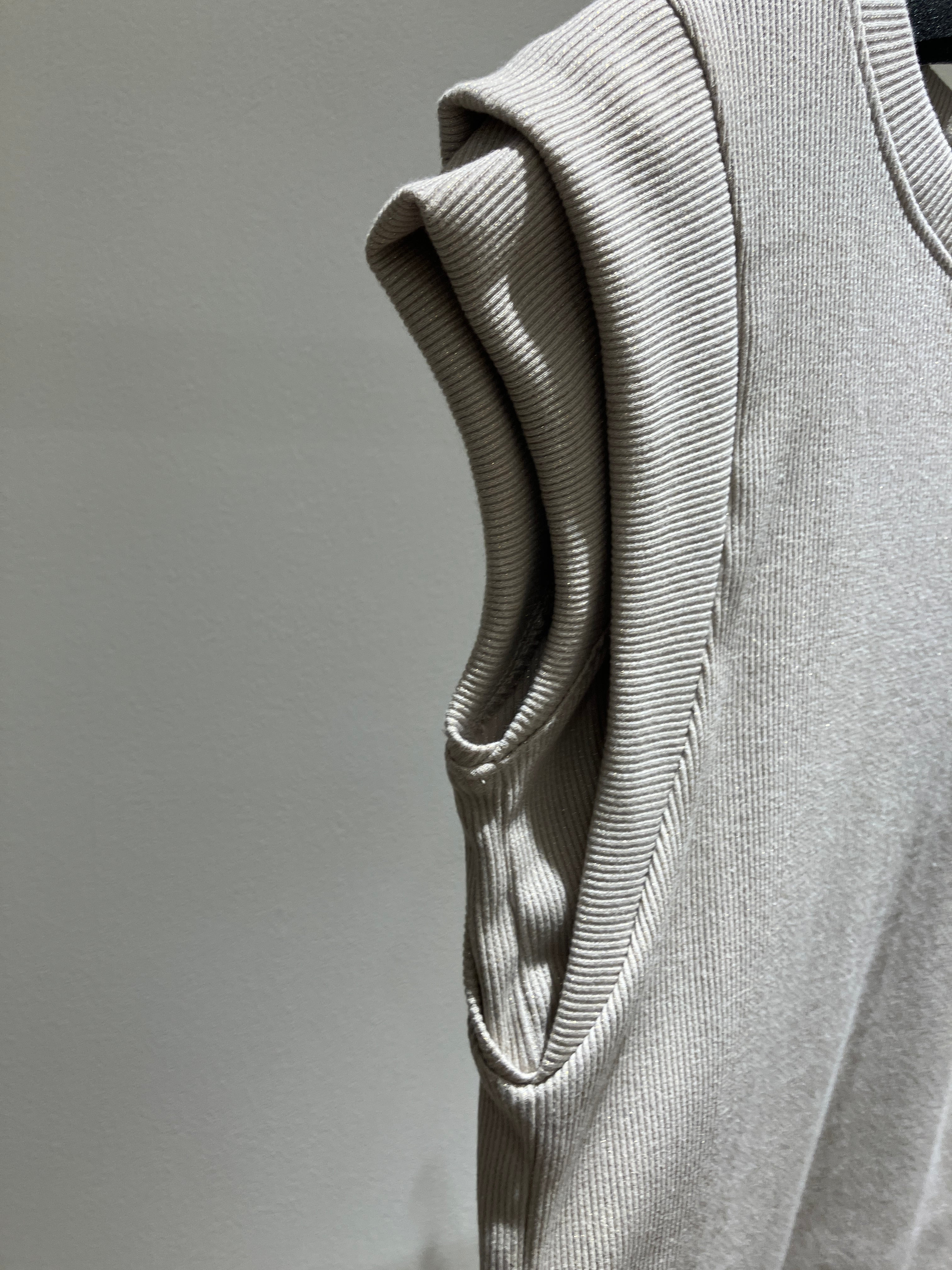 繊細な輝きを放つきらりと光るラメを織り込み、お顔まわりをパッと華やかに演出するノースリーブプルオーバー。上品な光沢感がカジュアルさを抑え、大人のデイリースタイルに洗練されたニュアンスをプラスします。こだわりの袖部分が二重になったデザインは、肩のラインをさりげなくカバーしつつ、立体的なフォルムで二の腕をすっきりと見せてくれる嬉しい効果も。身体に程よくフィットするコンパクトなシルエットなので、一枚着としてはもちろん、ジャケットやカーディガンのインナーとしてももたつかず、オンオフ問わず幅広いシーンで重宝する一着です。