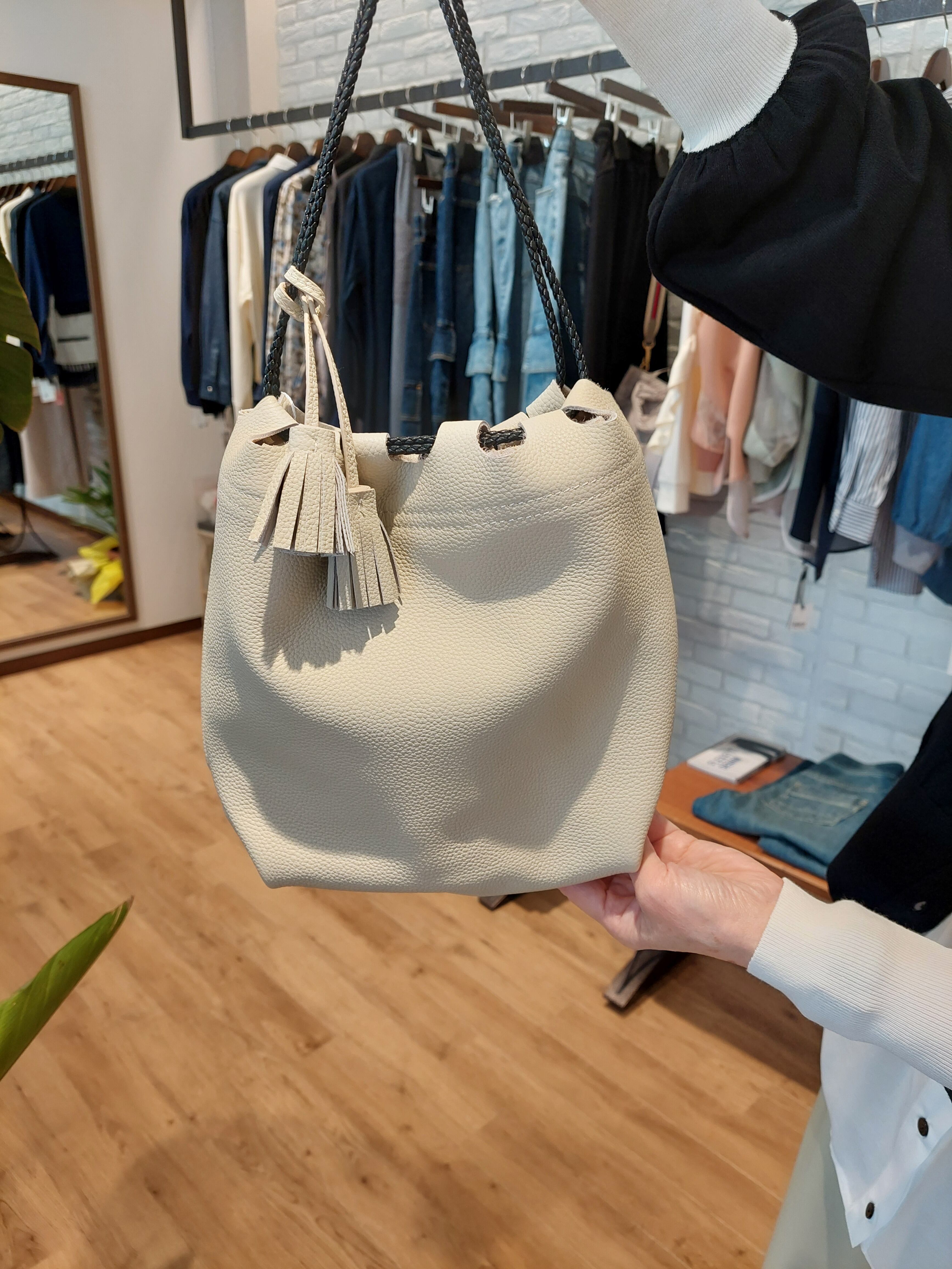 コロンとした丸みのあるフォルムが愛らしい、本革を使用した巾着型のレザーバッグ。シボ感のある上質なレザーが、持つだけでコーディネートに洗練された大人のクラス感をプラスします。開口部は紐でキュッと絞るタイプで、物の出し入れがスムーズなのも嬉しいポイント。サイドに施されたタッセル(フリンジ付き)のデザインが、歩くたびに揺れてアクセントになり、遊び心を添えます。デイリーなお出かけから、少しきれいめなスタイルまで幅広く活躍する、機能性とデザイン性を兼ね備えた優秀なアイテムです。