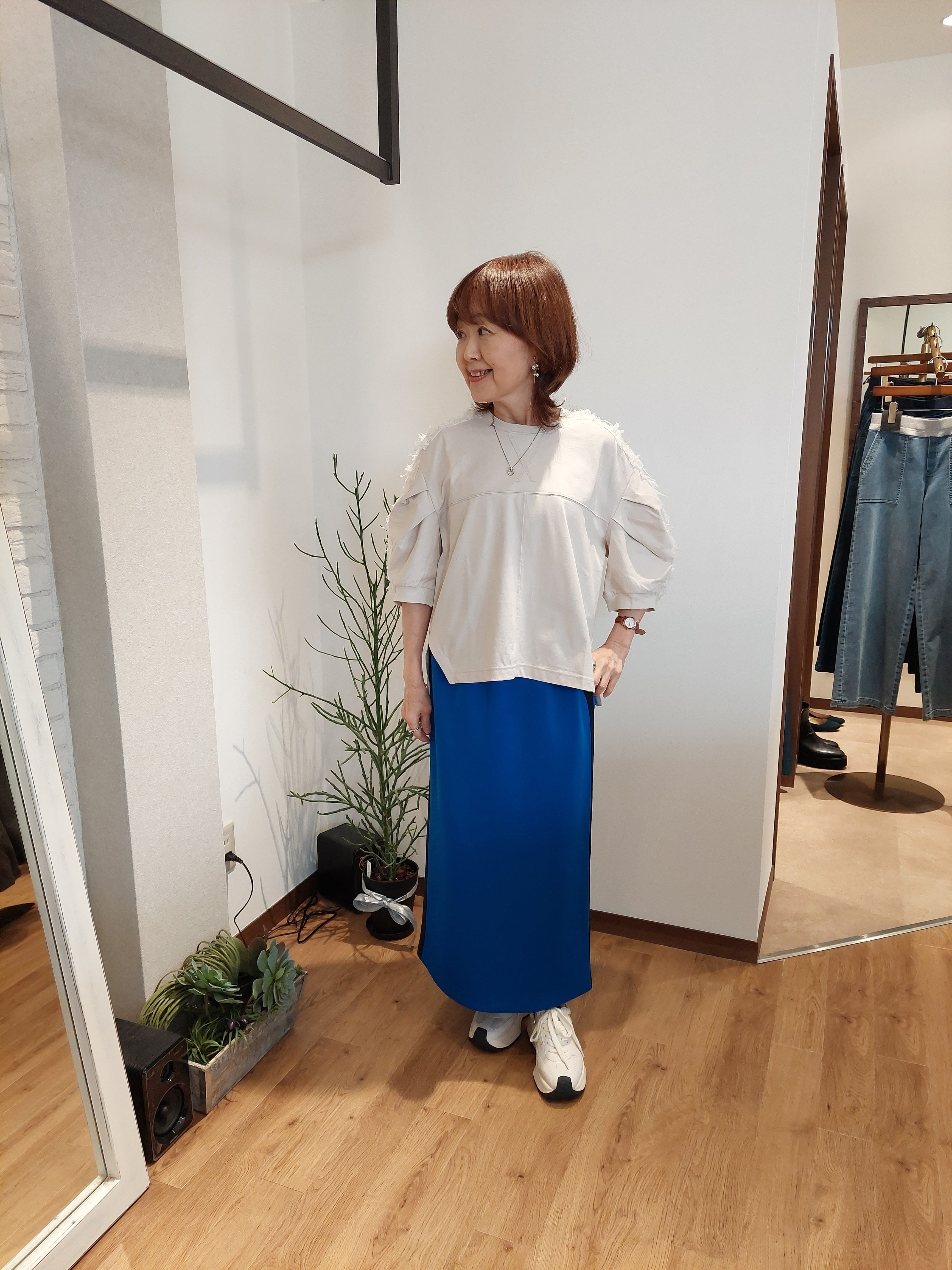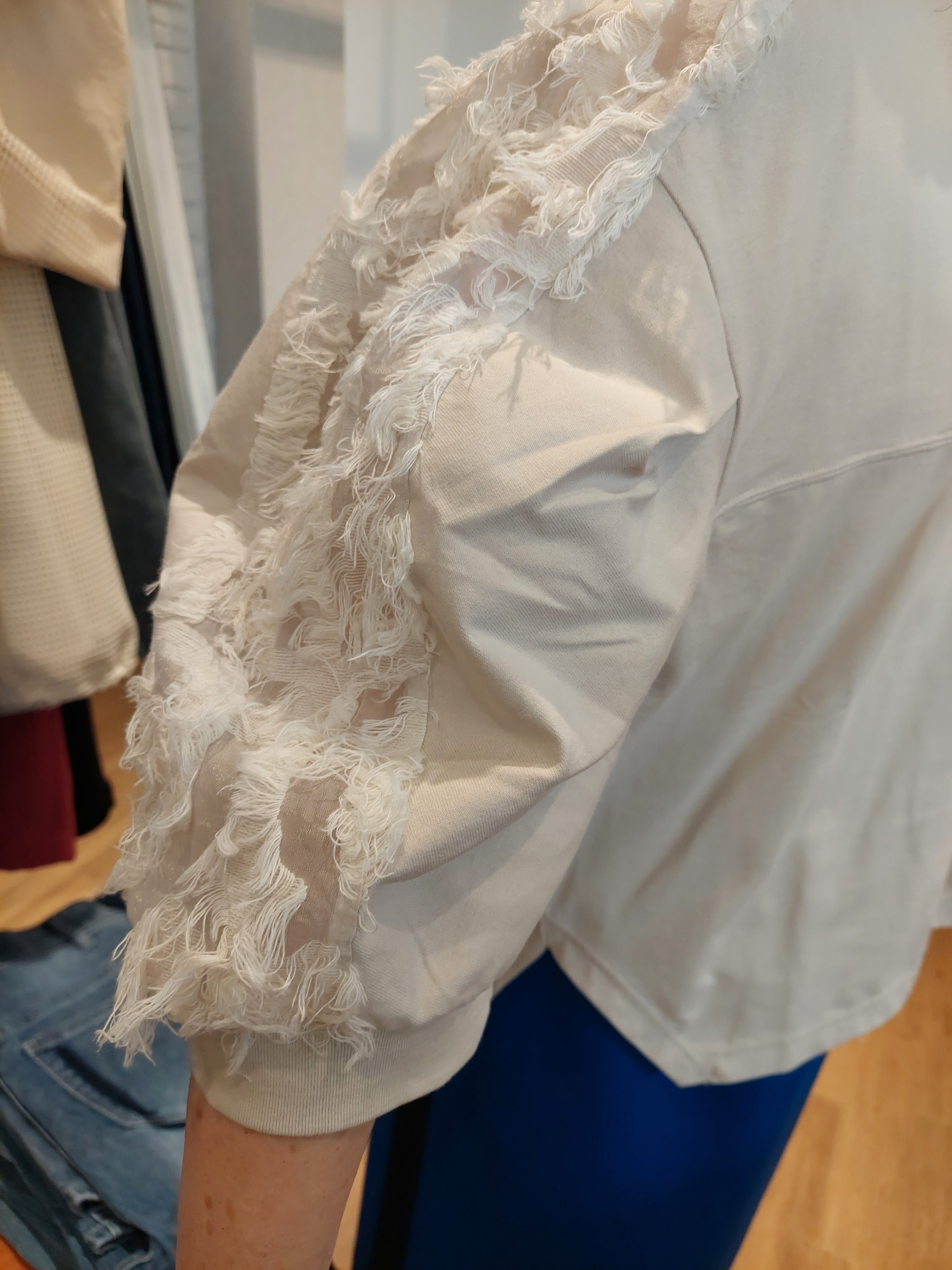 立体感のあるフリンジジャガードを袖にあしらったプルオーバー。身頃にはマーセライズ天竺生地を使用し、袖の表情豊かな素材とのコントラストが印象的な一枚に仕上げています。程よく開いたVネックが顔まわりをすっきりと見せ、女性らしい抜け感を演出。存在感があり、スタイリングにさりげないアクセントを添えてくれます。